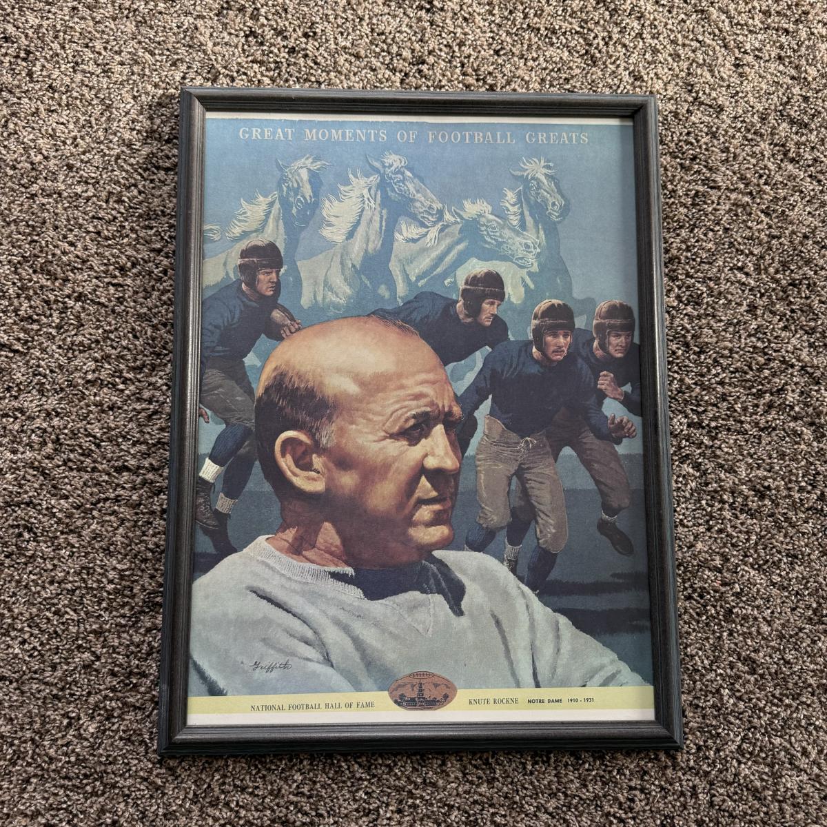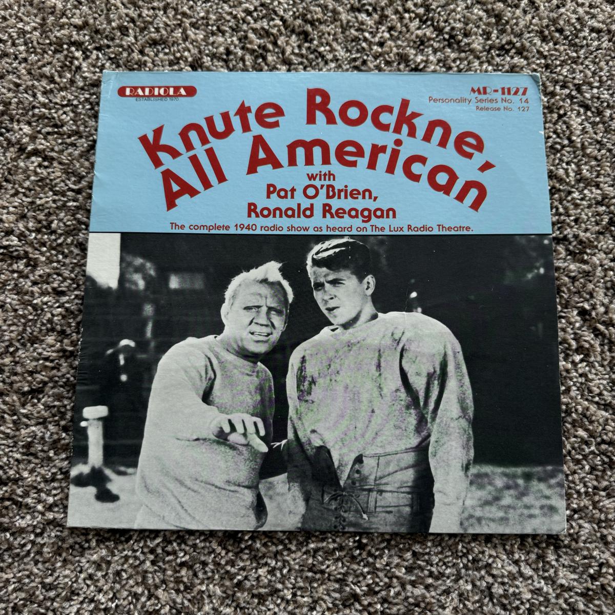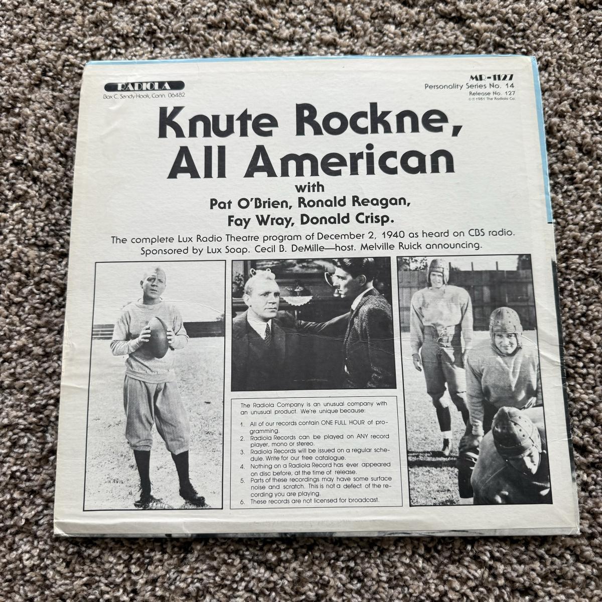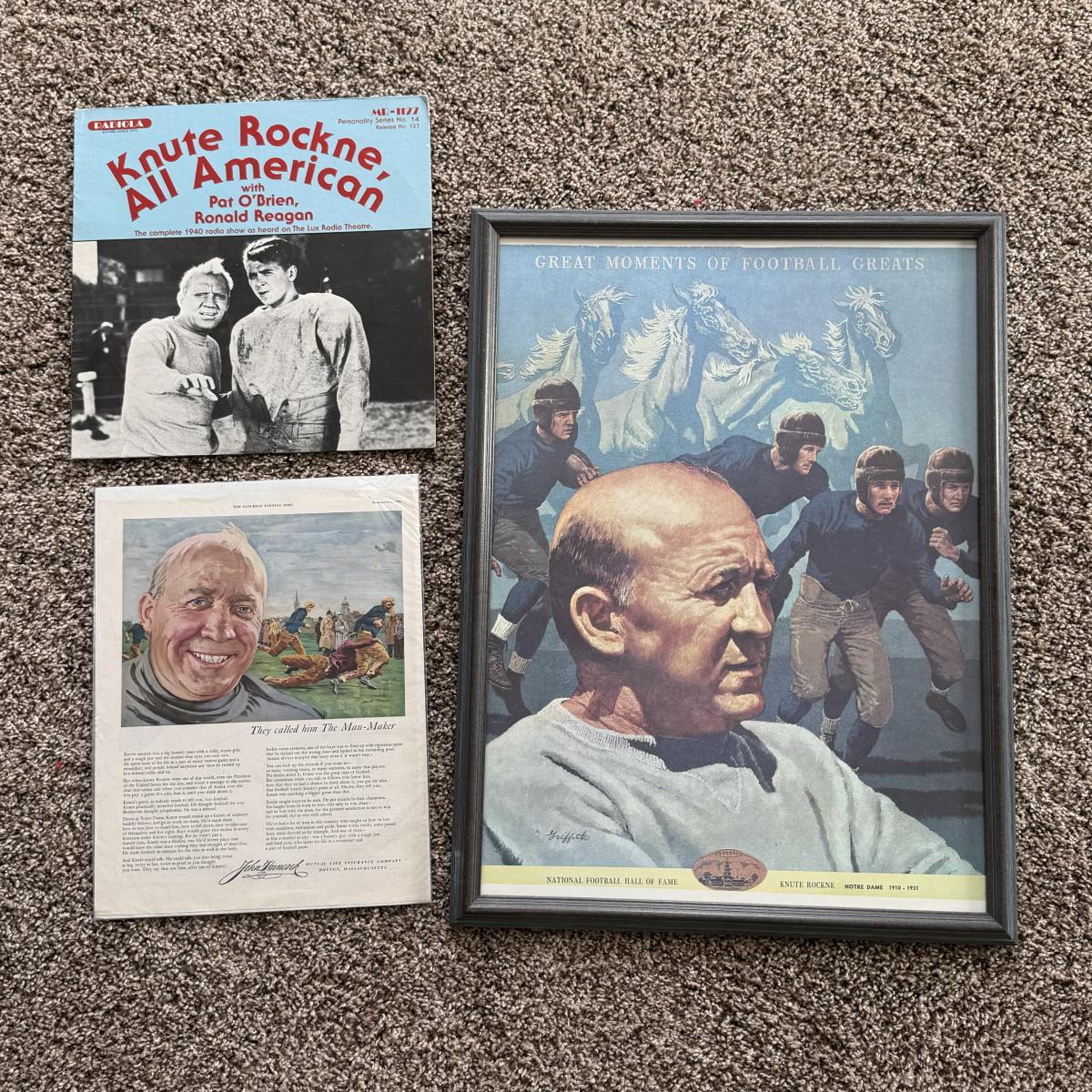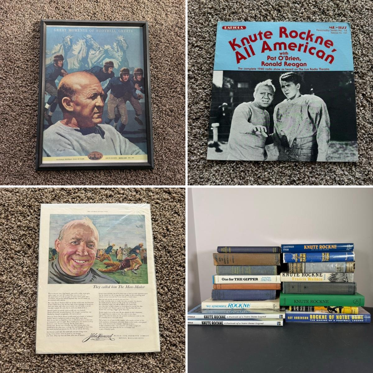 LOT 98G: Knute Rockne Notre Dame Collection - Record of 1940 All American Radio Show w/ Ronald Reagan, Framed "Great Moments of Football Greats" Poster, Books by & about Rockne & More