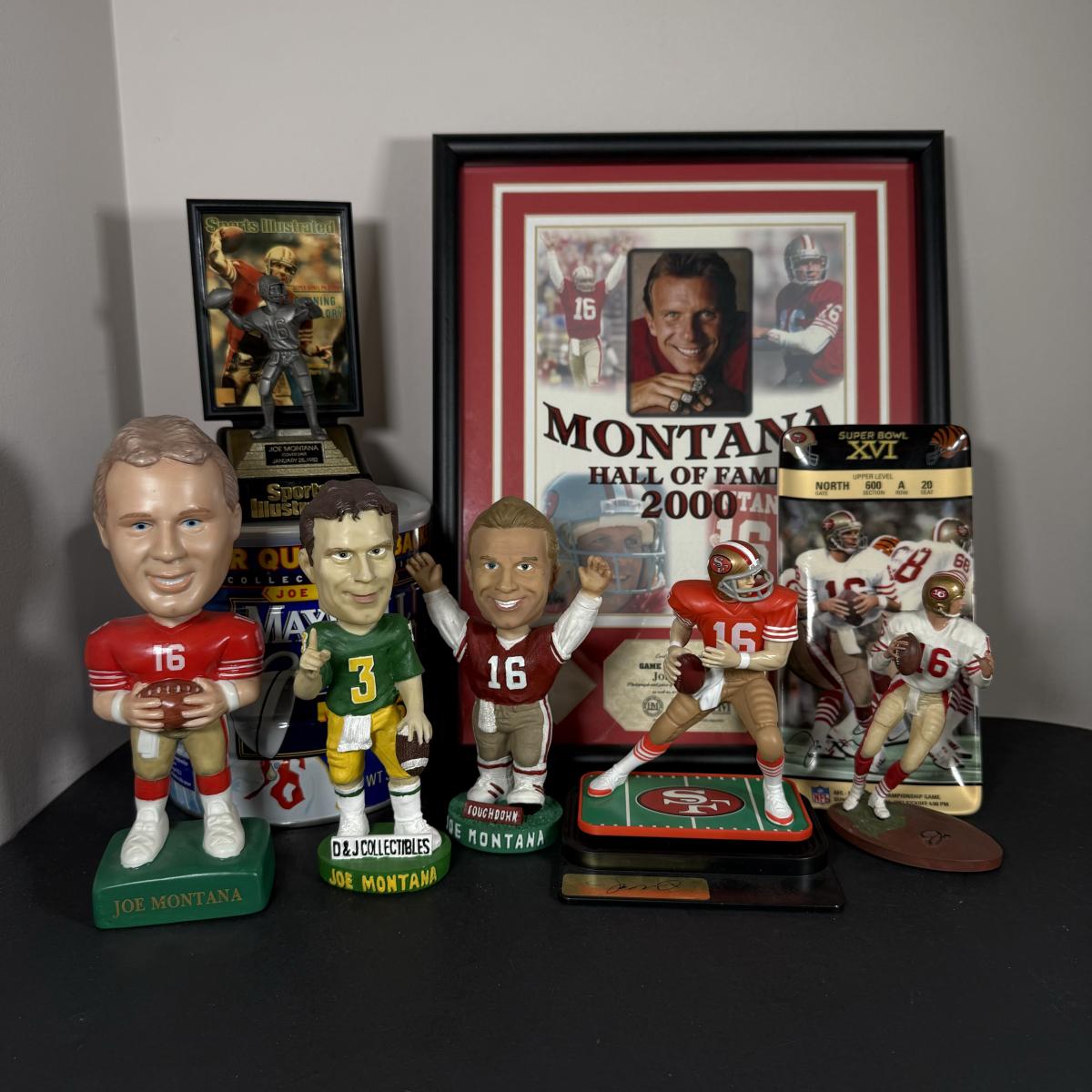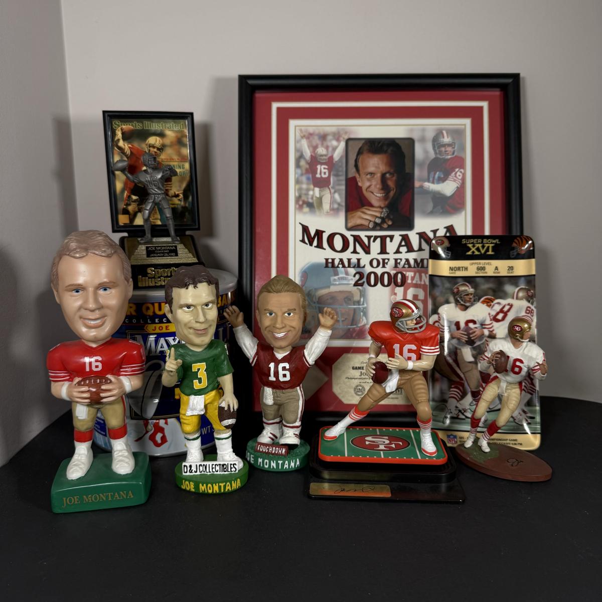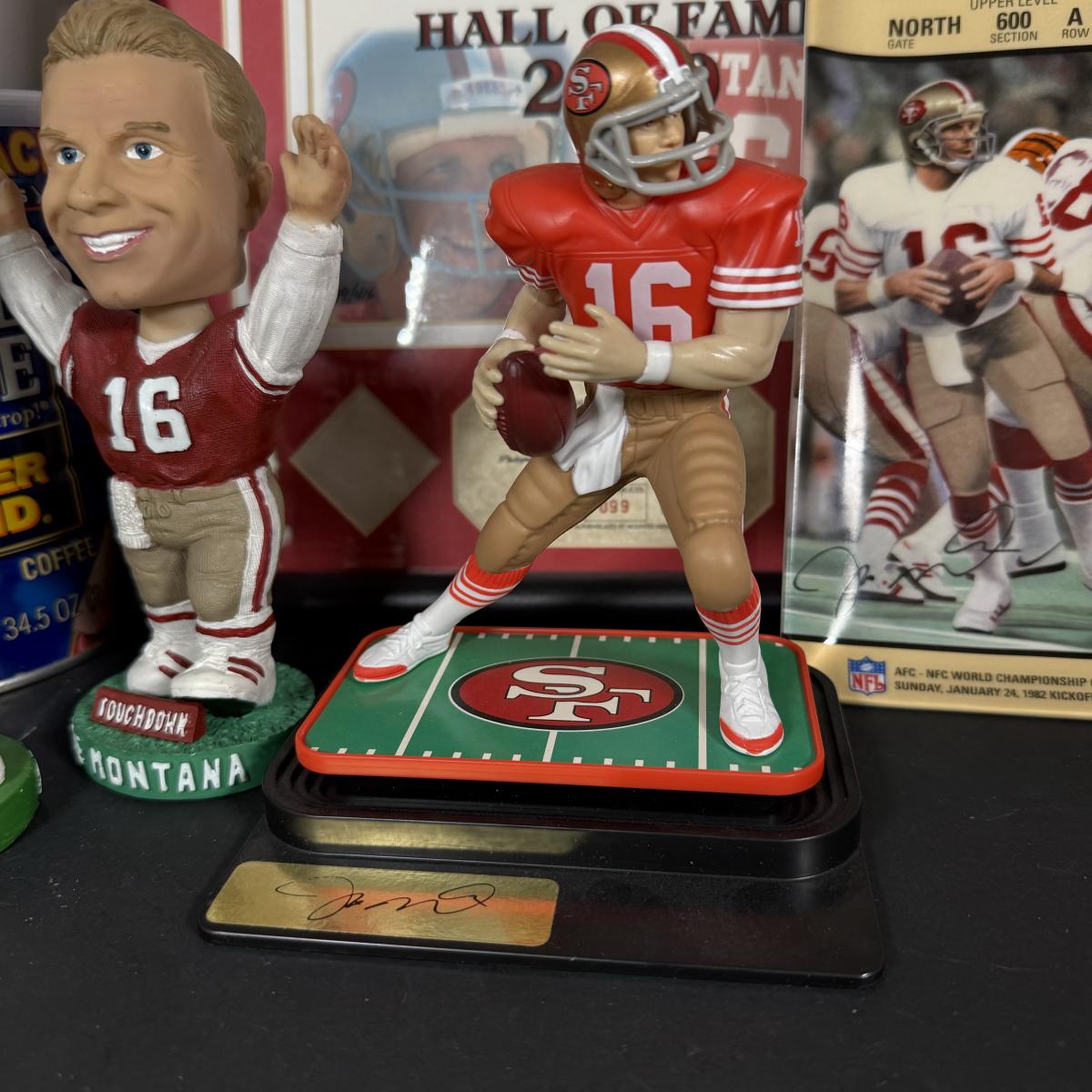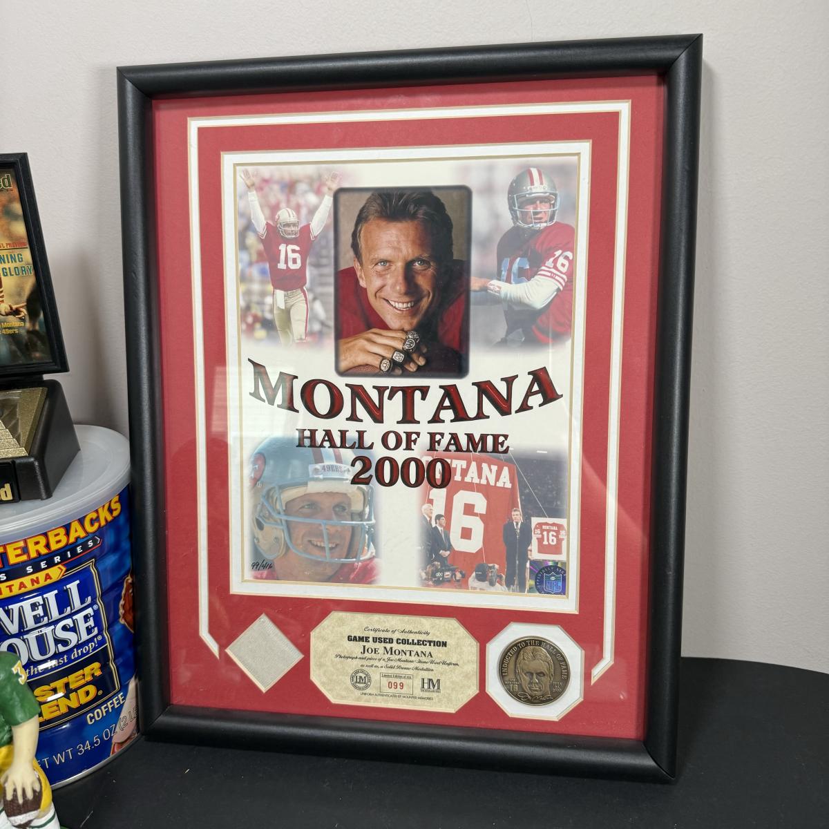 LOT 99G: Joe Montana Memorabilia - Highland Mint Framed Hall of Fame Photo, Coin & COA, Maxwell House Star Quarterbacks Can (unopened), Sports Illustrated Figure, Bobble Heads & More