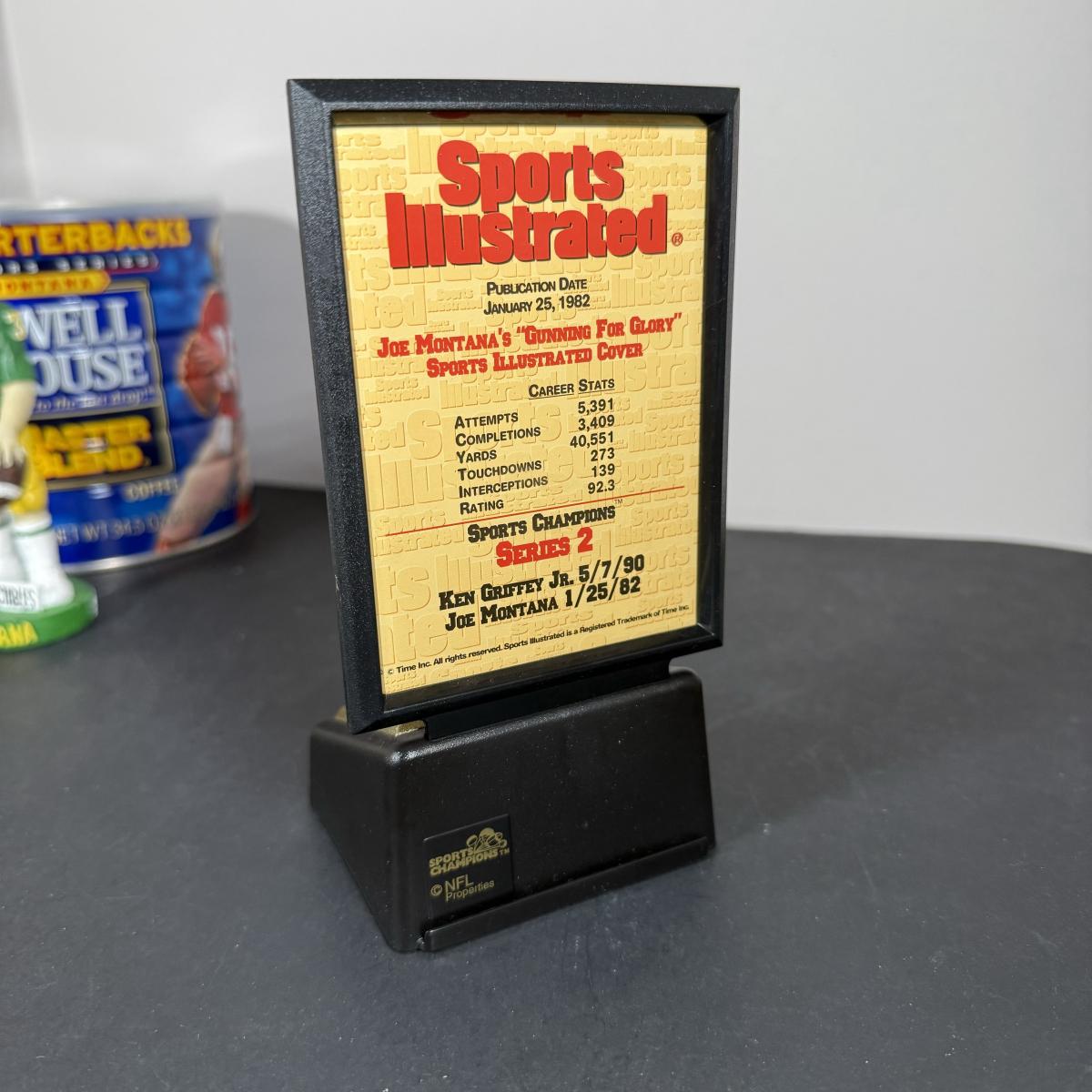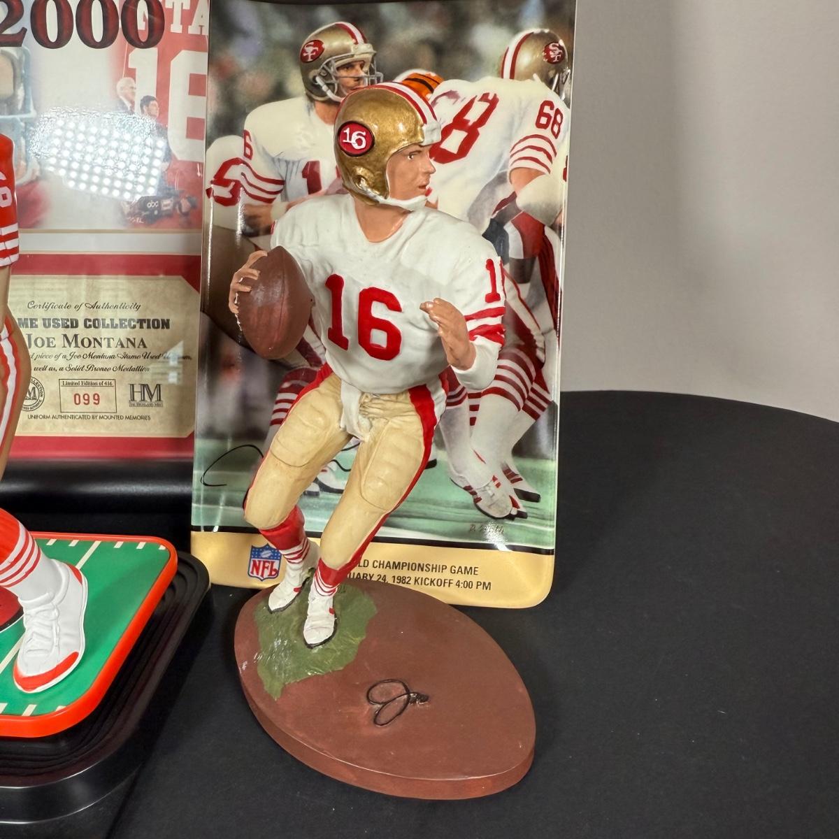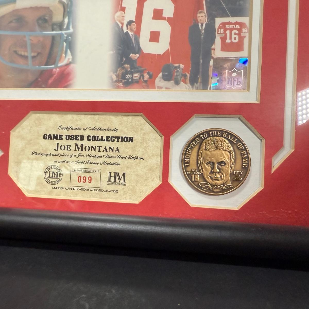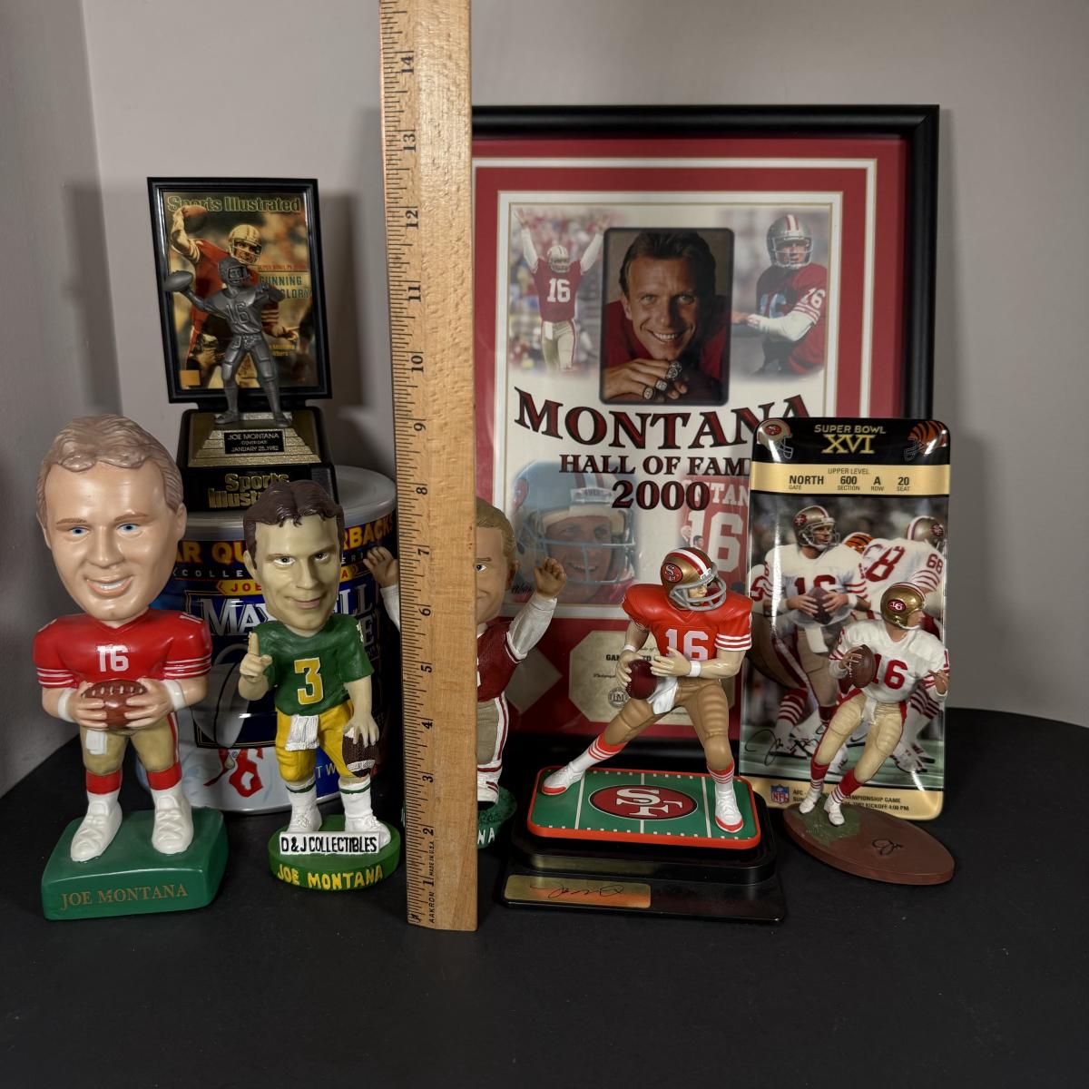 LOT 99G: Joe Montana Memorabilia - Highland Mint Framed Hall of Fame Photo, Coin & COA, Maxwell House Star Quarterbacks Can (unopened), Sports Illustrated Figure, Bobble Heads & More