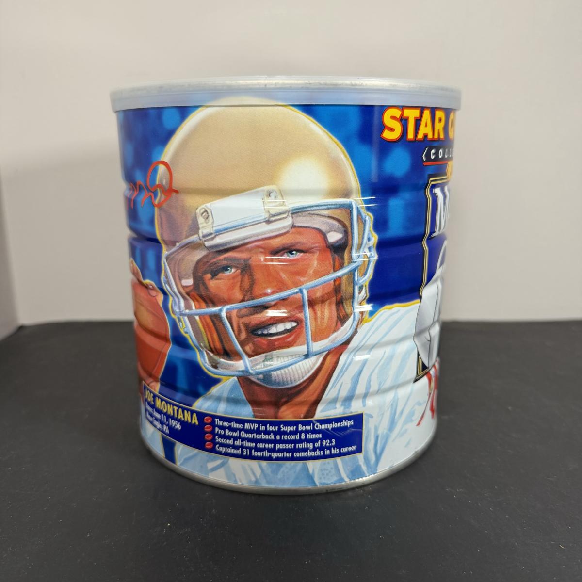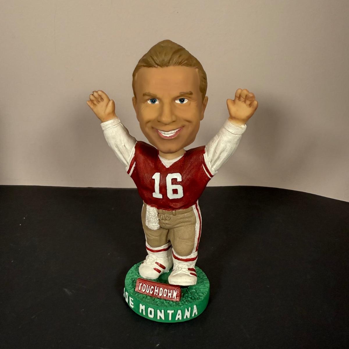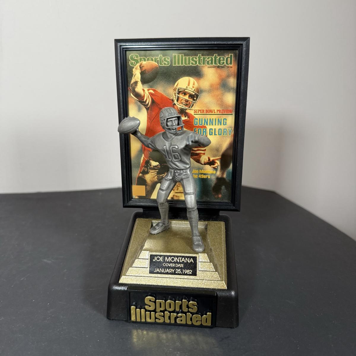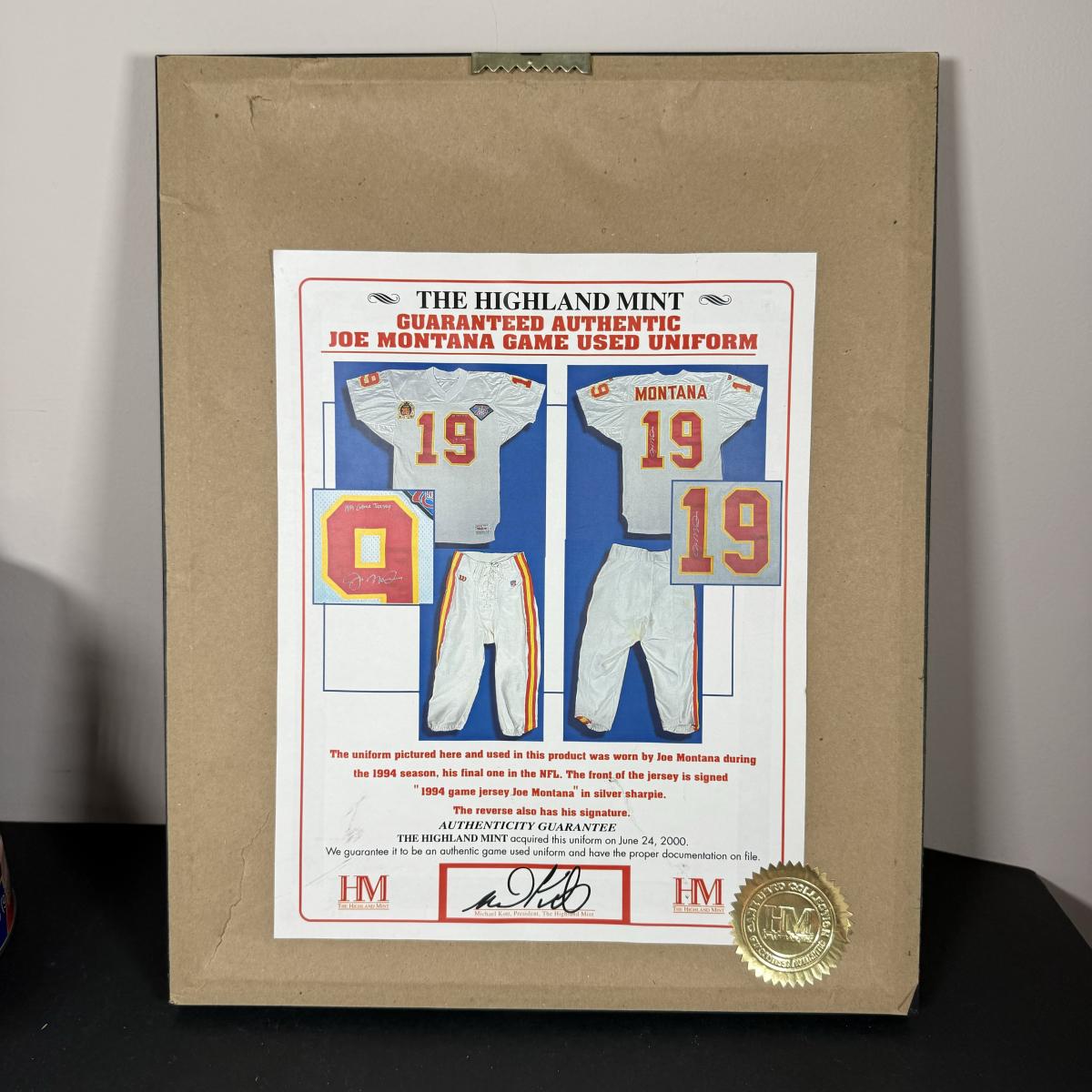 LOT 99G: Joe Montana Memorabilia - Highland Mint Framed Hall of Fame Photo, Coin & COA, Maxwell House Star Quarterbacks Can (unopened), Sports Illustrated Figure, Bobble Heads & More