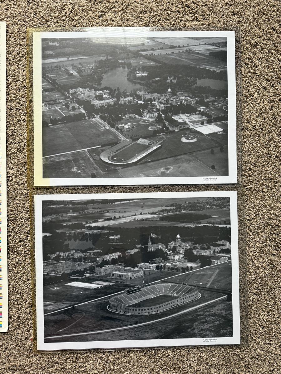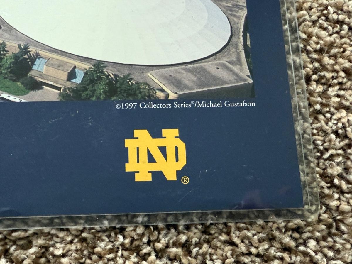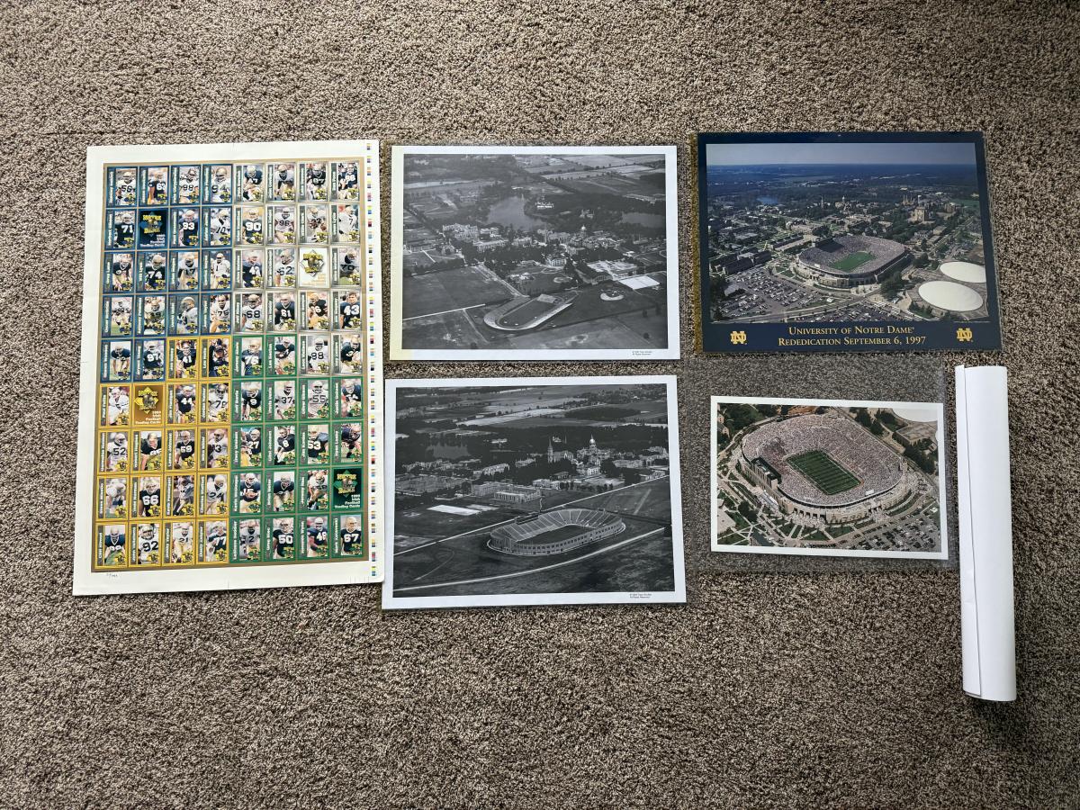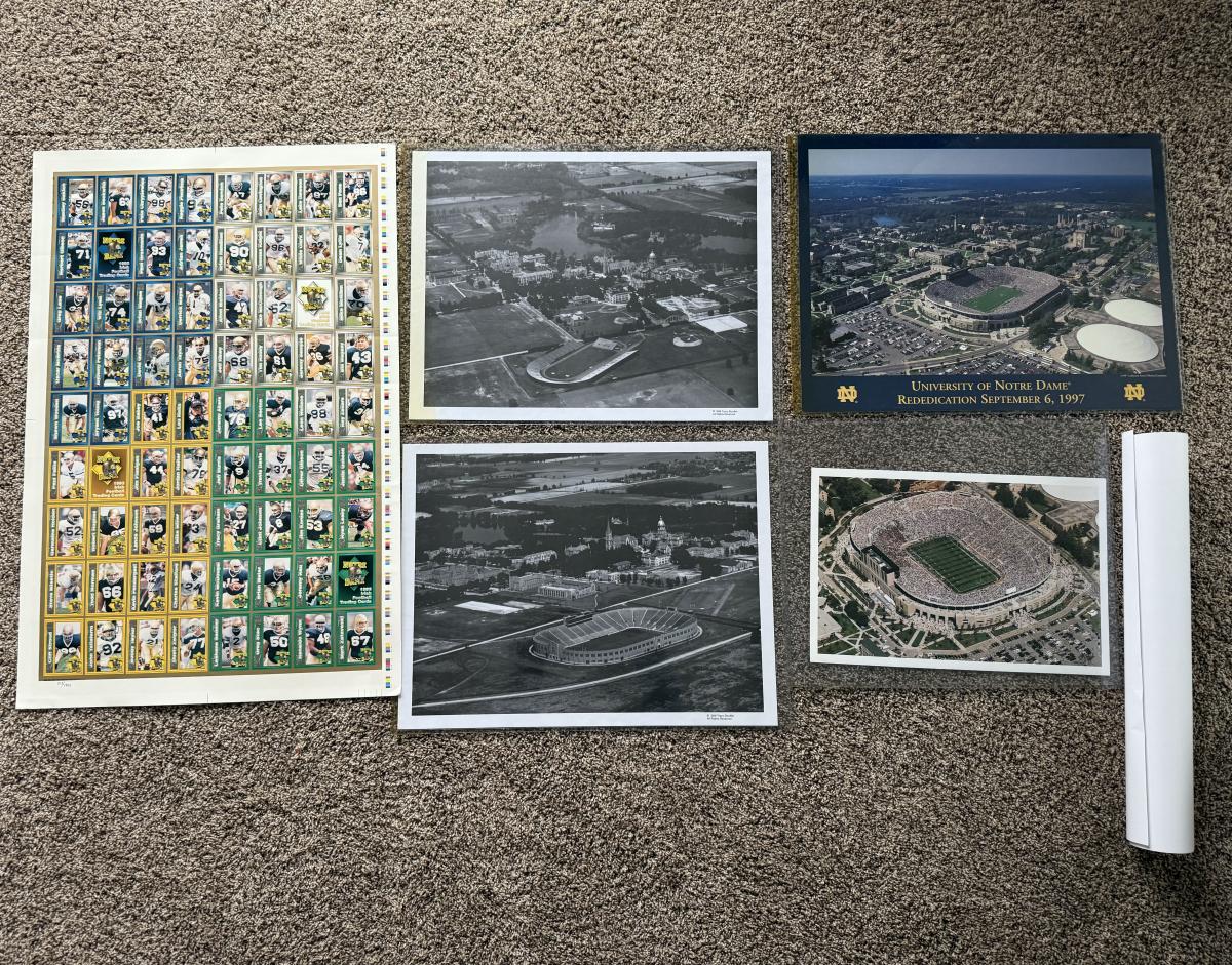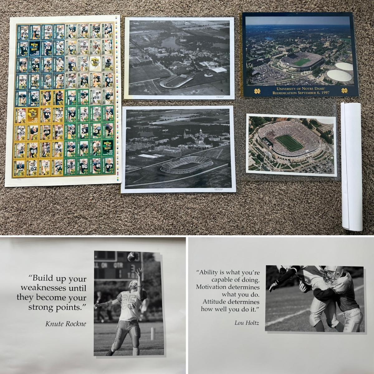 LOT 111G: Notre Dame Memorabilia Collection - Football Card Poster #313/1993, 1996 Tracy Stouffer Campus Photos, Signed & Numbered Stadium Photo 105/1000 & Knute Rockne Quote Posters