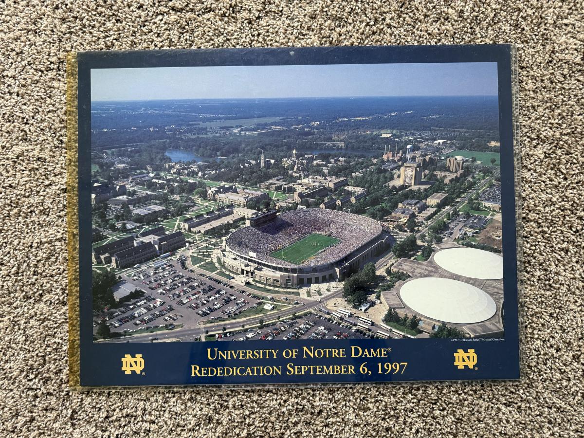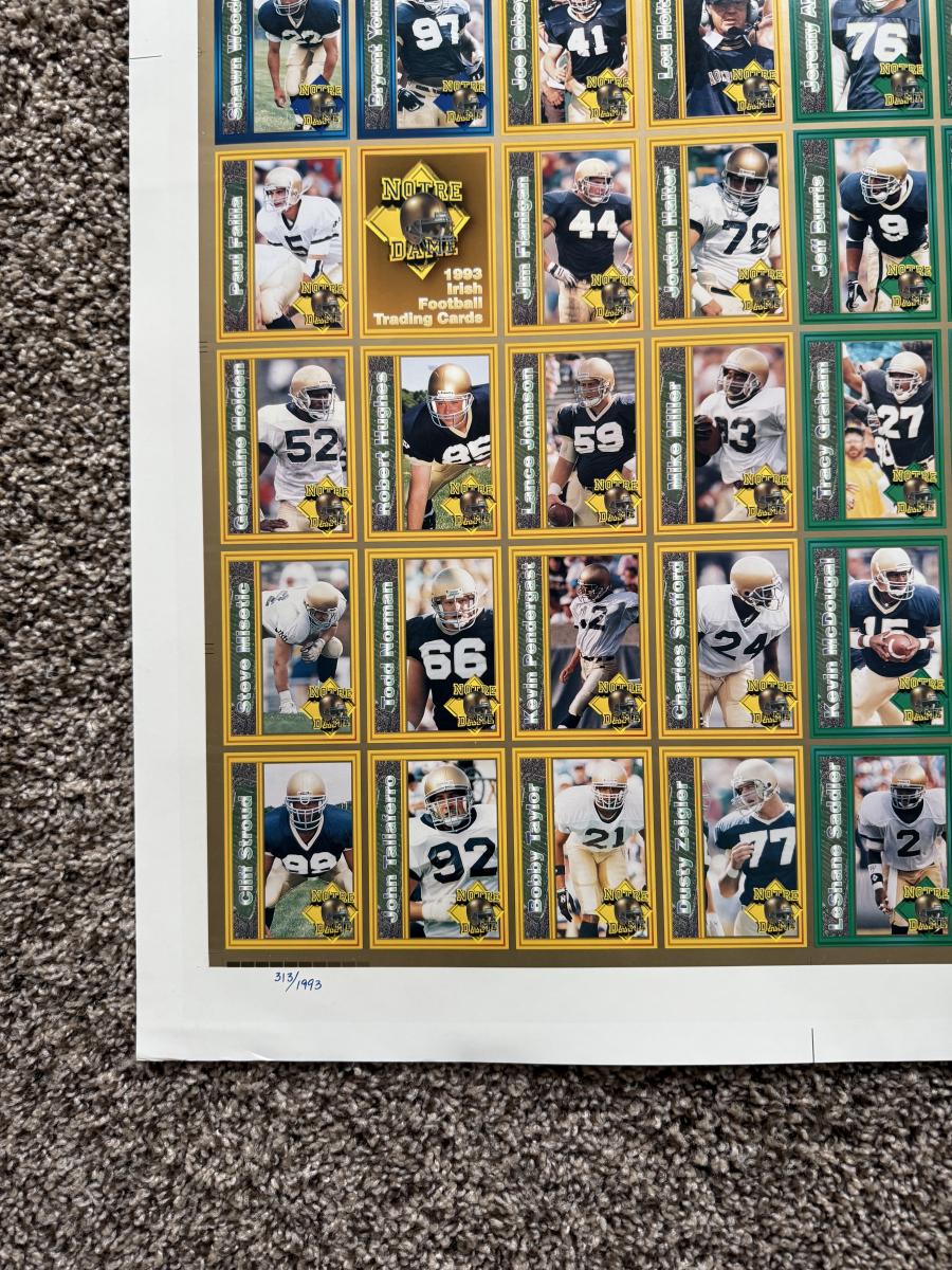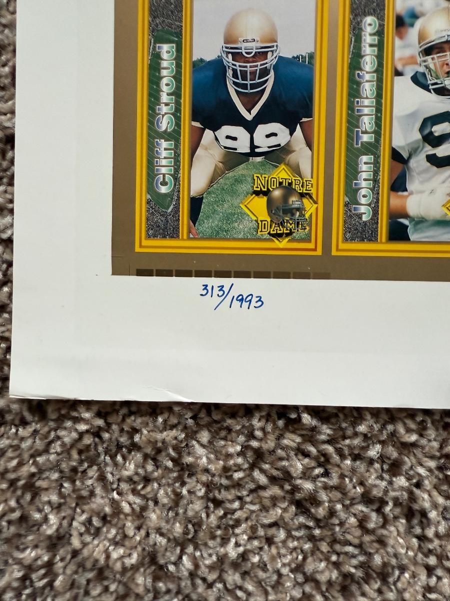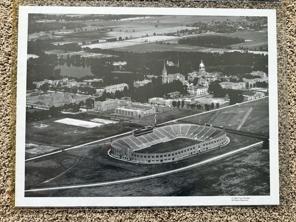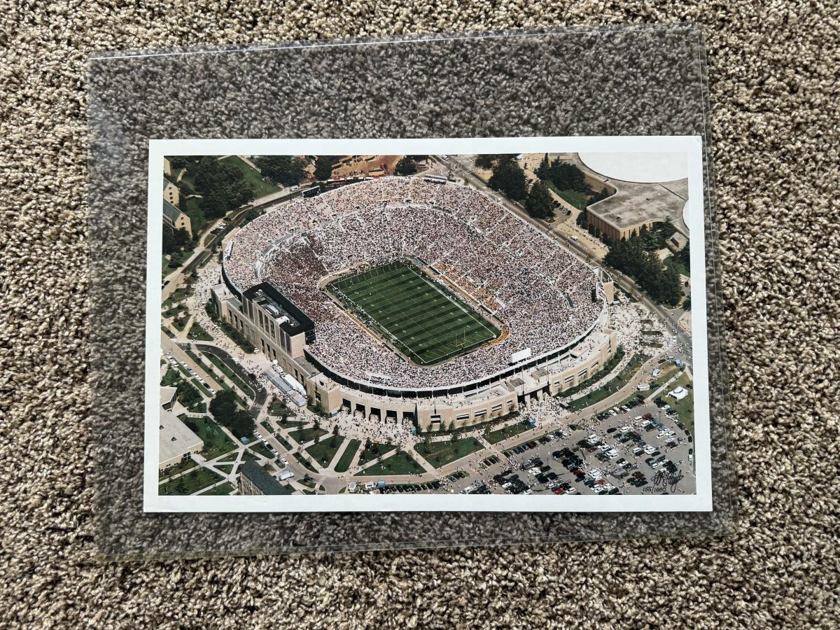 LOT 111G: Notre Dame Memorabilia Collection - Football Card Poster #313/1993, 1996 Tracy Stouffer Campus Photos, Signed & Numbered Stadium Photo 105/1000 & Knute Rockne Quote Posters