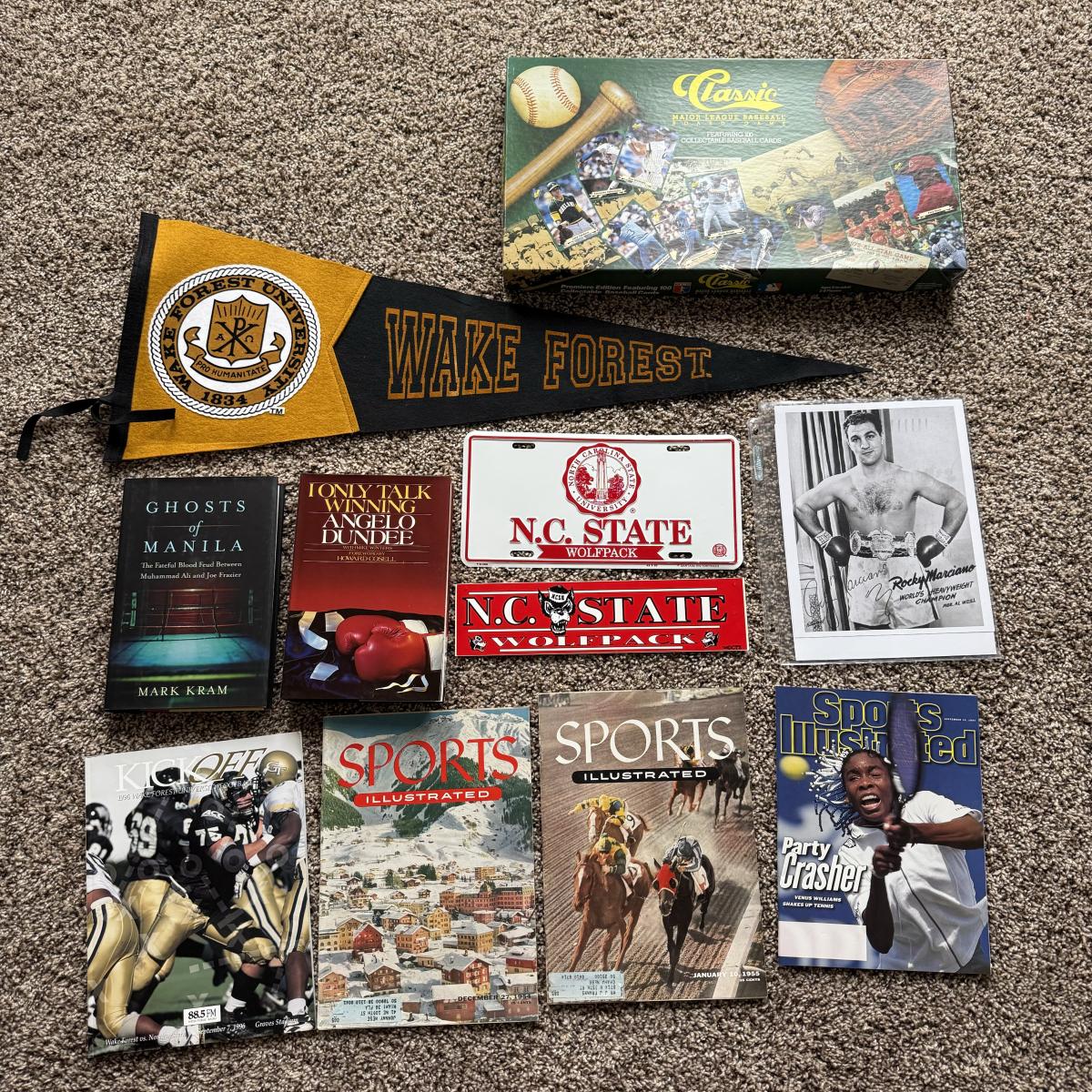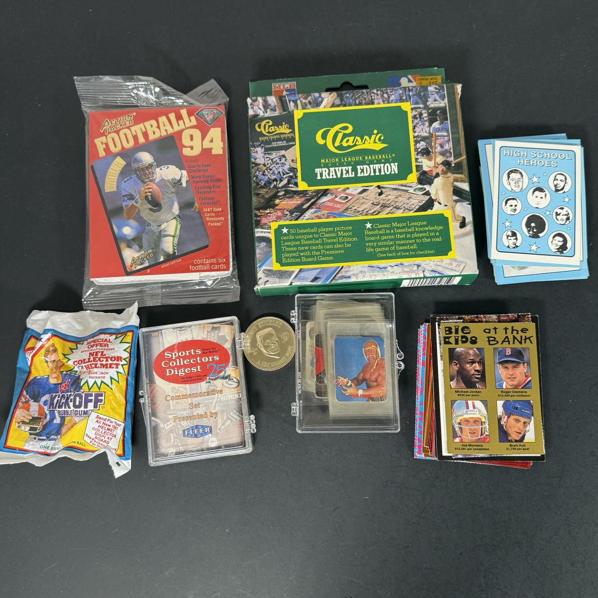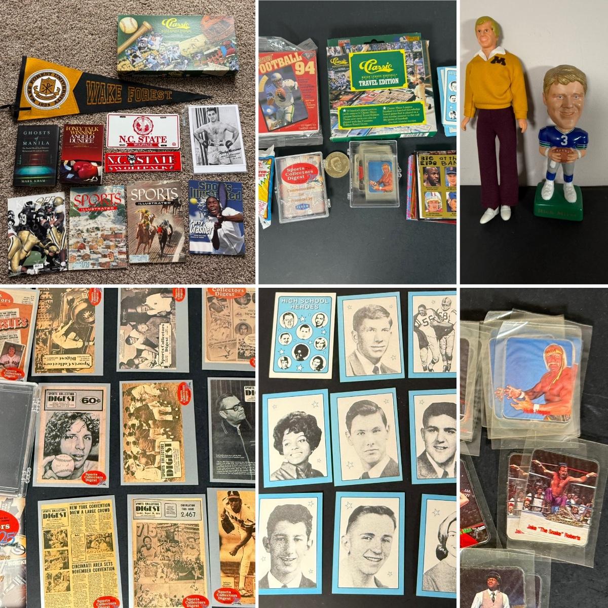 LOT 118G: Huge Sports Memorabilia Collection - 1950s Sports Illustrated, Classic Baseball Board Game, Coach Doll, Trading Cards - 1993 High School Heroes, 1988 Borden WWF Tag Team of the Year & More