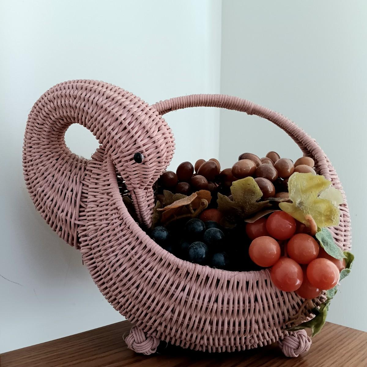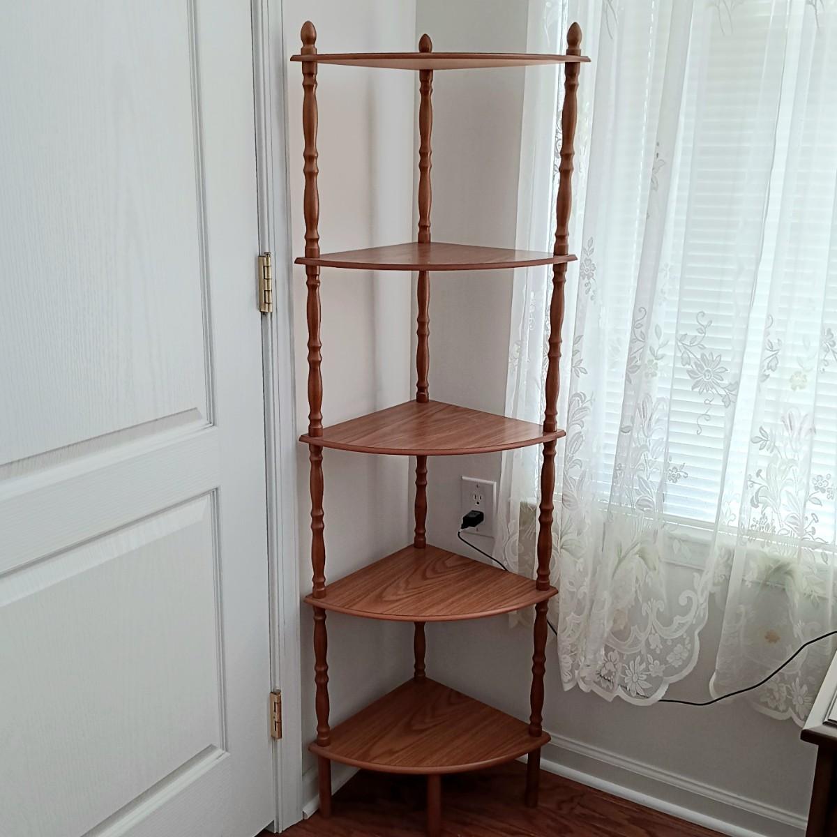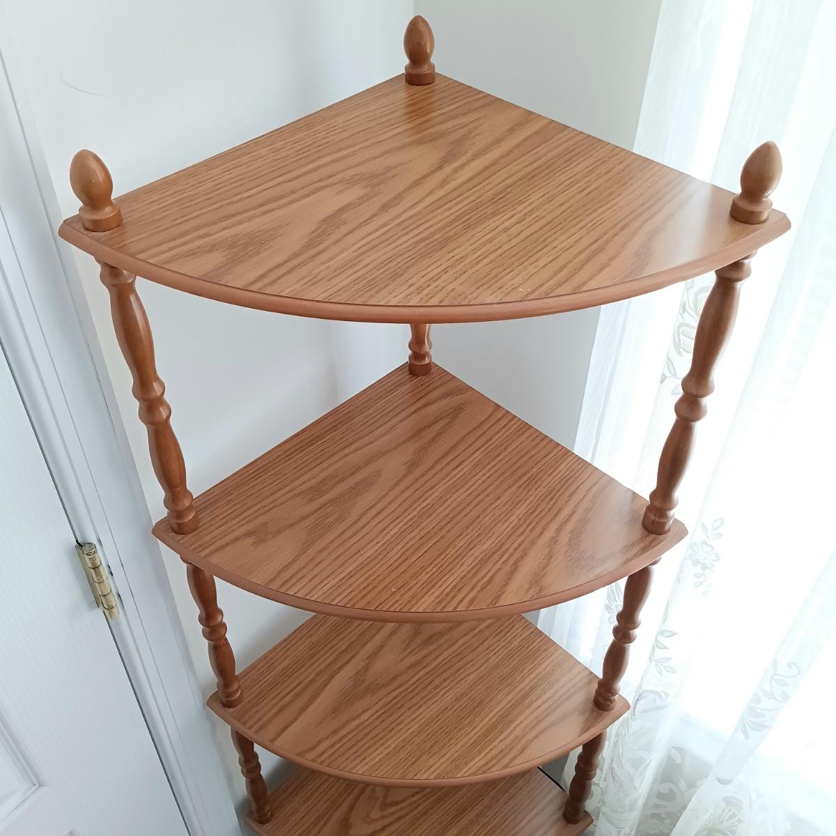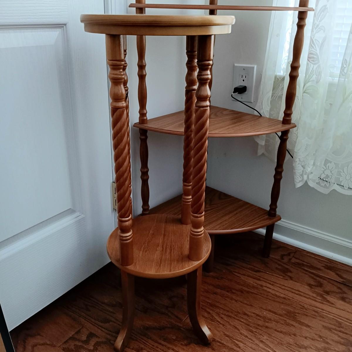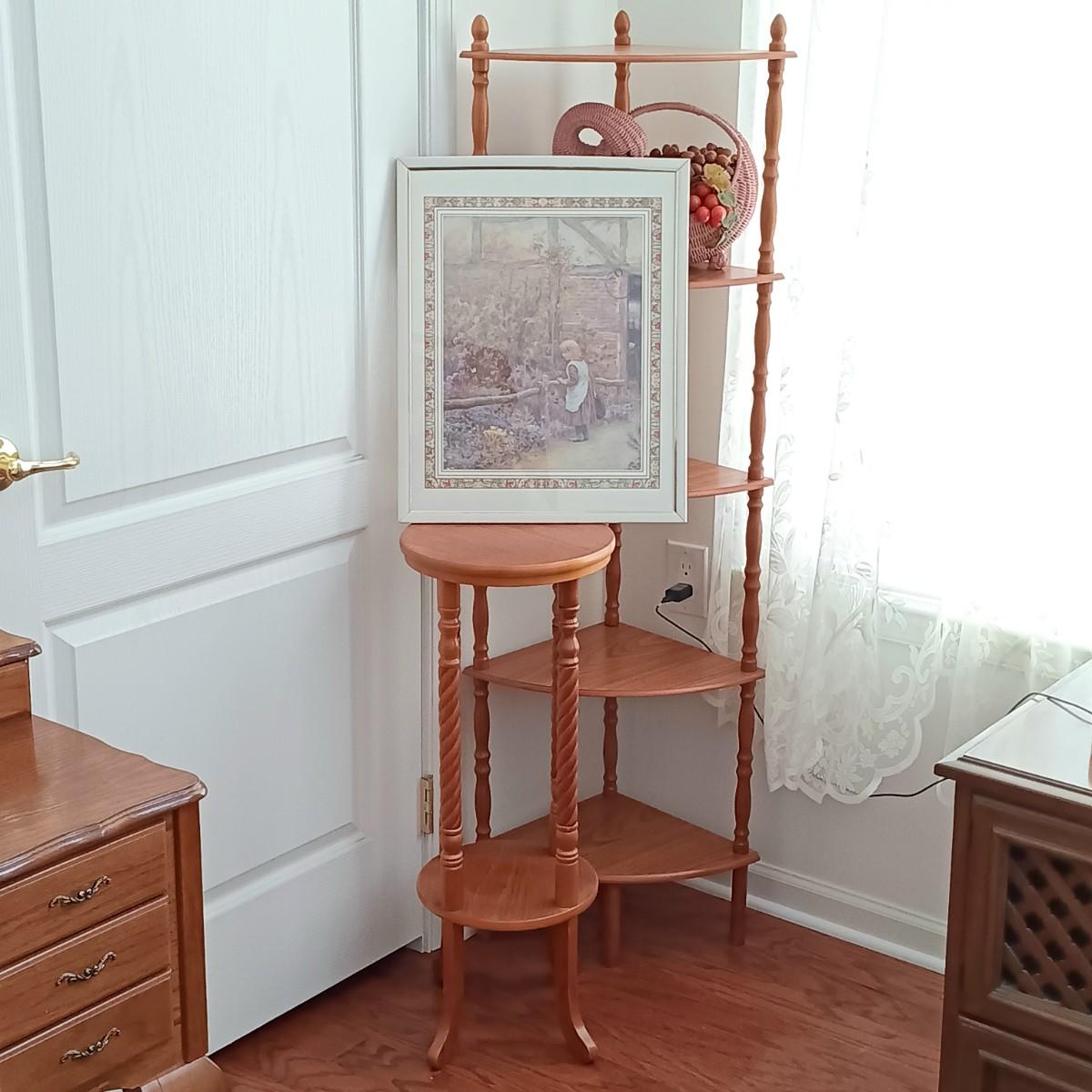 LOT 6: Vintage Spindle Leg Plant Stand, 5-Tier Corner Shelf, Wicker Duck Basket & Cottage Print