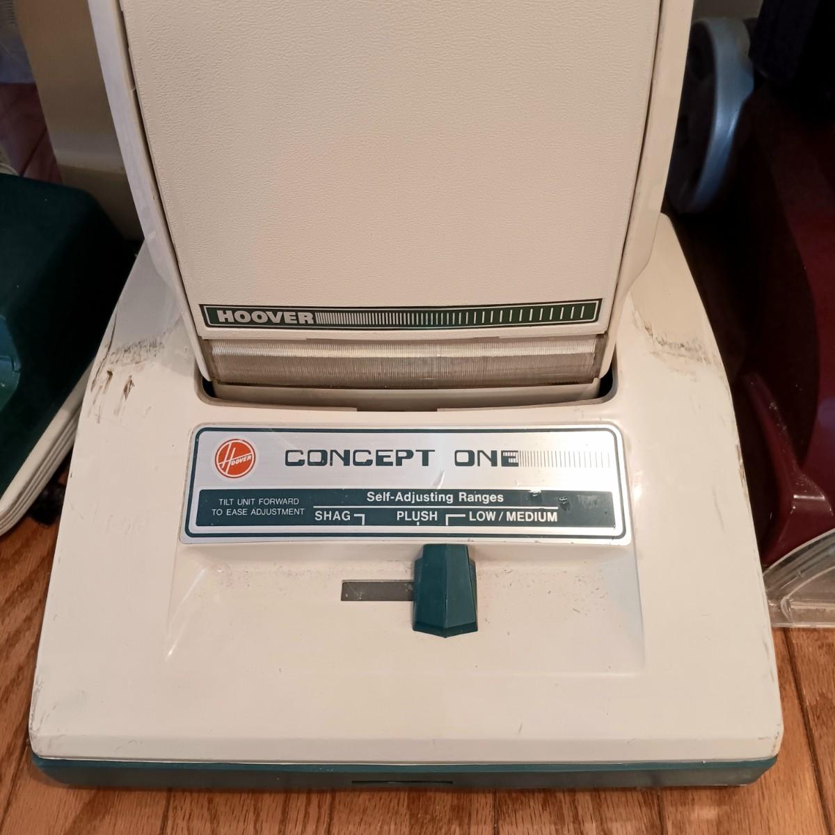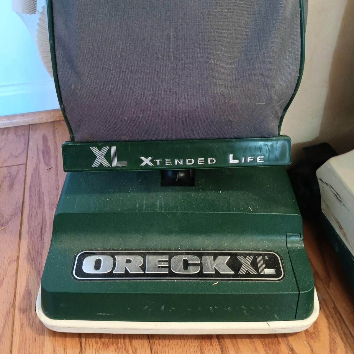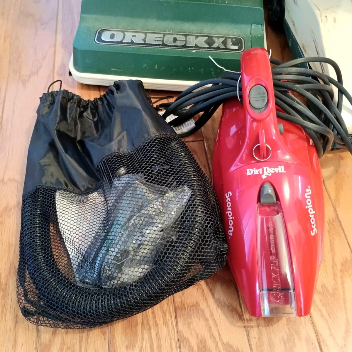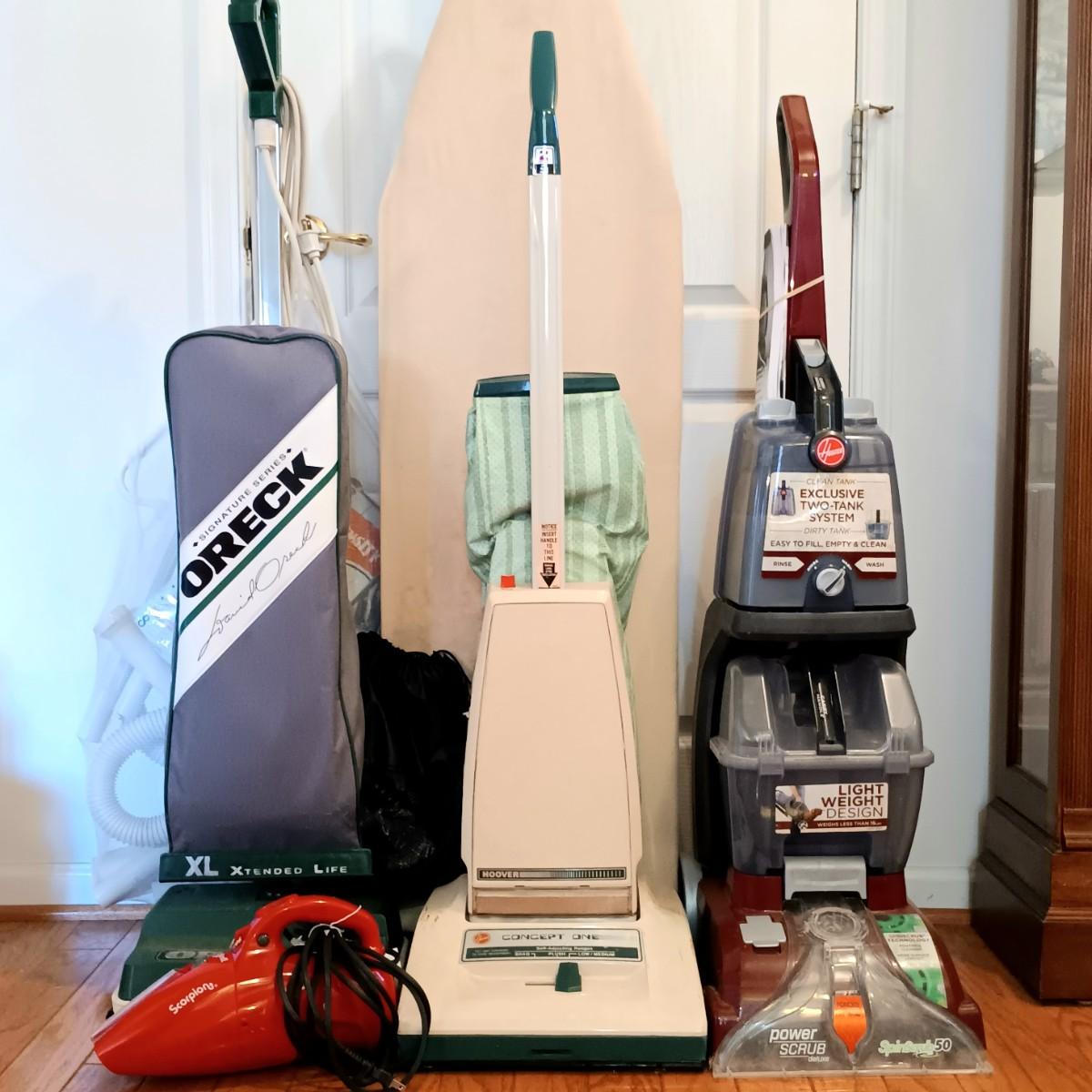 LOT 9: Vintage Oreck XL Signature Series and Hoover Concert One Vaccuums w/ Hoover PowerScrub Deluxe Carpet Cleaner, Dirt Devil Scorpion & Ironing Board