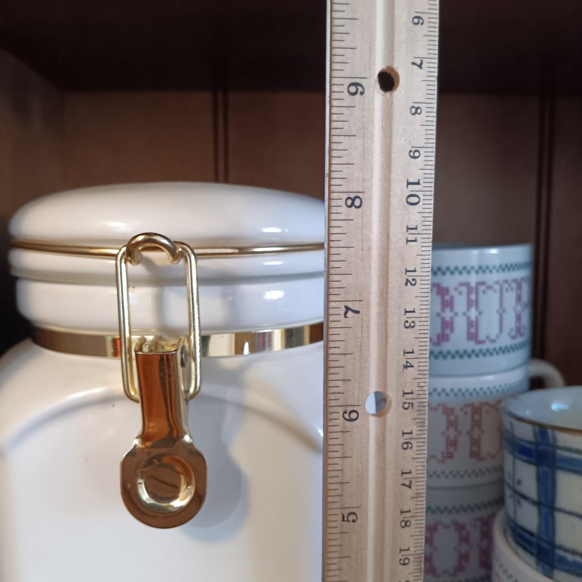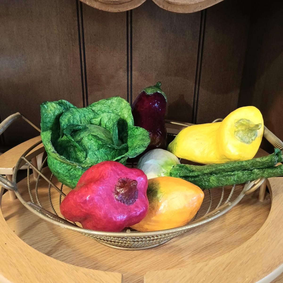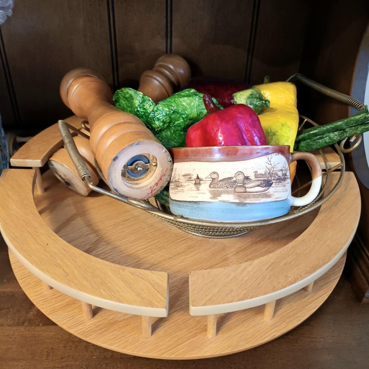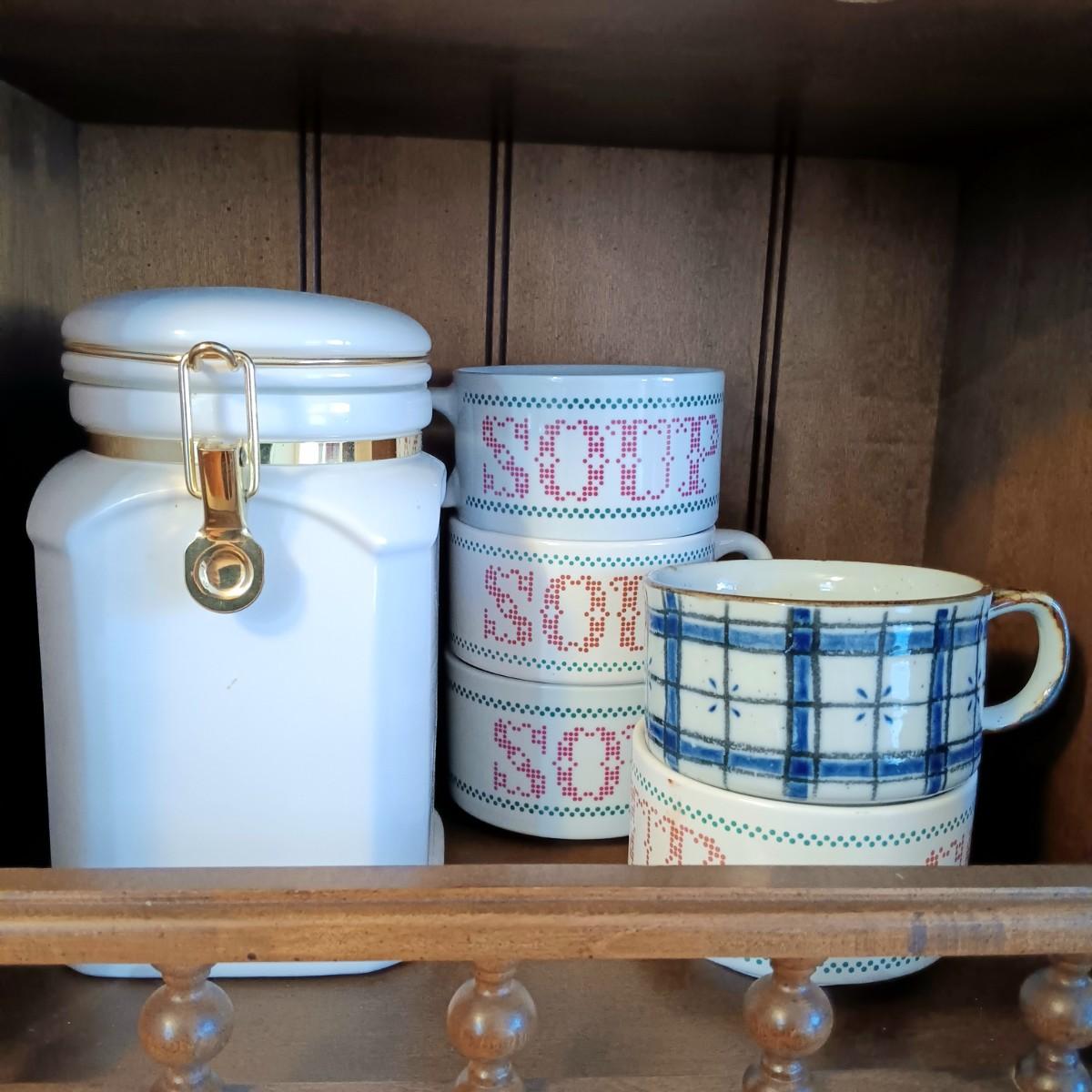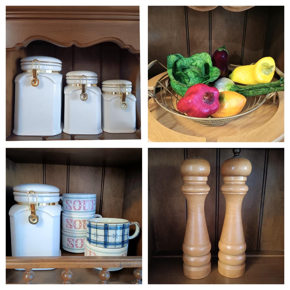 LOT 14: RS Ceramic Canisters, Houston Foods Co. Soup Mugs, Paper Mache Vegetables in Wire Basket & More