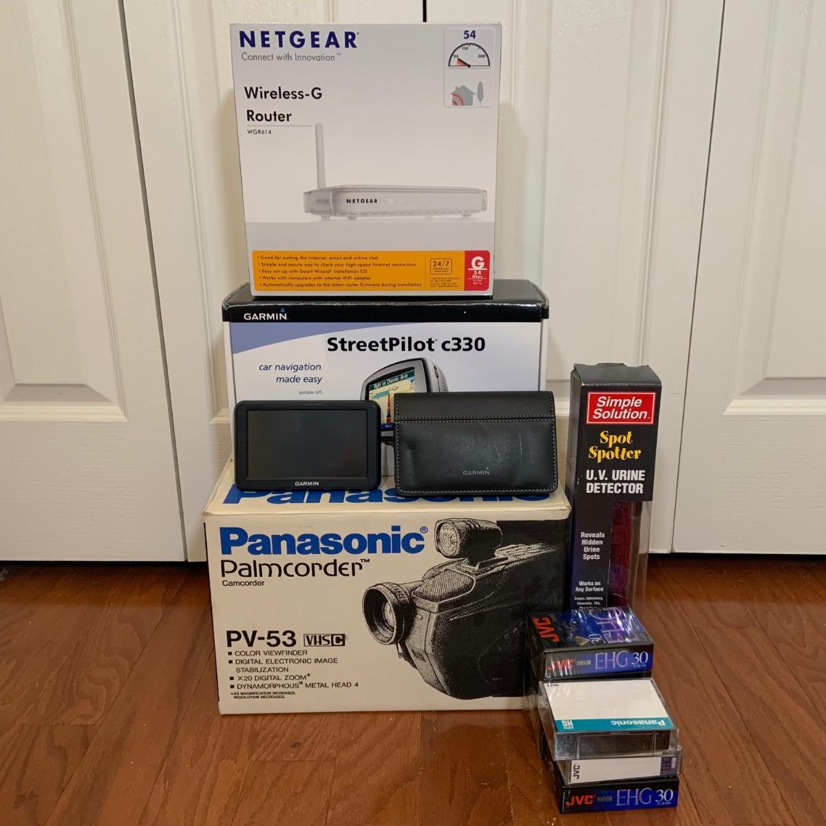 LOT:46: Classic Electronics and More Featuring a Panasonic Palmcorder PV-53 VHS Camcorder, Garmen Navigation Systems, Netgear and More