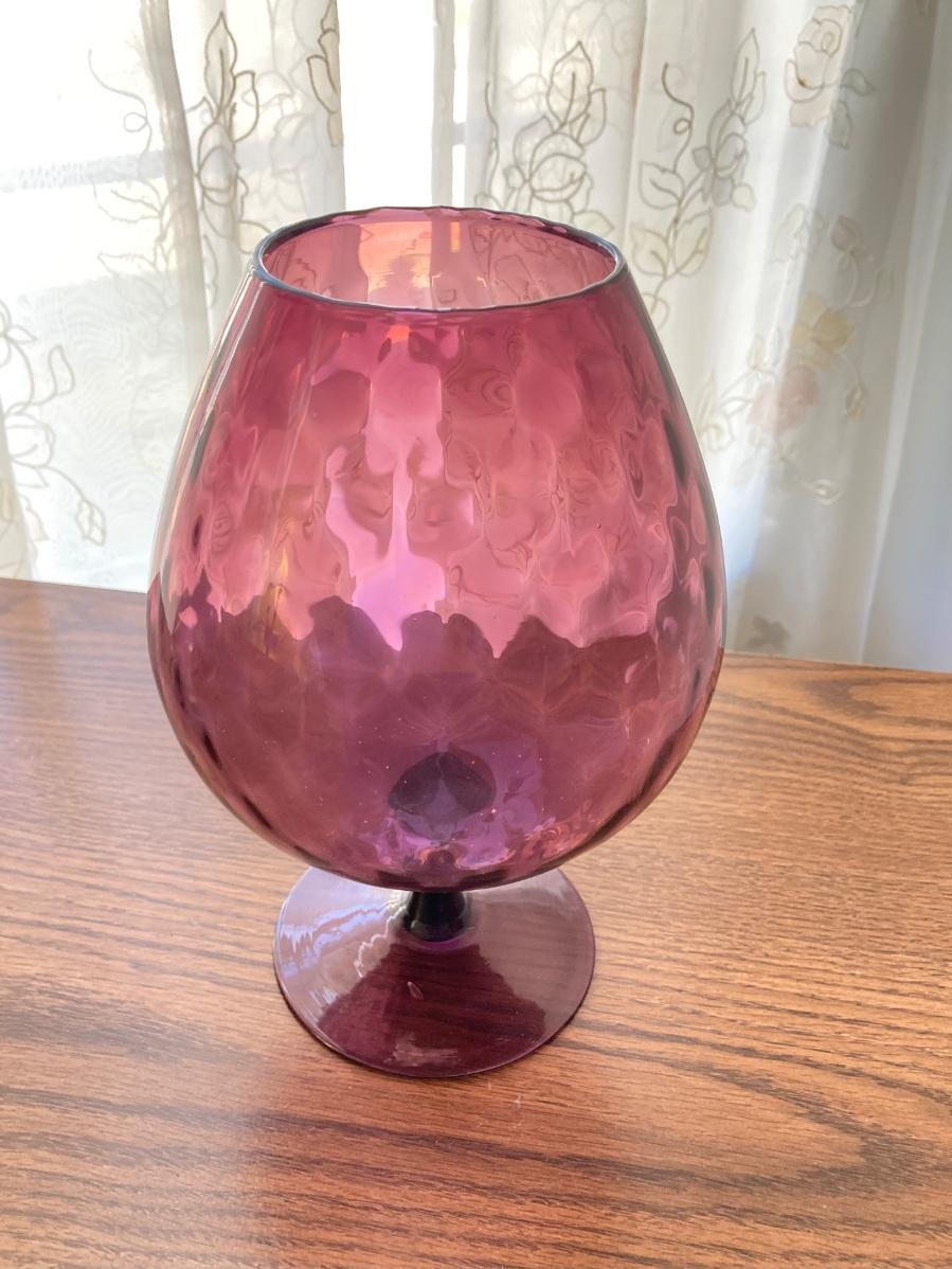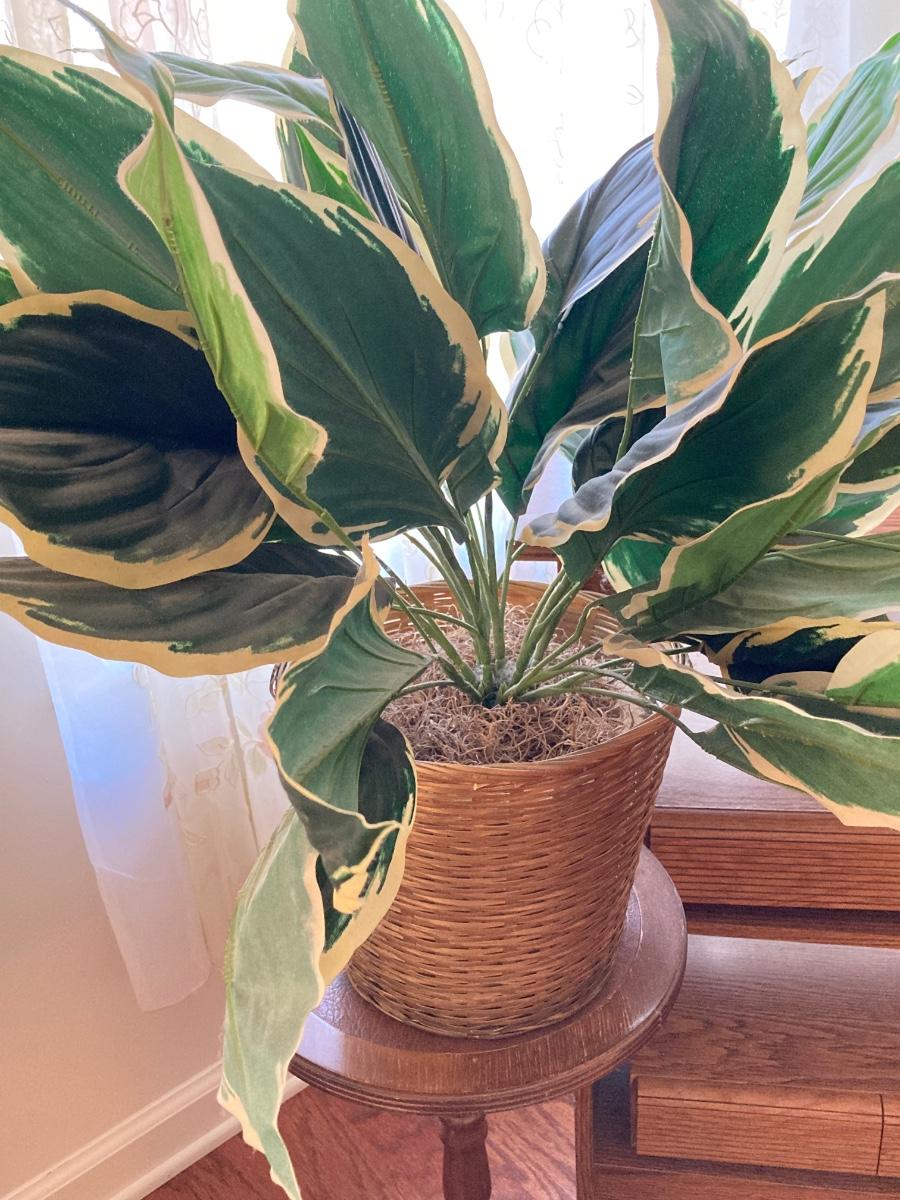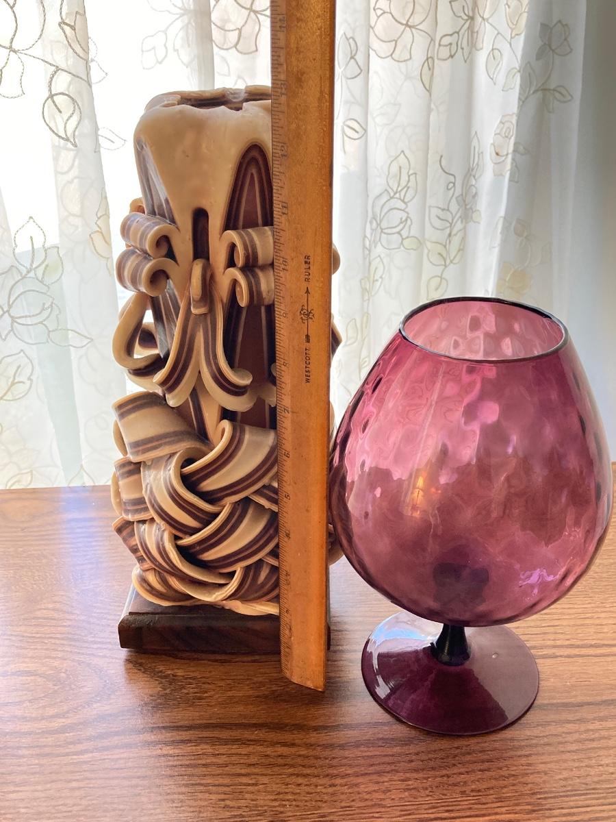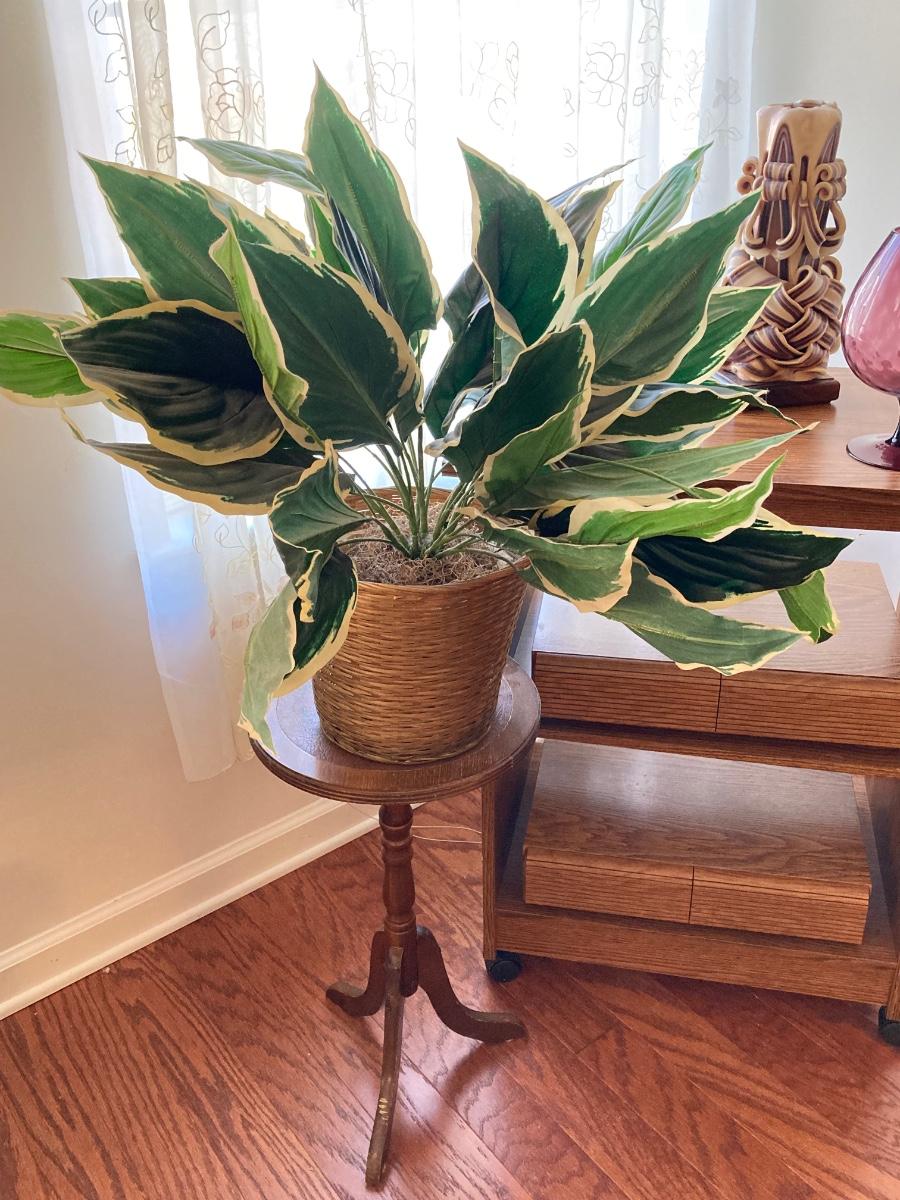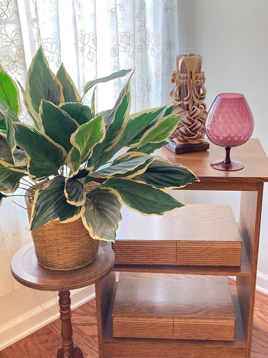 LOT 59: Vintage Rolling Side Table, MCM Ribbon Candle, Cranberry Glass Vase, Cassette Storage with Cassette Tapes, Wood Plant Stand and Faux Plant,