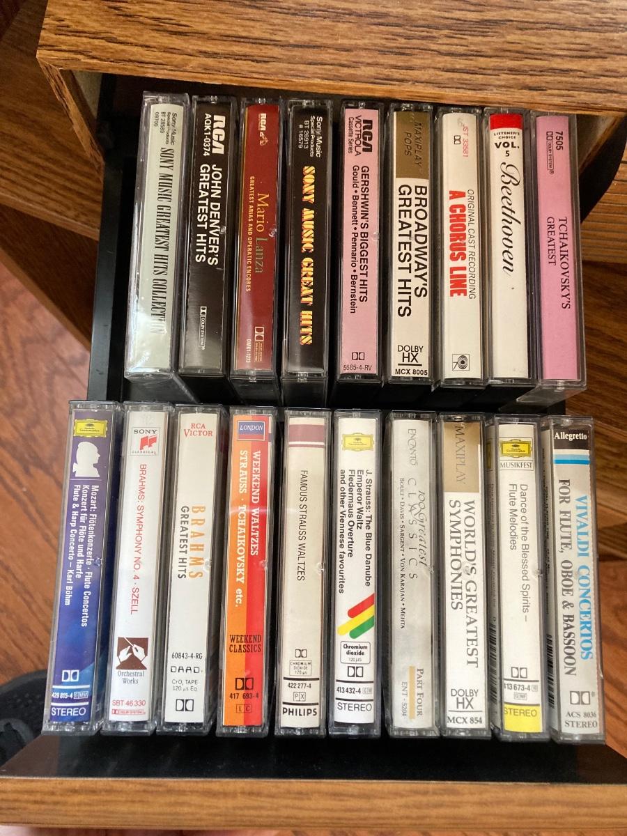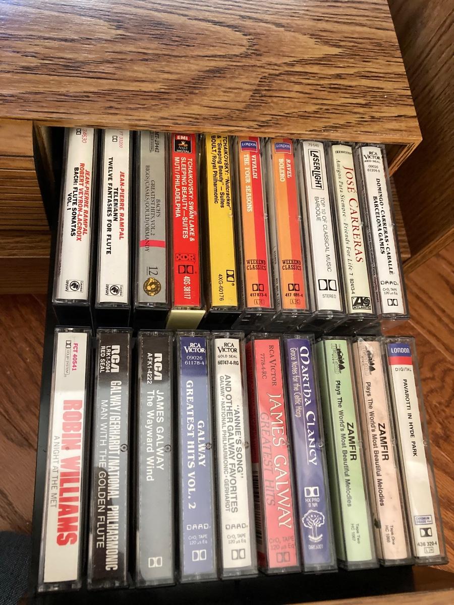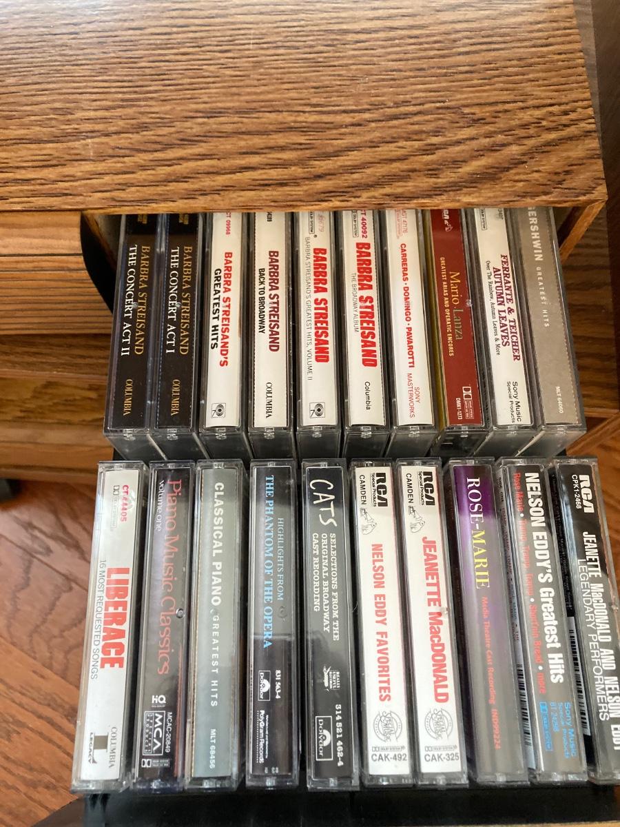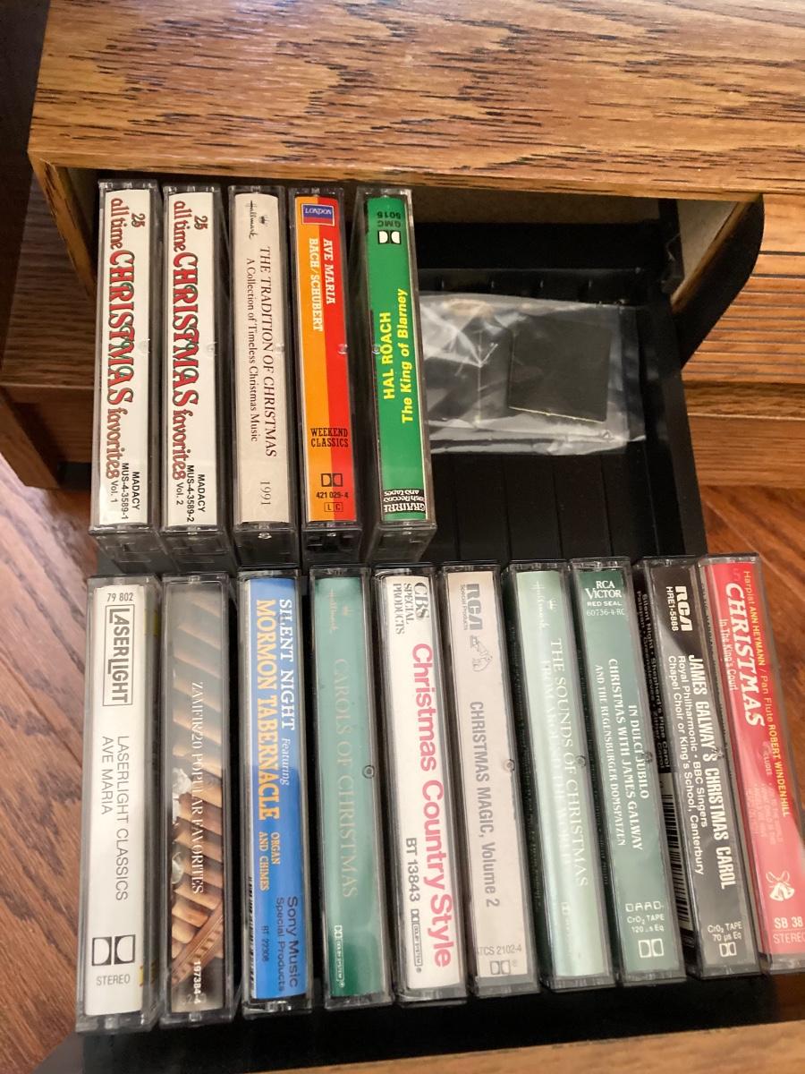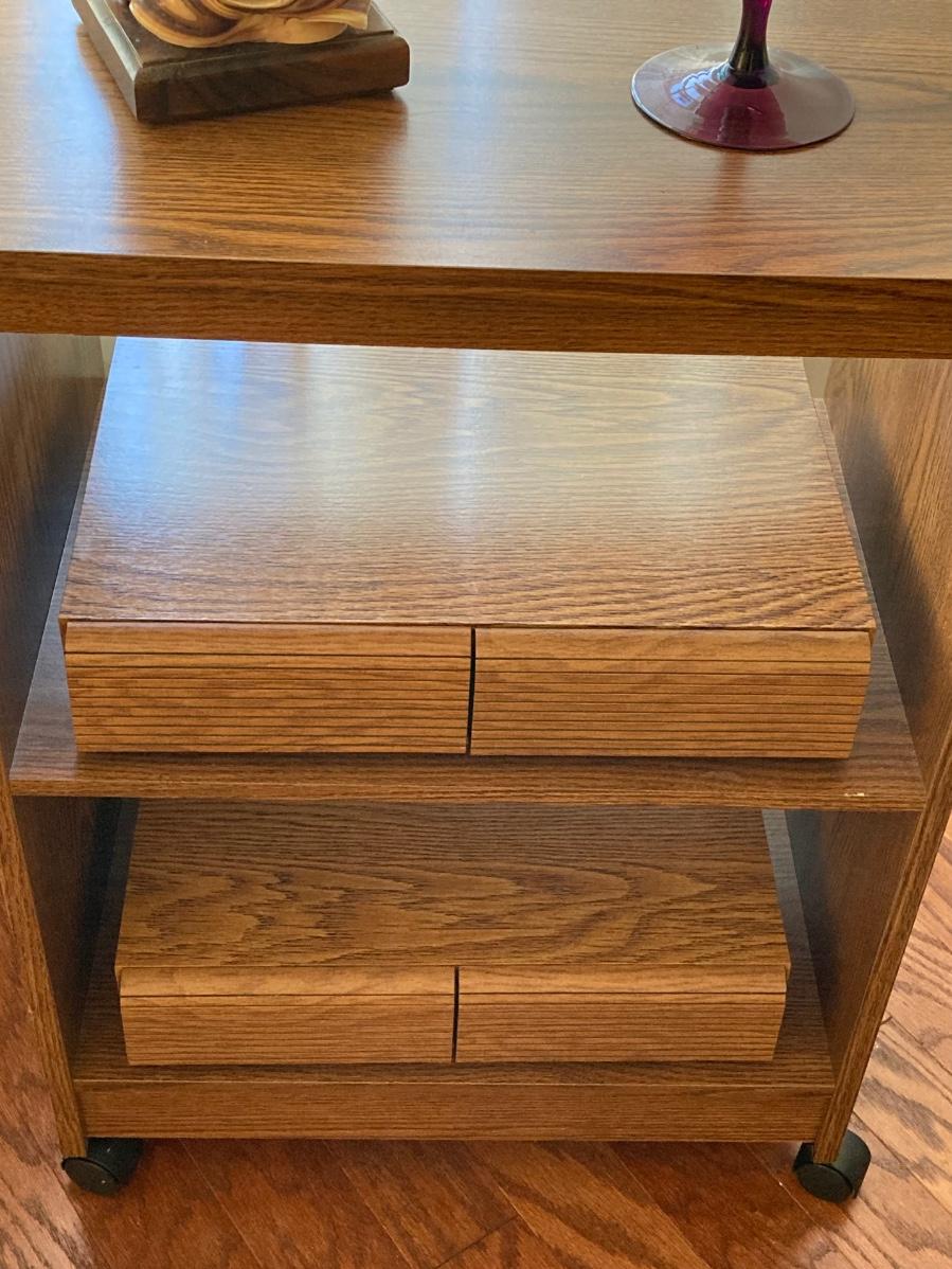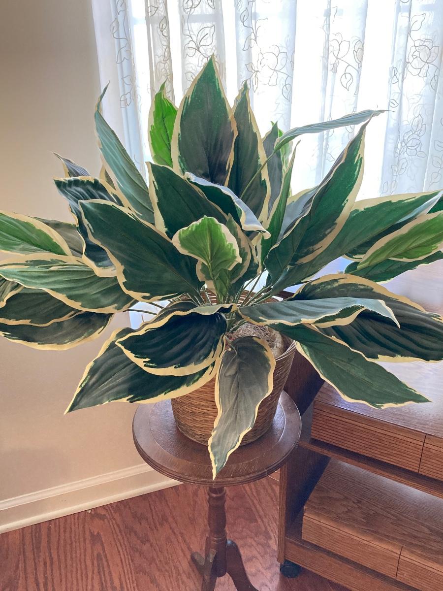 LOT 59: Vintage Rolling Side Table, MCM Ribbon Candle, Cranberry Glass Vase, Cassette Storage with Cassette Tapes, Wood Plant Stand and Faux Plant,