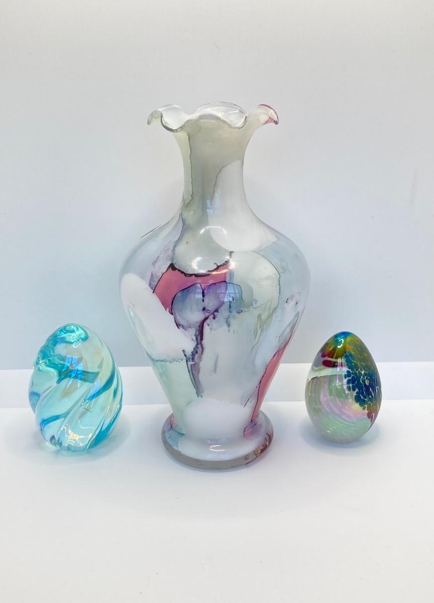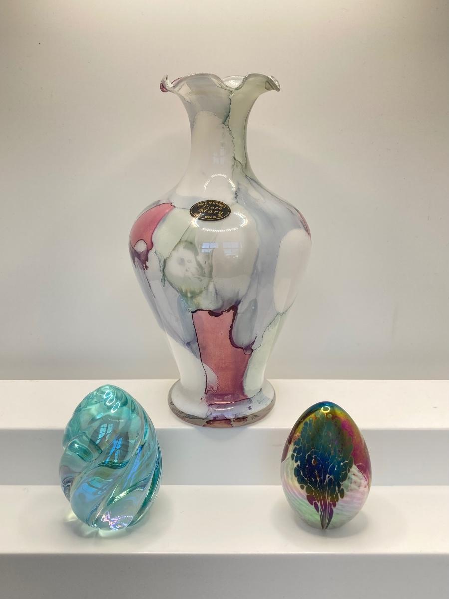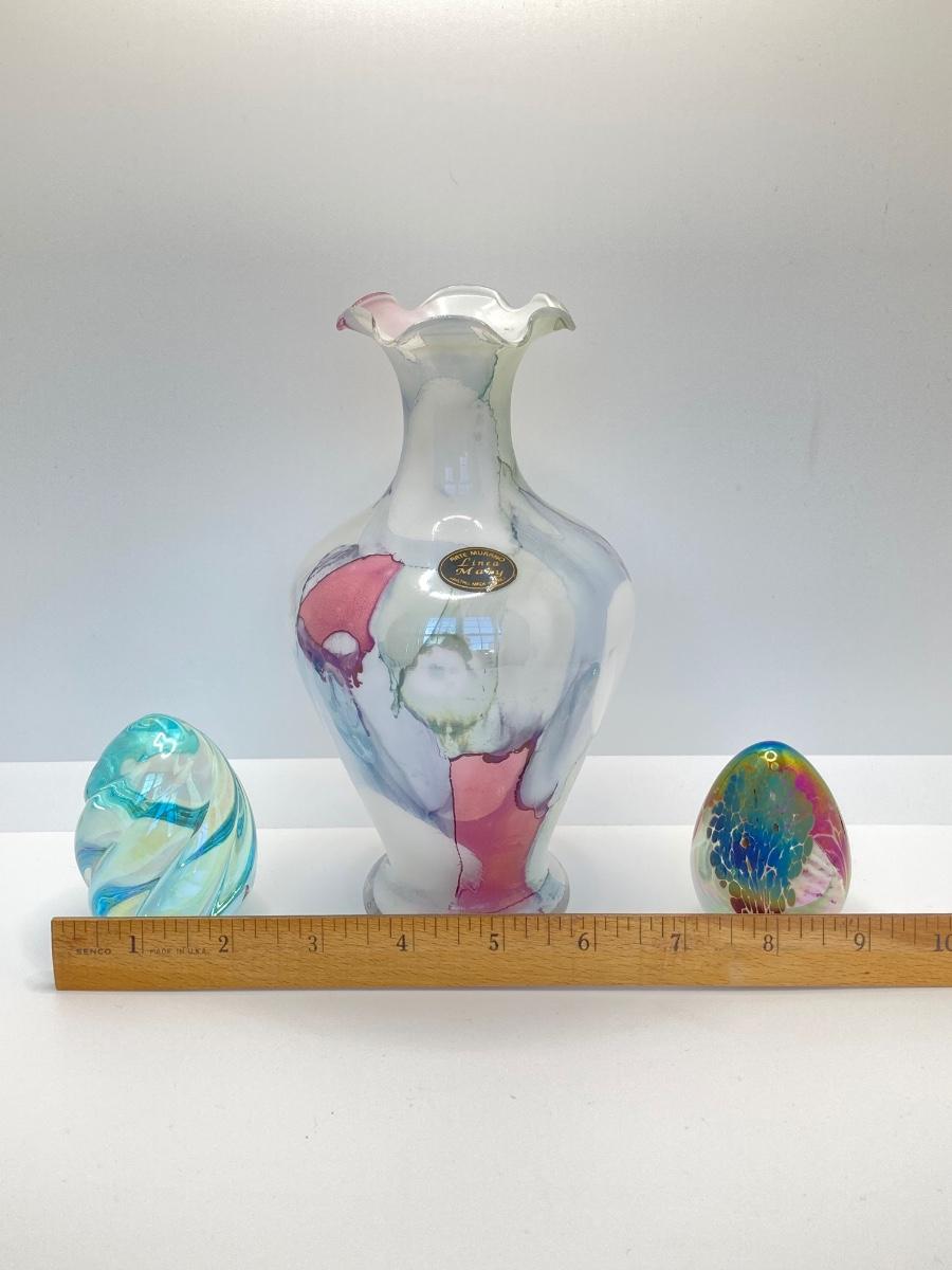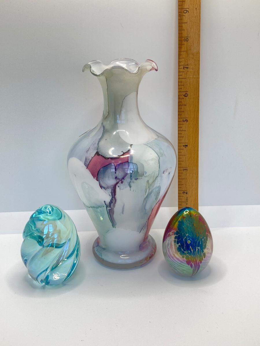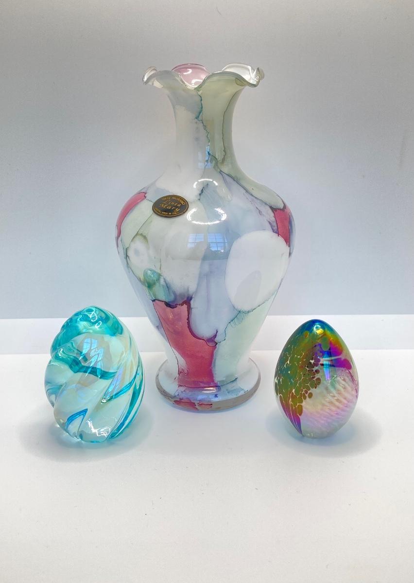 LOT 67: Art Glass Collection - Arte Murano Linea Mary Vase and Two Beautiful Iridescent Decorative Eggs