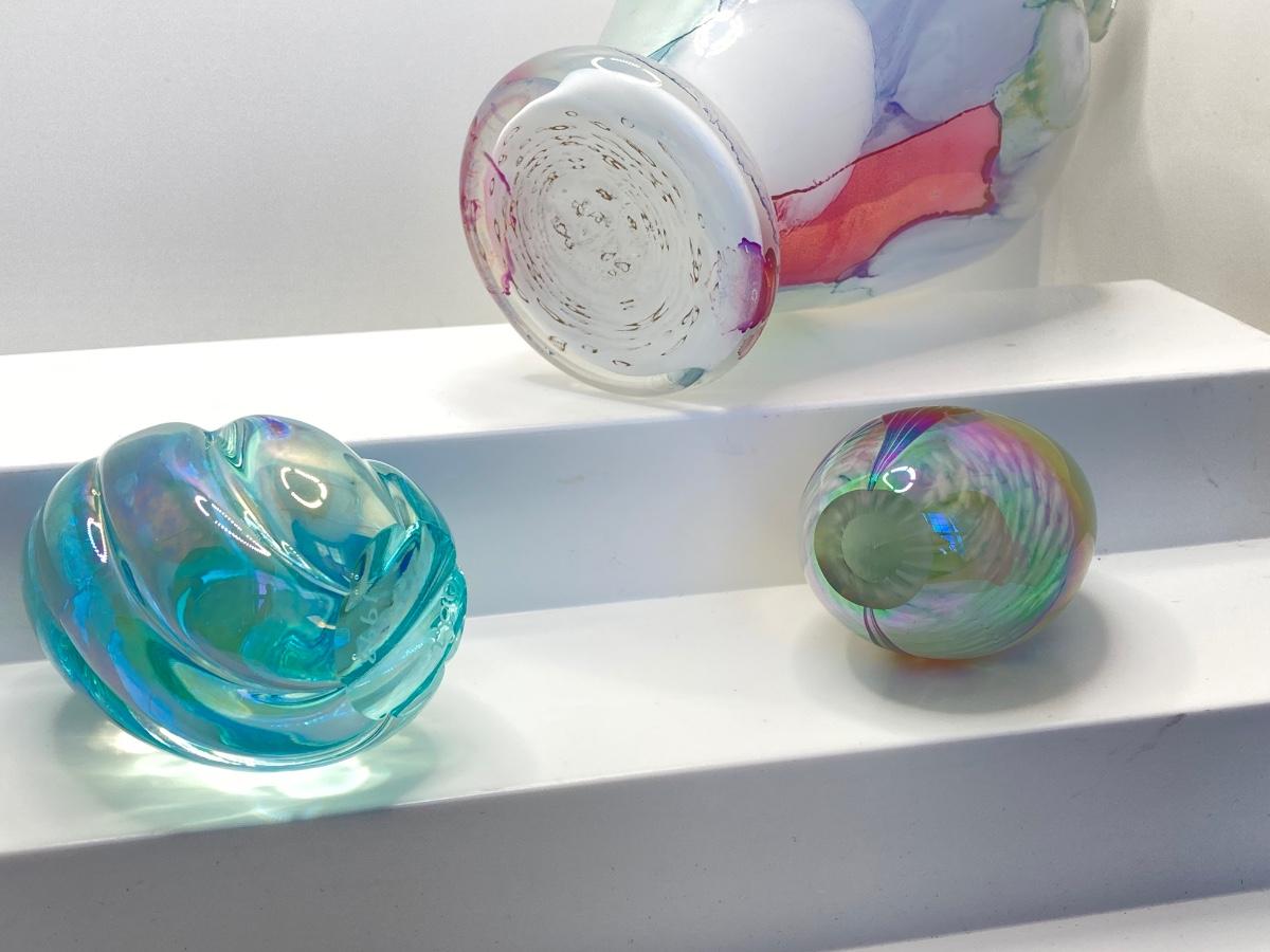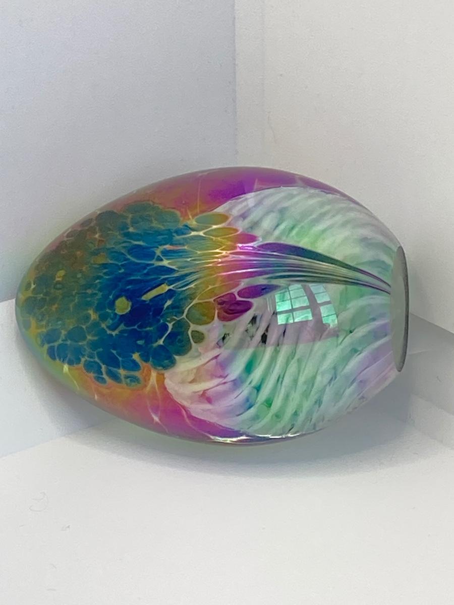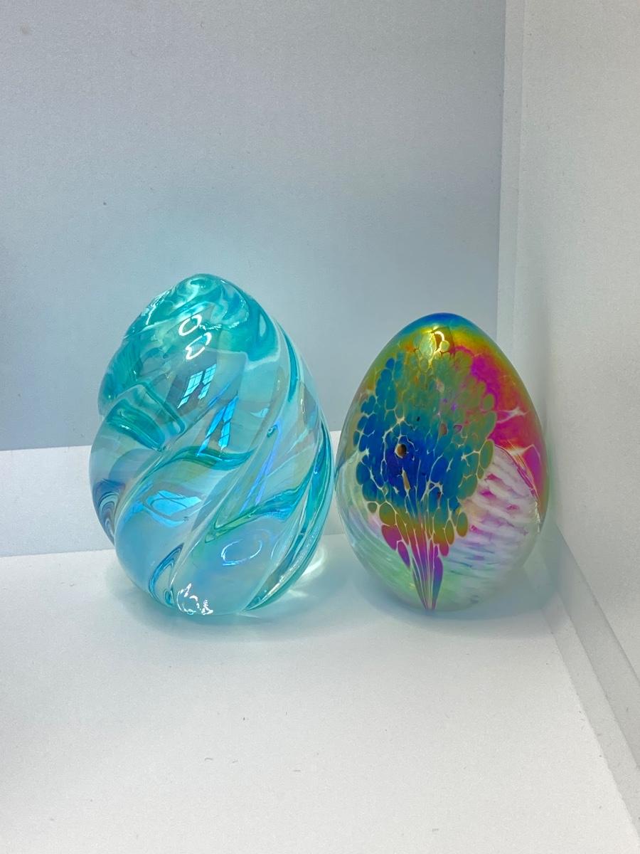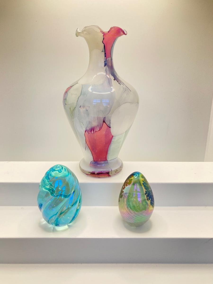 LOT 67: Art Glass Collection - Arte Murano Linea Mary Vase and Two Beautiful Iridescent Decorative Eggs