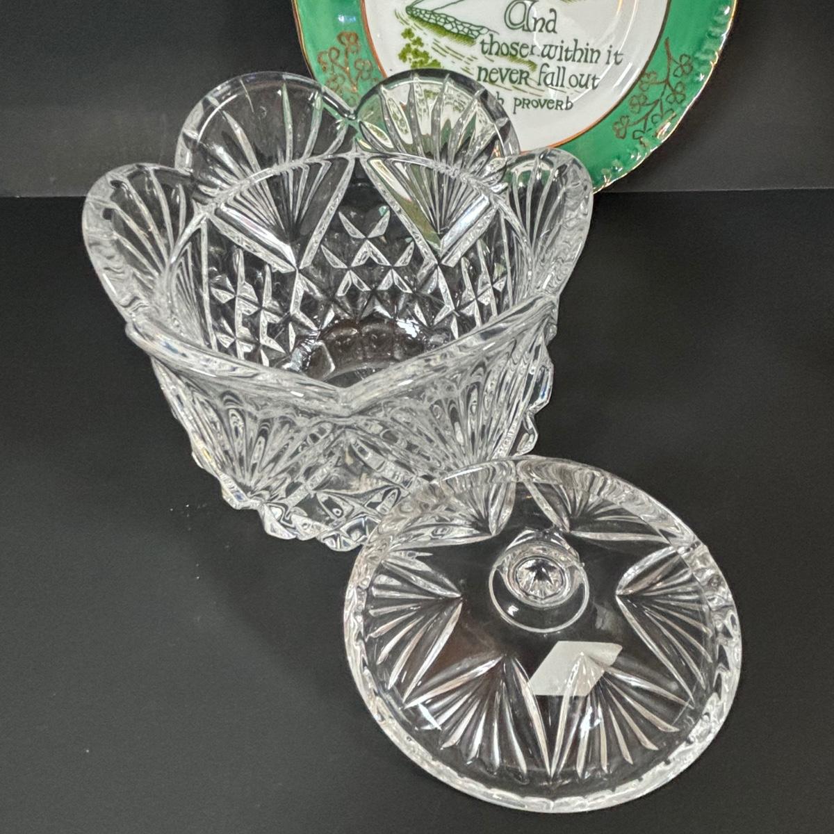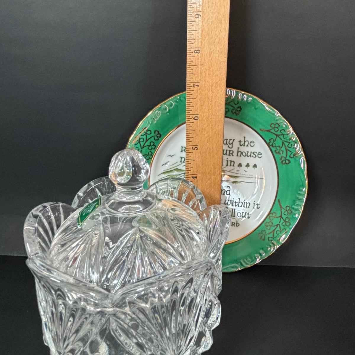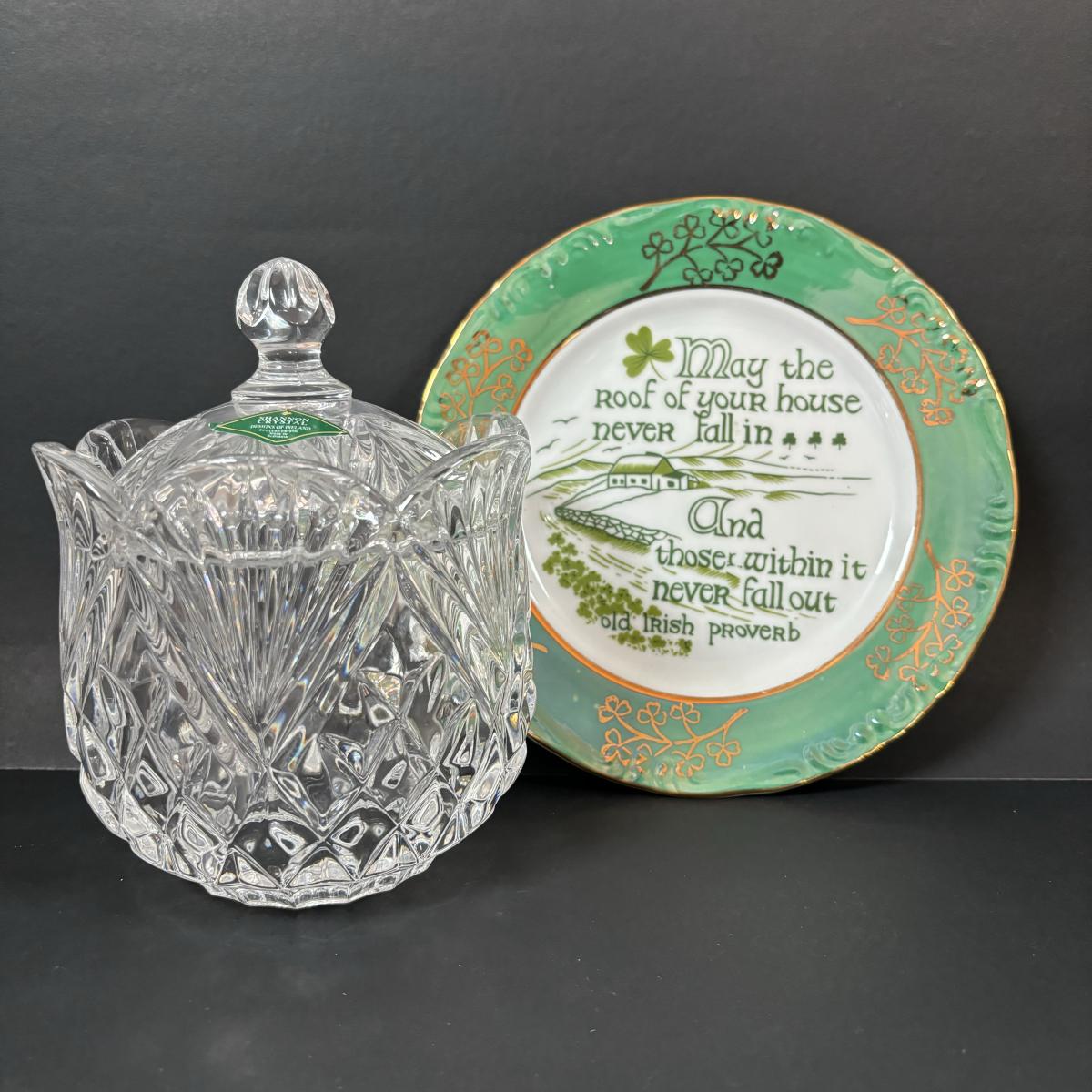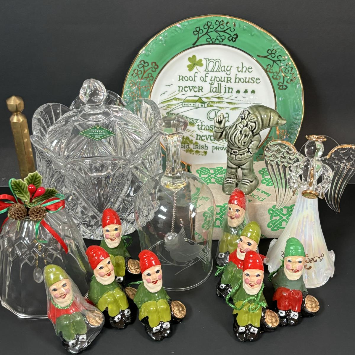 LOT 84: Shannon Crystal Covered Candy Dish, Vintage Polycrafts Leprechaun Ornaments, Knock Pottery Leprechaun, & Mo9re