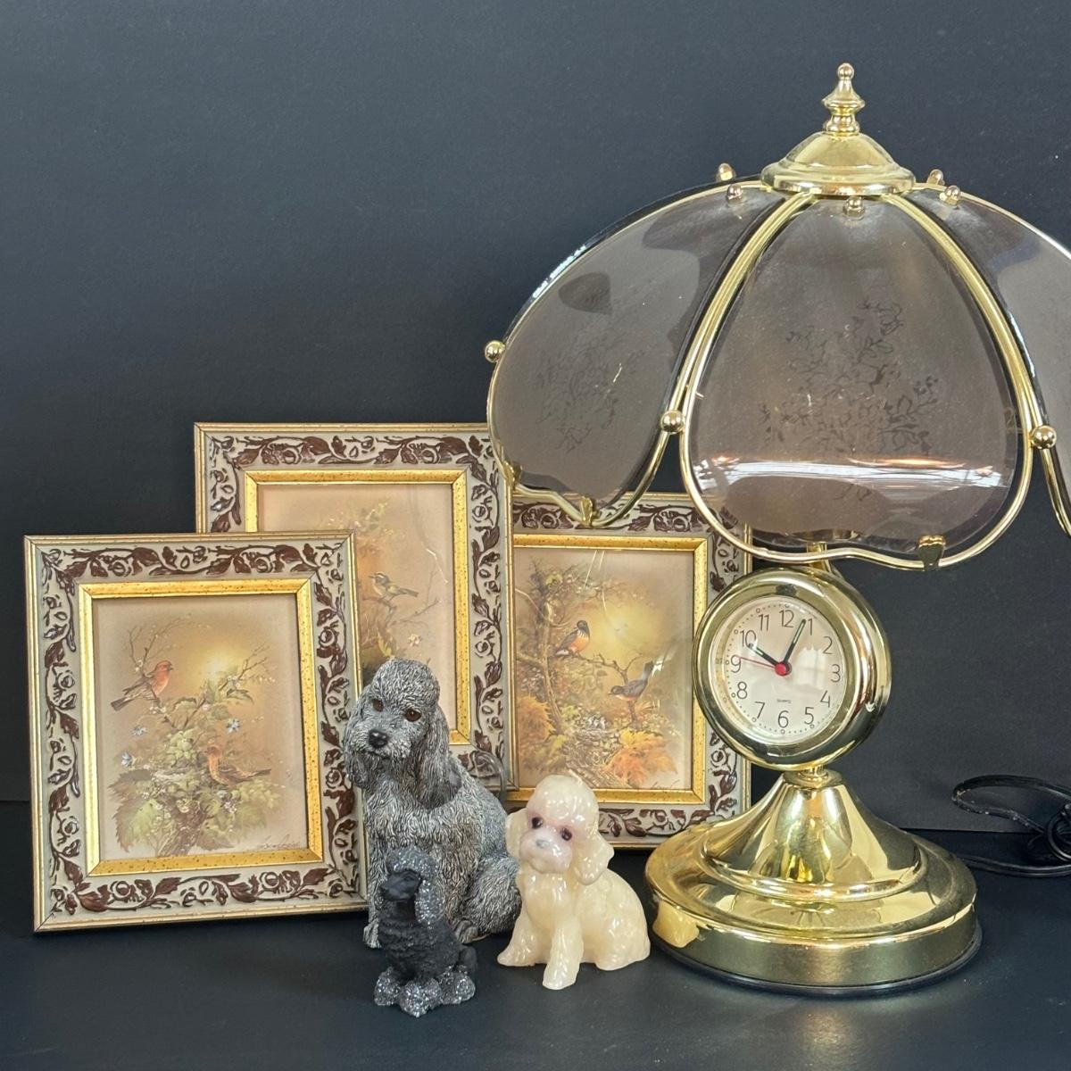 LOT 94: Touch Lamp w/Clock, Poodle Collection & Framed Prints