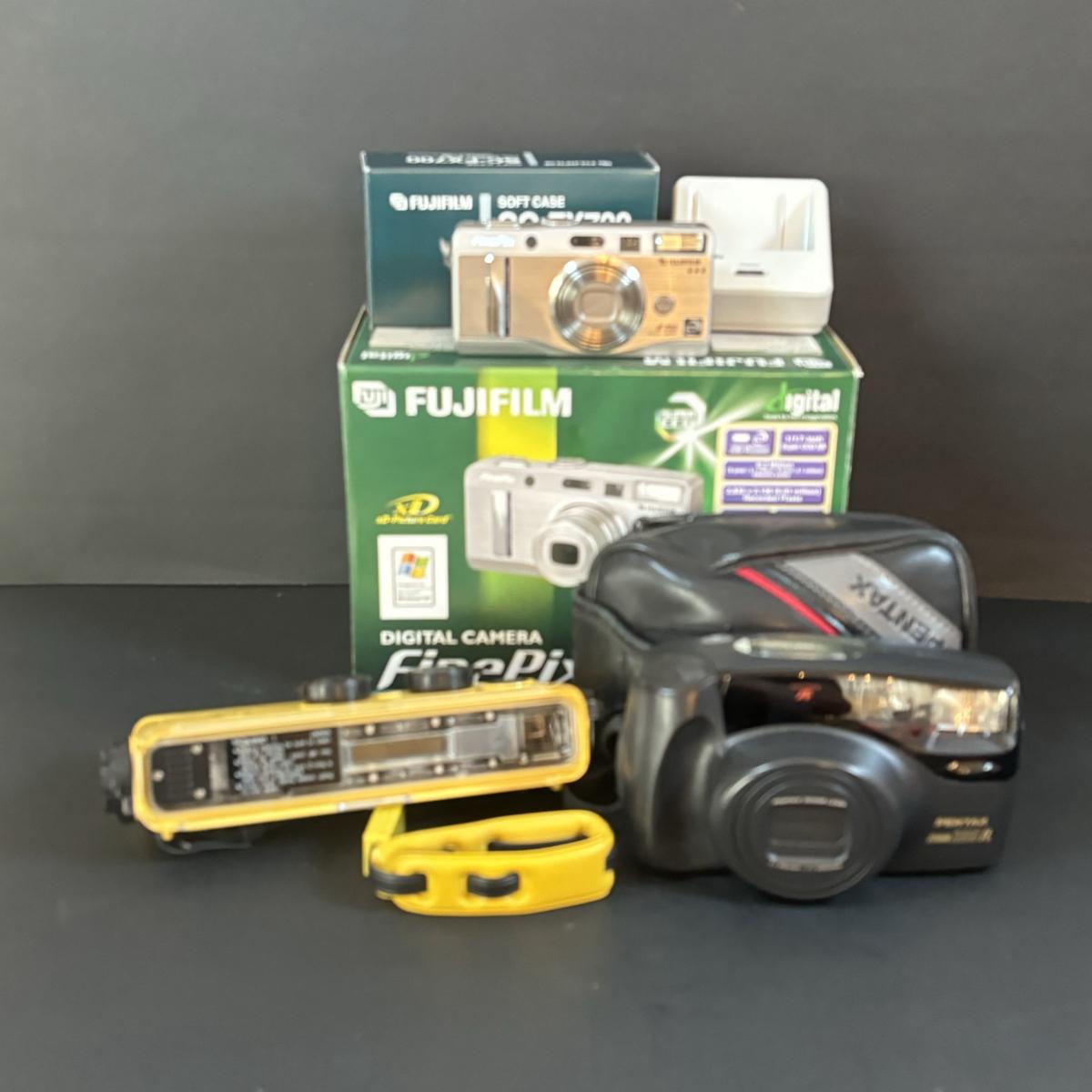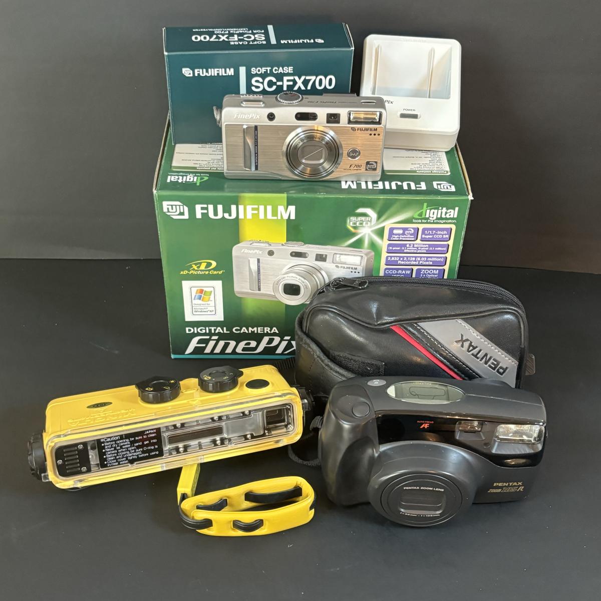 LOT 99: Fujifilm Fine Pix Digital F700 Camera, Pentax Zoom 105-R 35mm Point & Shoot Film Camera, Minolta Weathermatic A 110 Film Underwater Camera w/ Strap