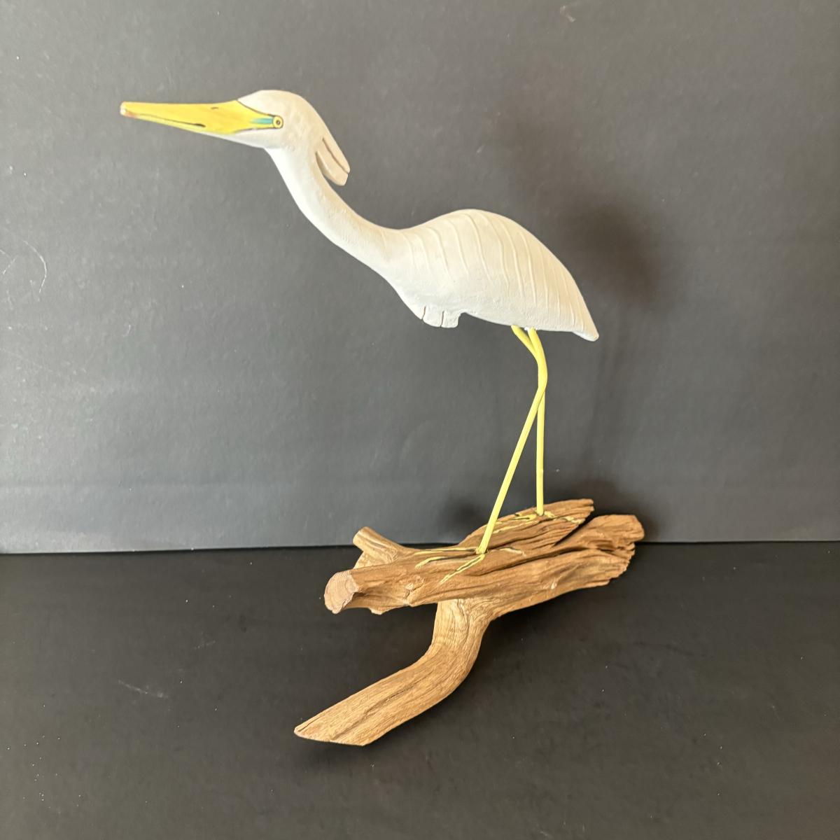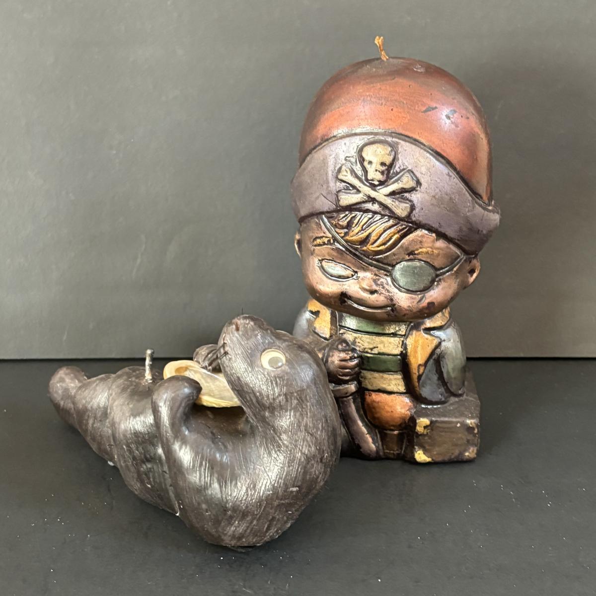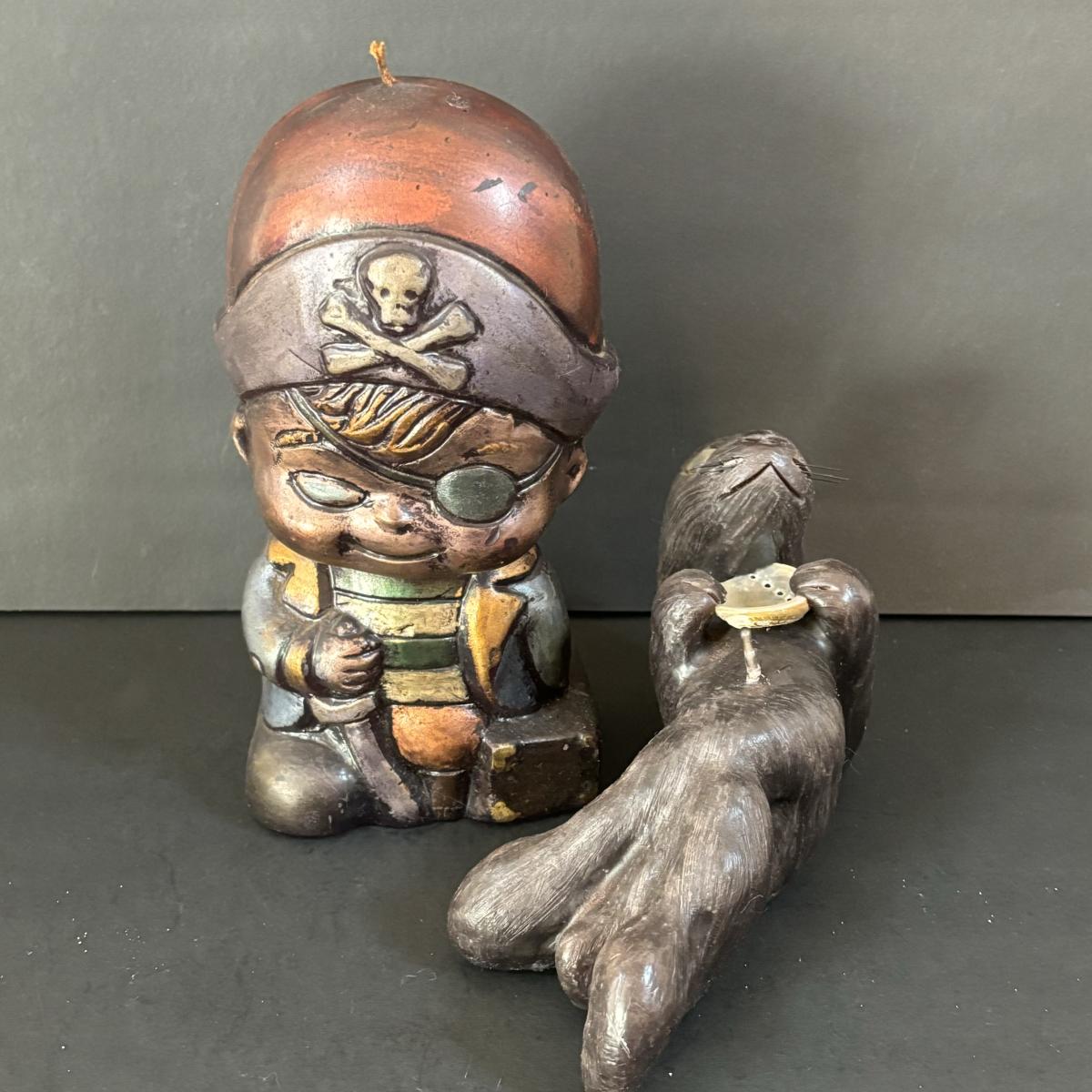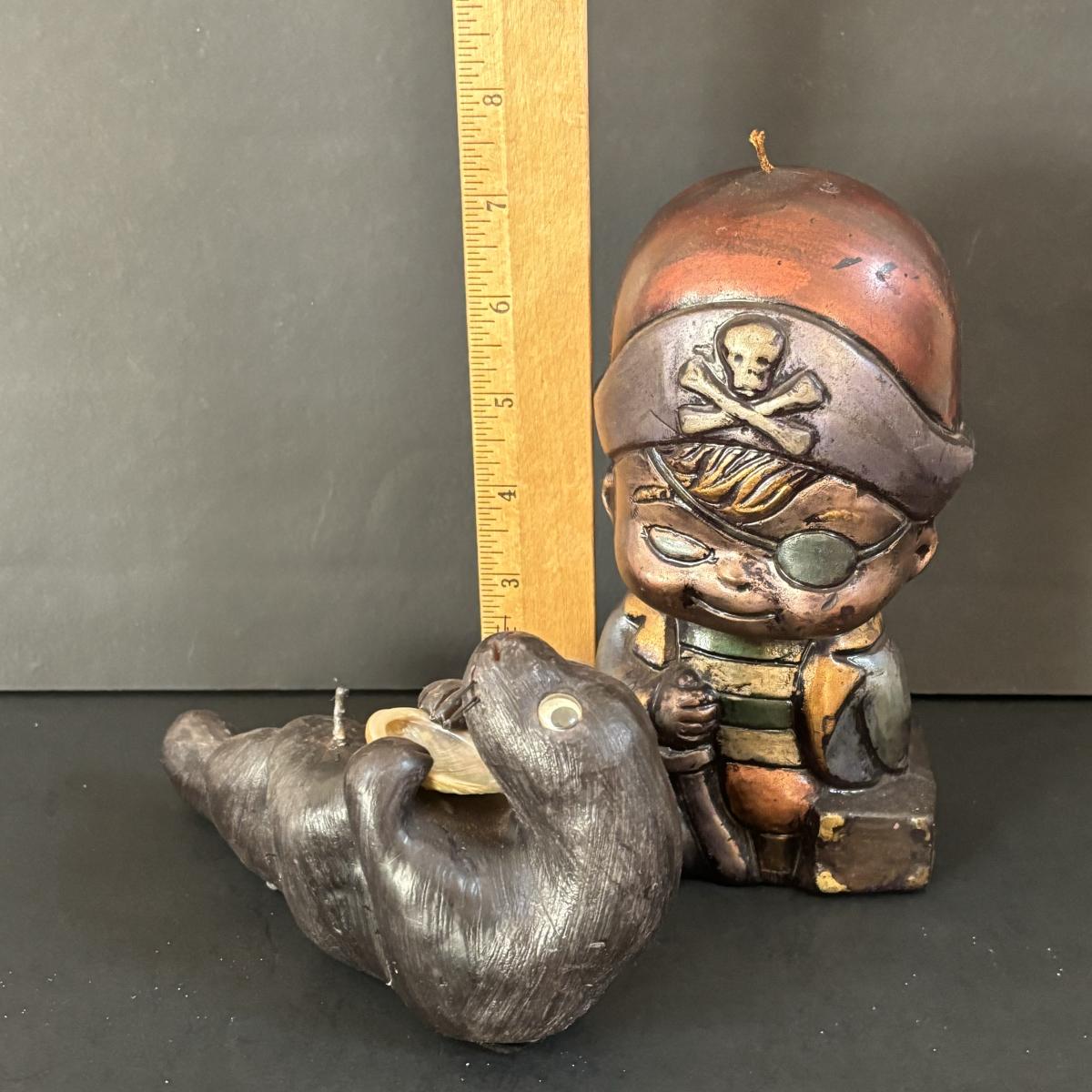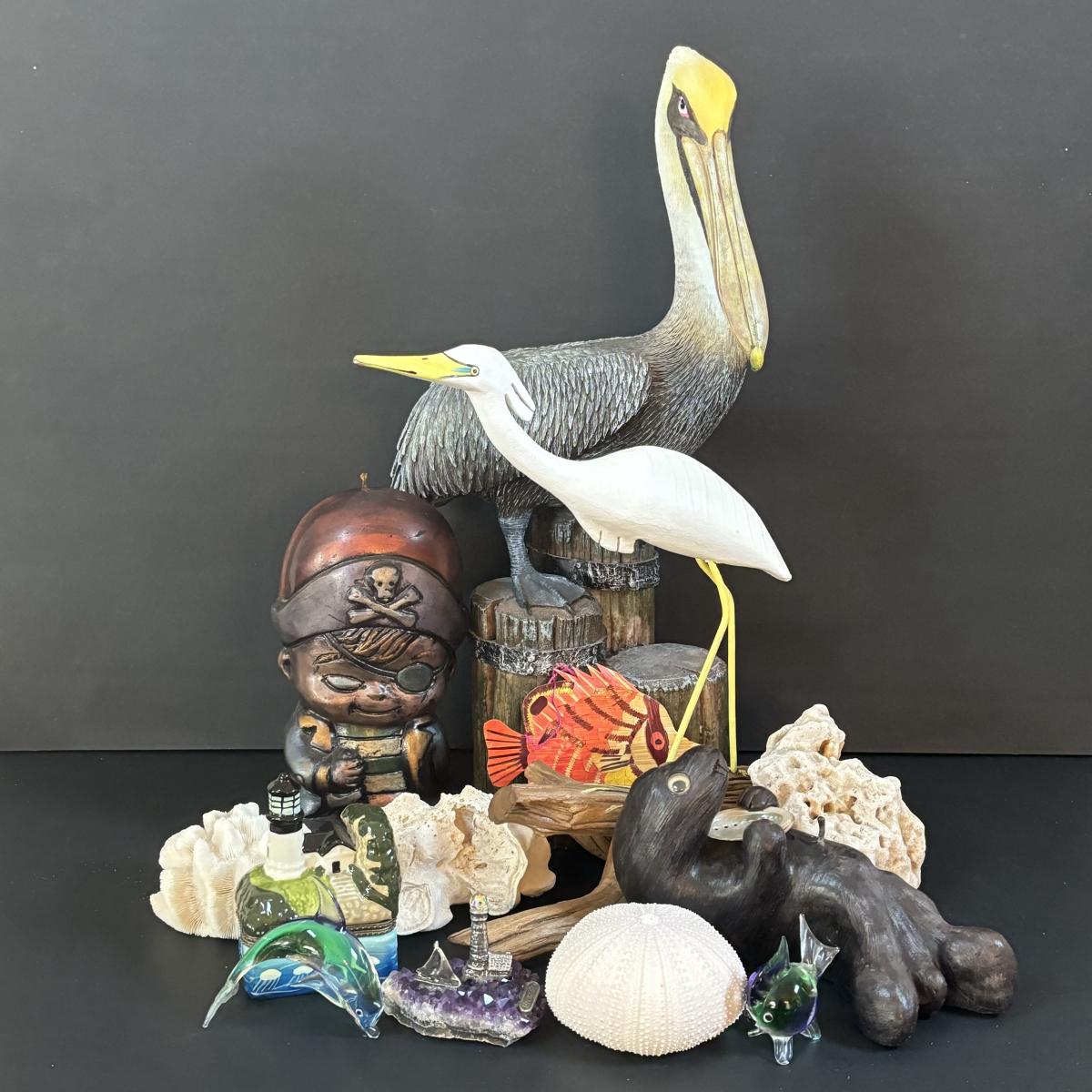 LOT 103: Home Decor: Vintage Candles Pirate & Sea Otter, Wooden Egret Sculpture, Resin Pelican, Coral & More