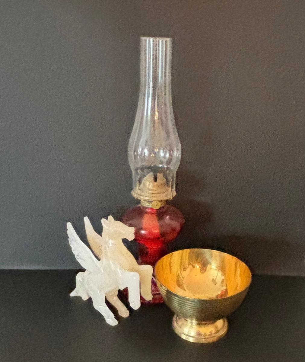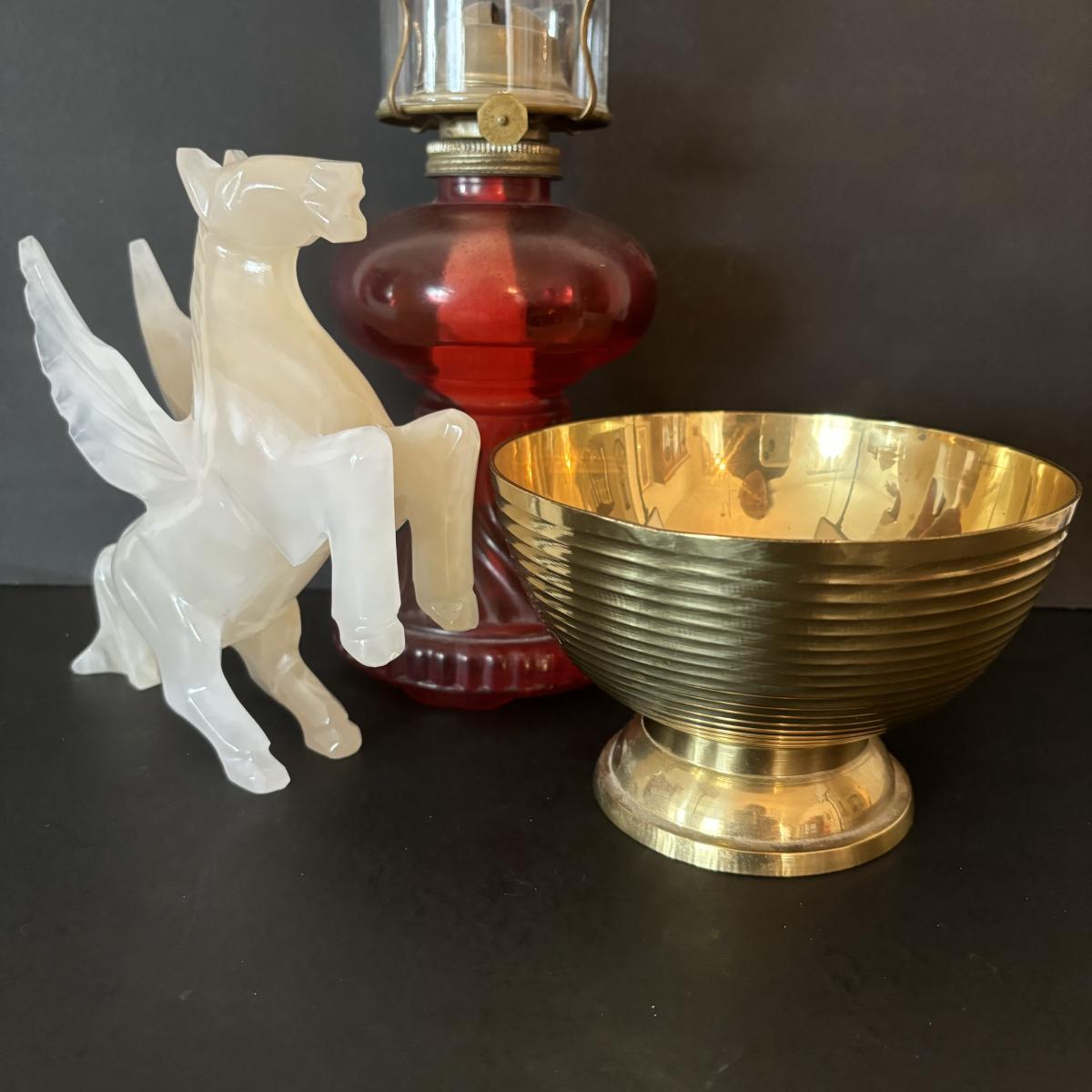 LOT 104: Vintage Oil Lamp, Stone Pegasus and Brass Bowl