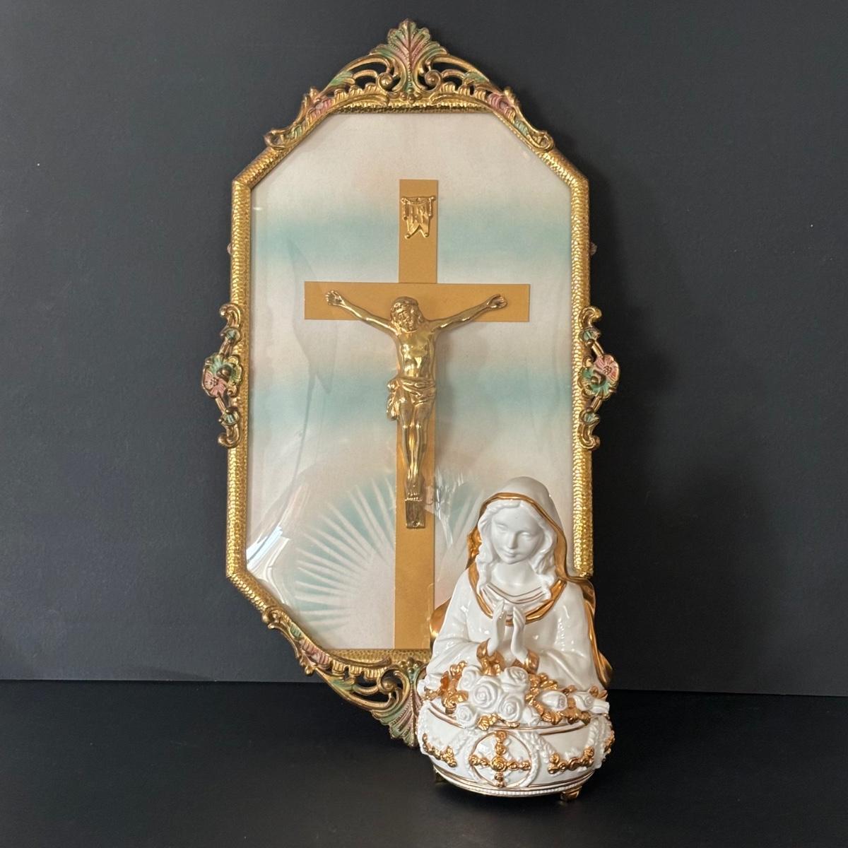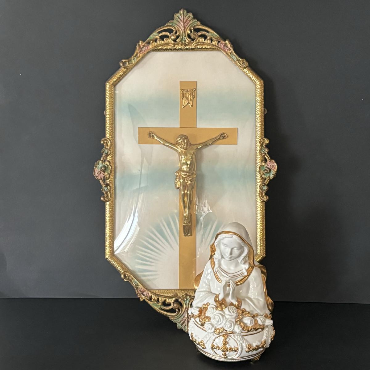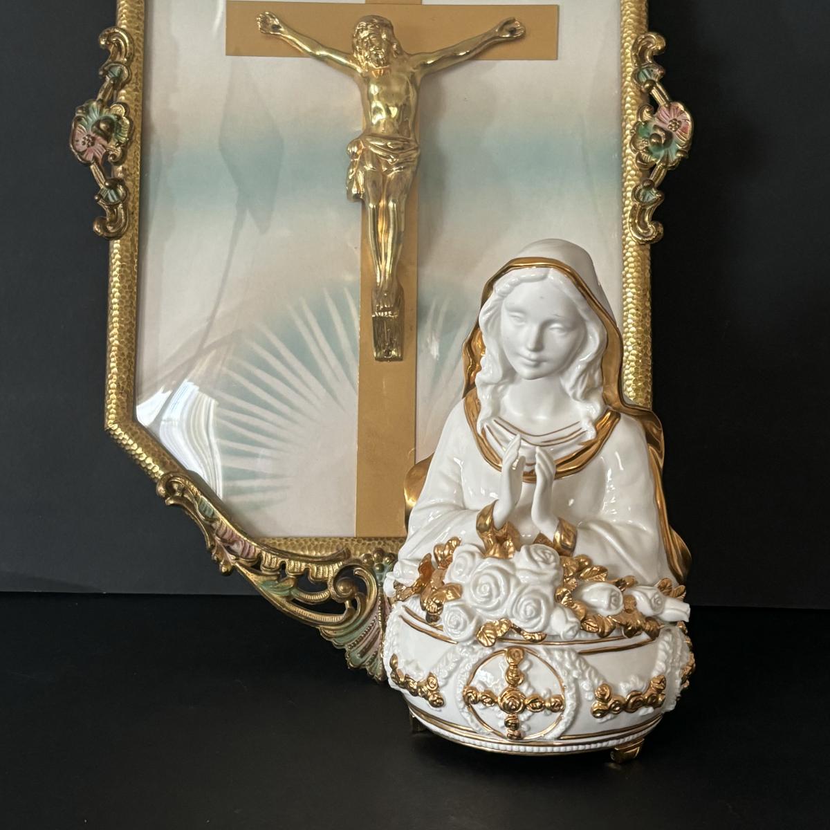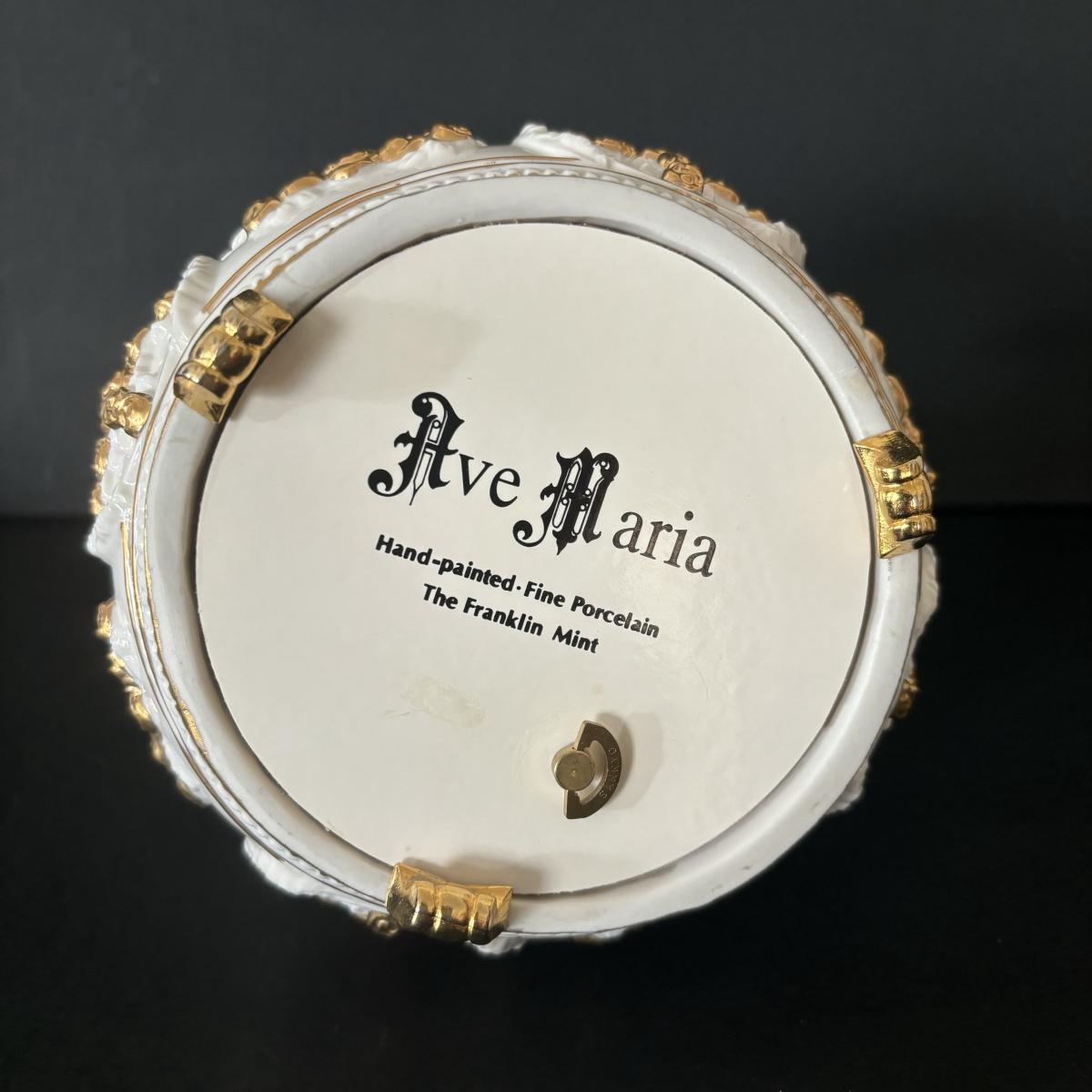LOT 107: Vintage Franklin Mint Ave Maria Hand Painted Porcelain Virgin Mary Music Box & Crucifix in Brass Frame with Convex Bubble Glass