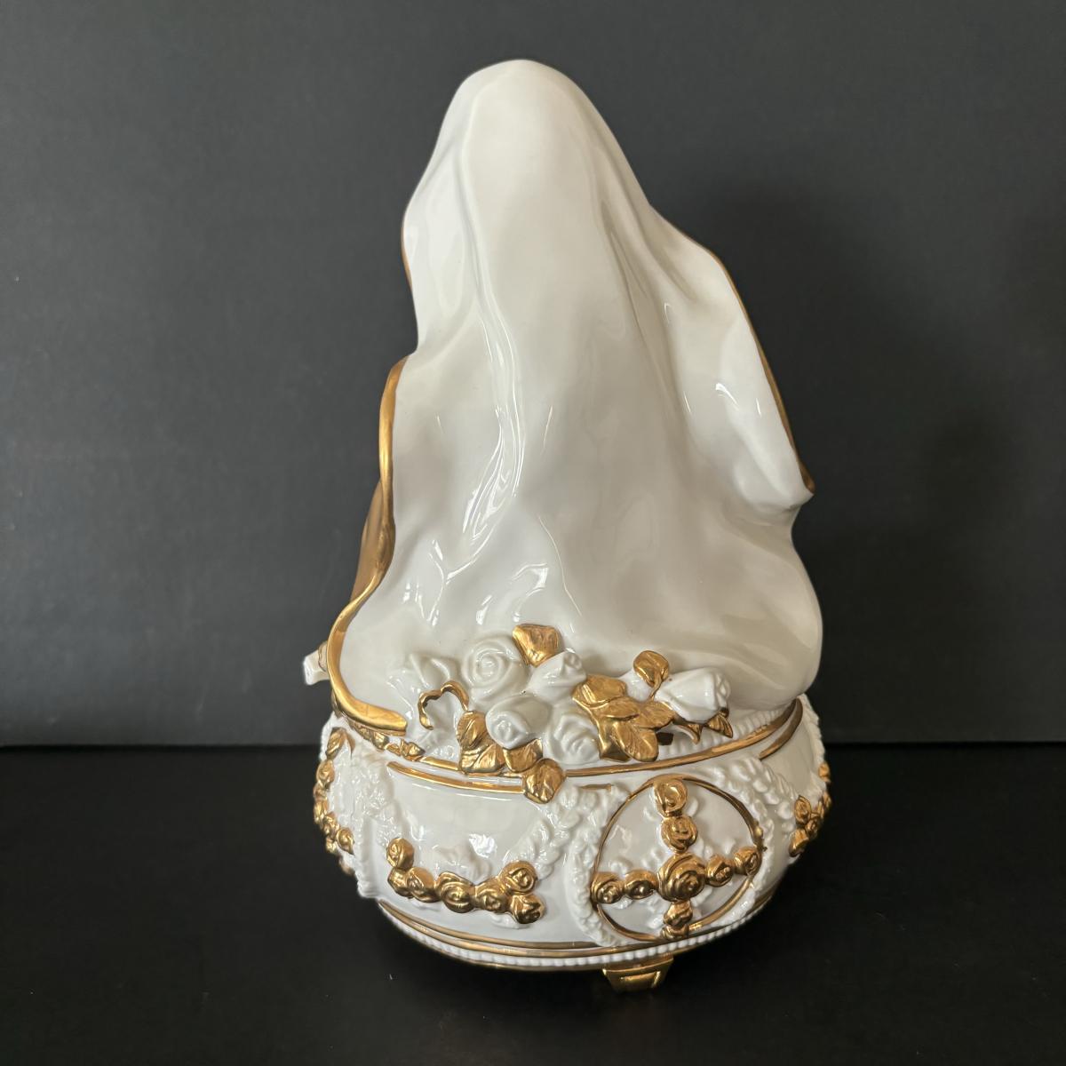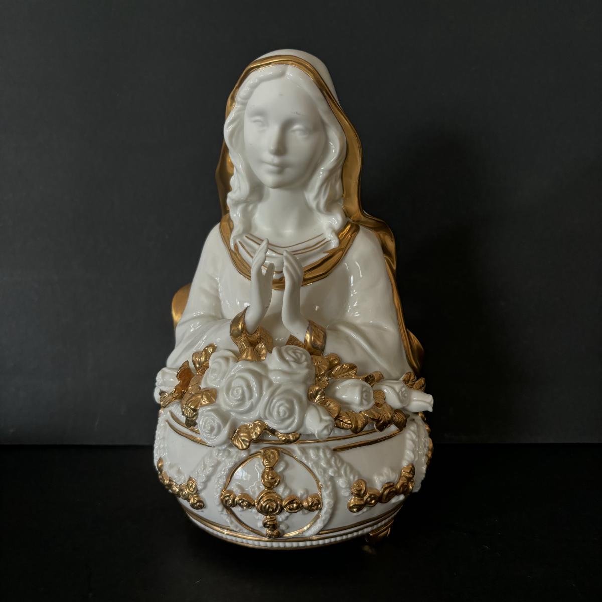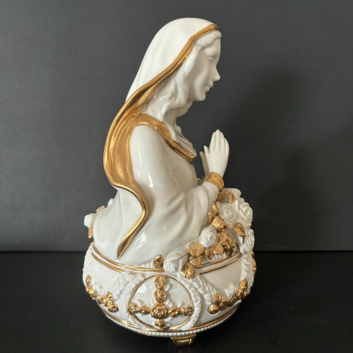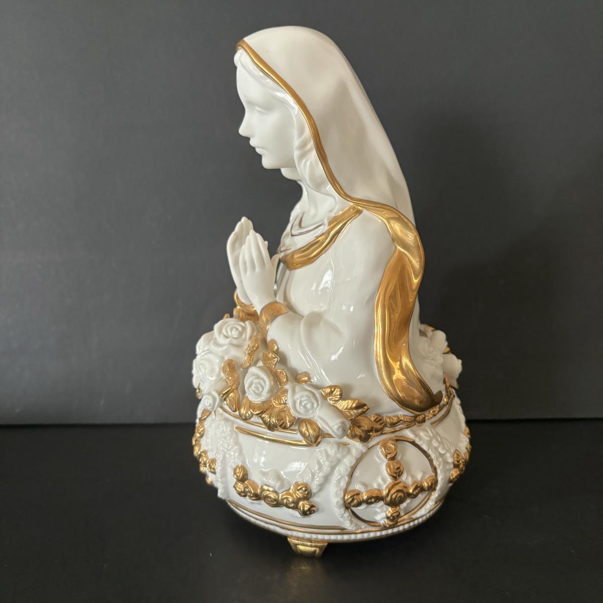 LOT 107: Vintage Franklin Mint Ave Maria Hand Painted Porcelain Virgin Mary Music Box & Crucifix in Brass Frame with Convex Bubble Glass