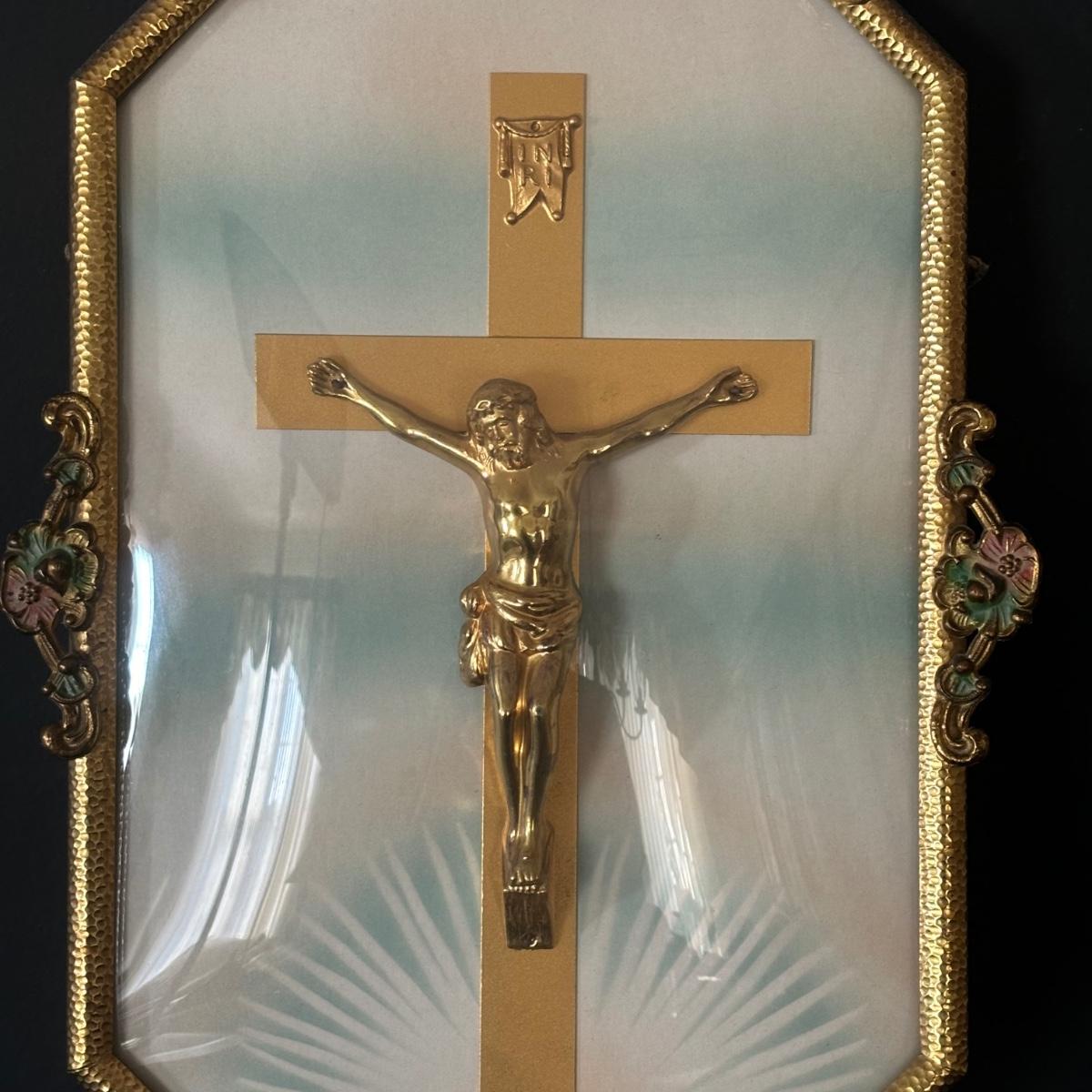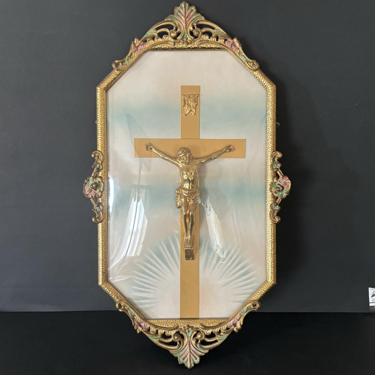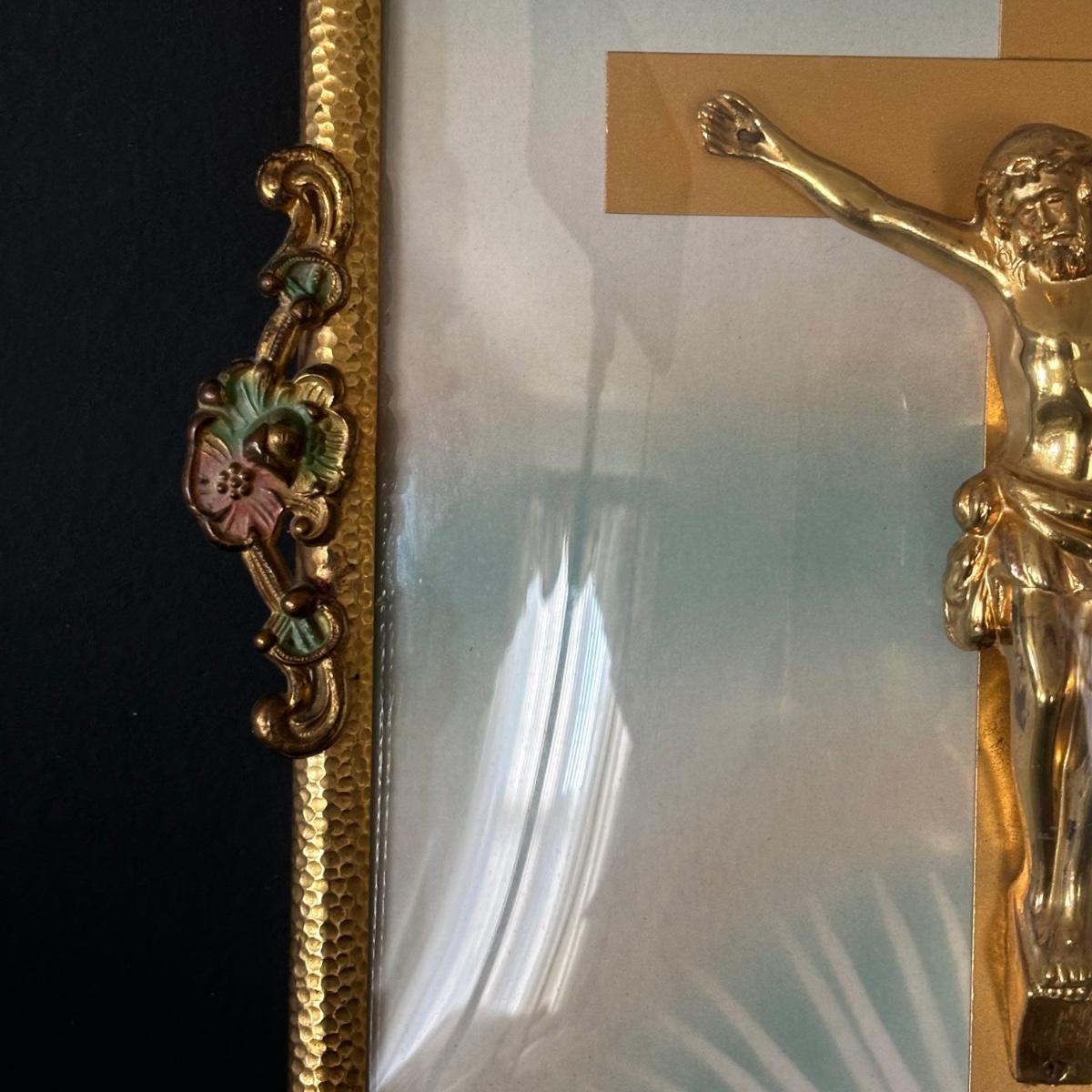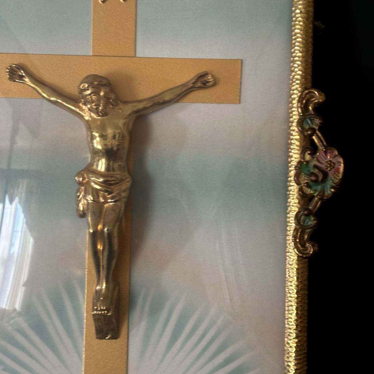 LOT 107: Vintage Franklin Mint Ave Maria Hand Painted Porcelain Virgin Mary Music Box & Crucifix in Brass Frame with Convex Bubble Glass