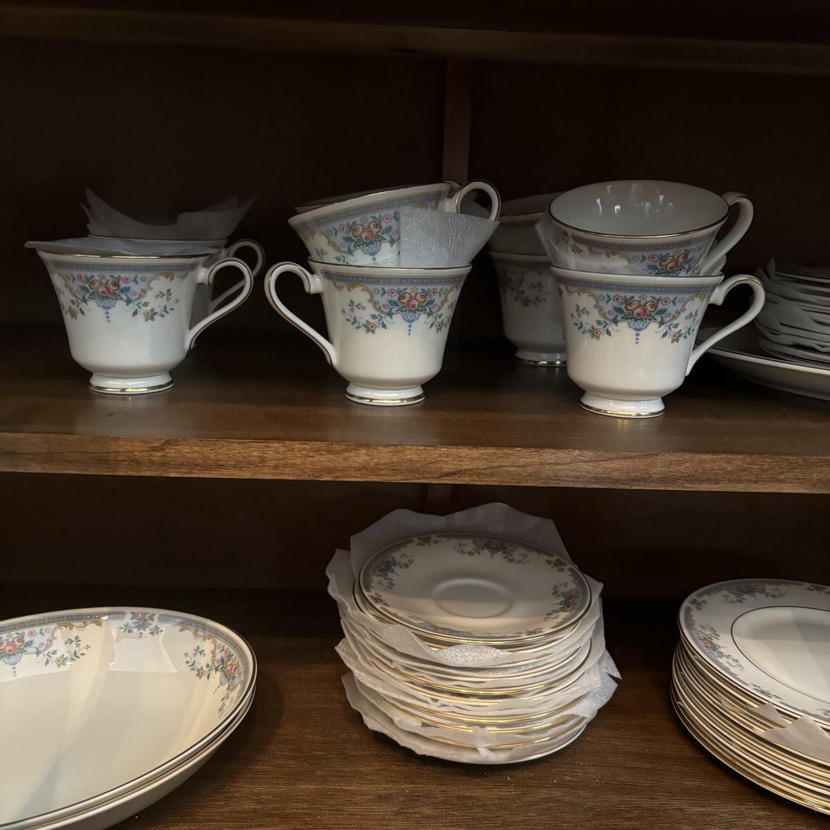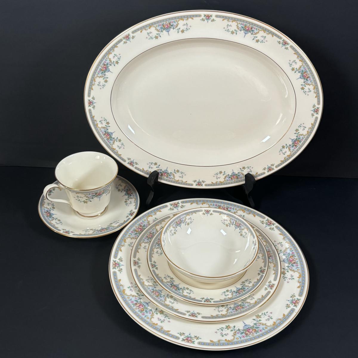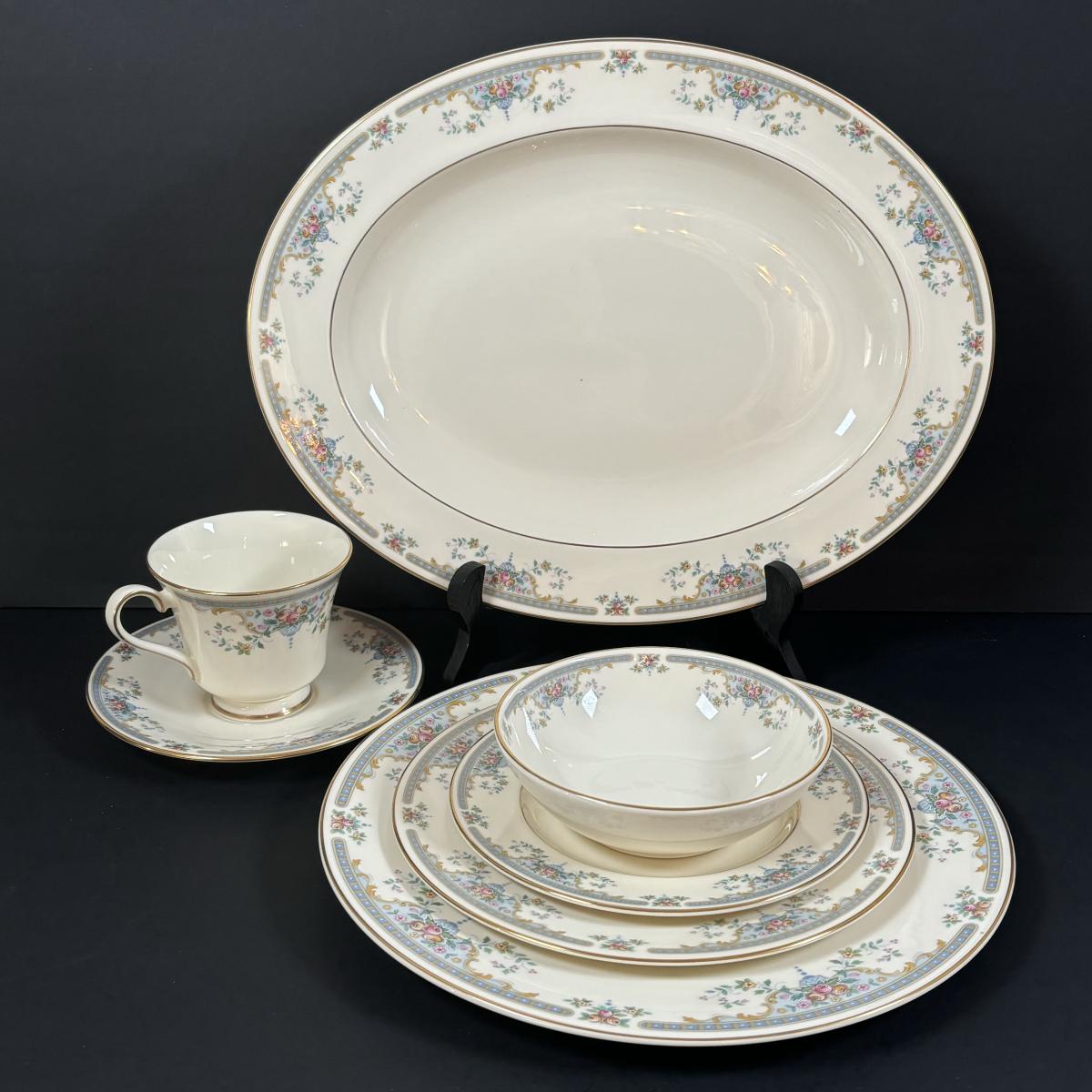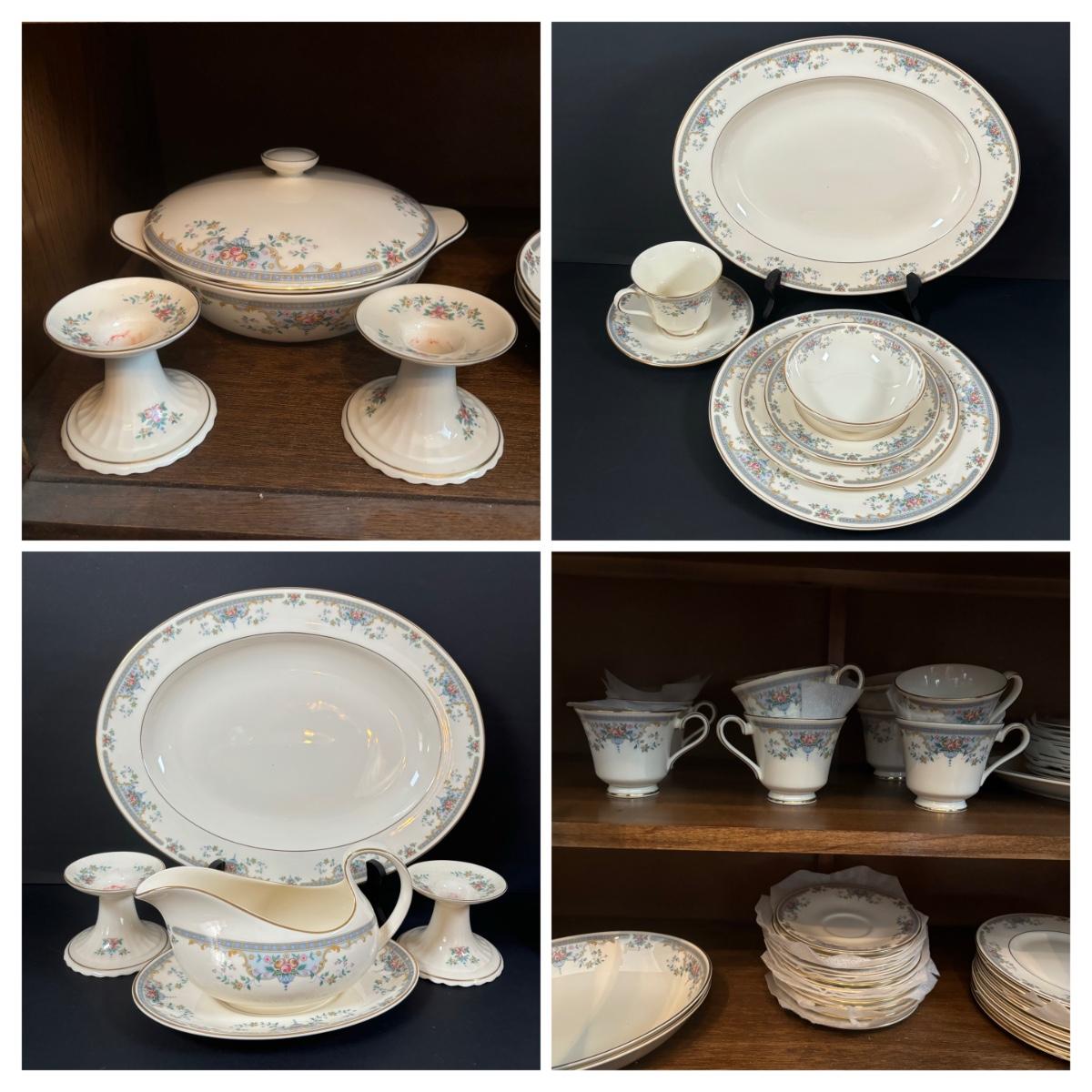 Service for 10: dinner plates, small bowls, dessert plates, salad plates, cups & saucers.