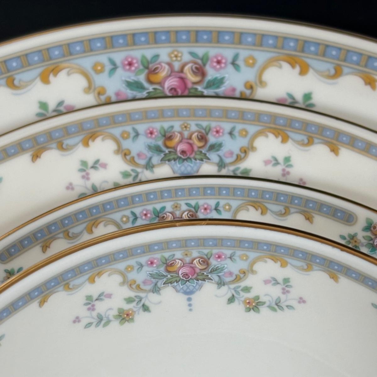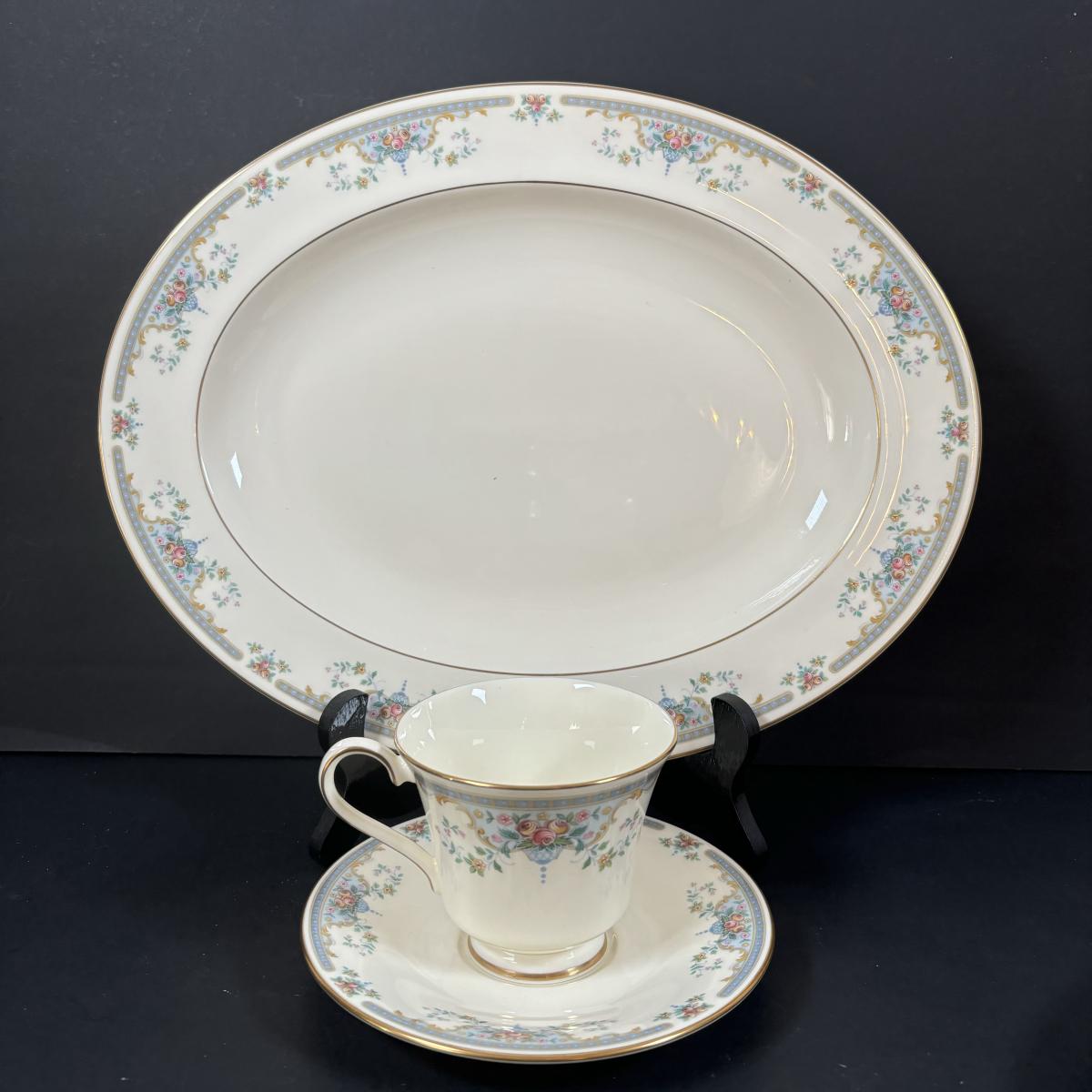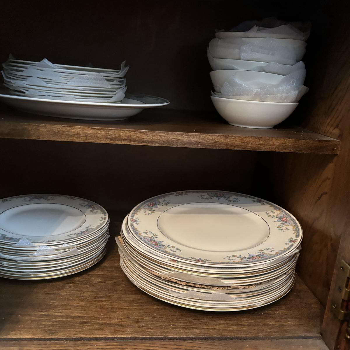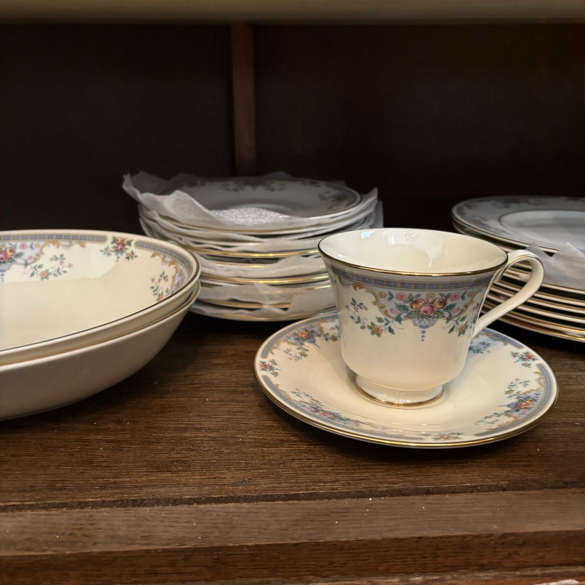 Service for 10: dinner plates, small bowls, dessert plates, salad plates, cups & saucers.