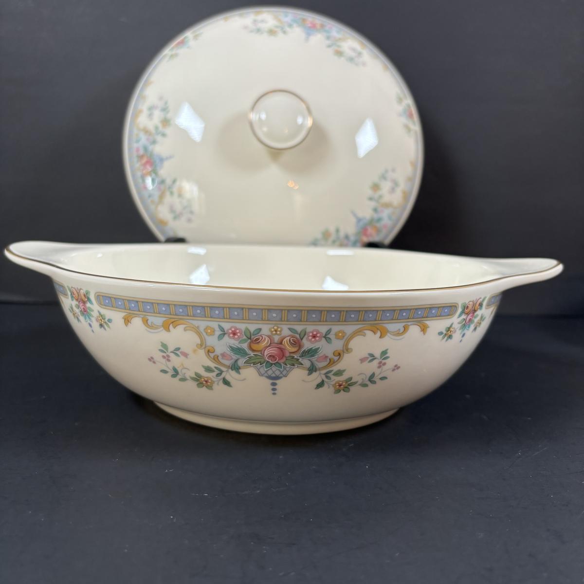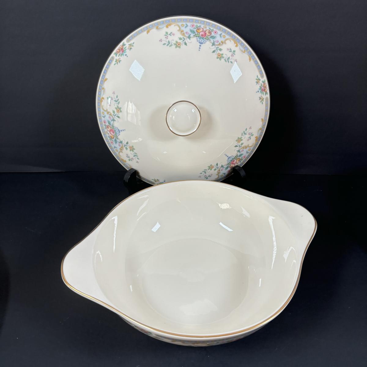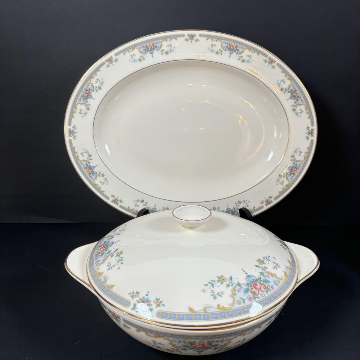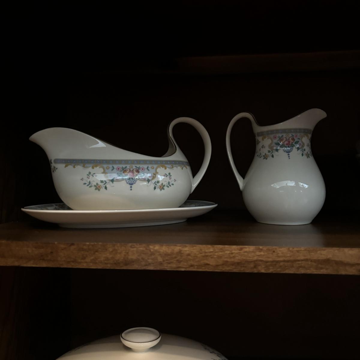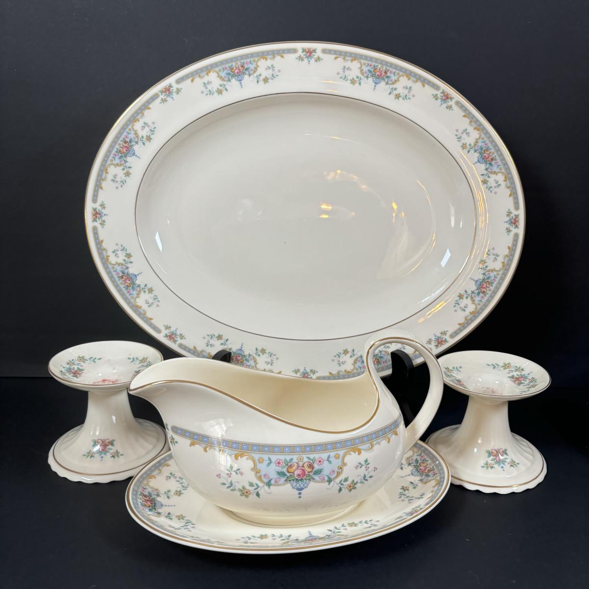 2 serving bowls, gravy boat, covered dish, candle stick, creamer/pitcher and serving platter