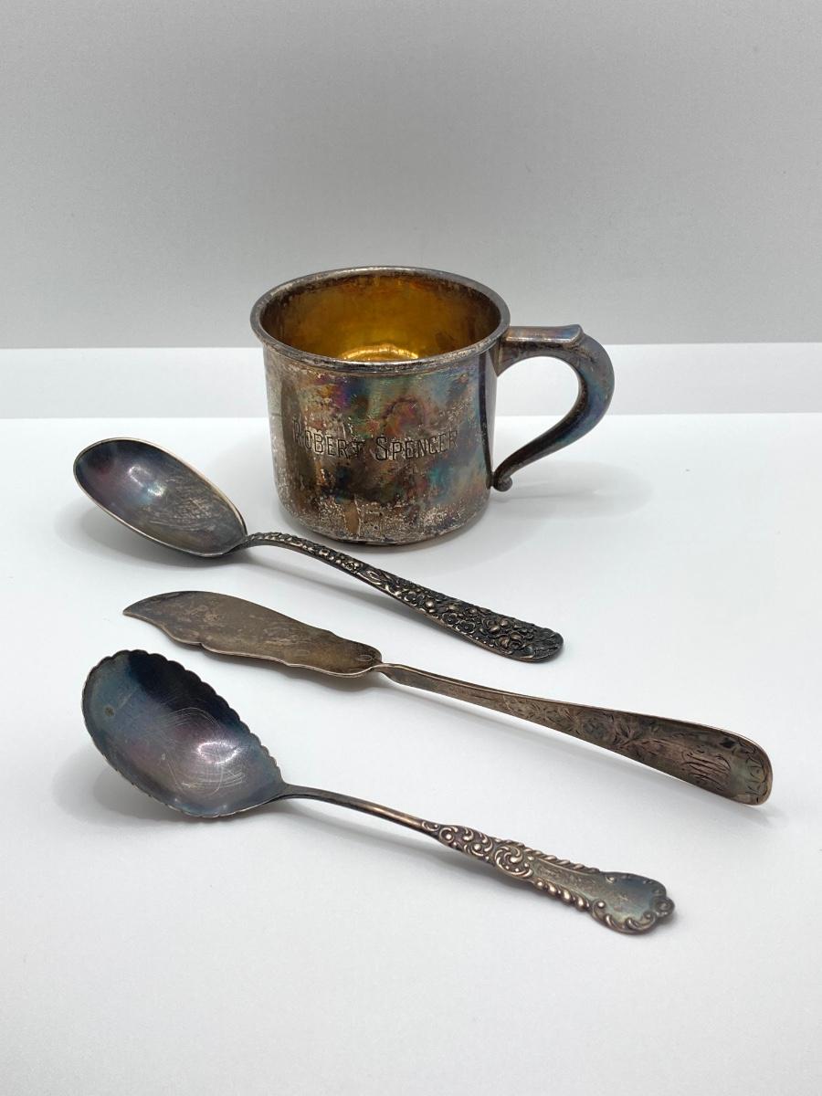 LOT 142: Antique / Vintage Sterling Silver Cup and Utensils