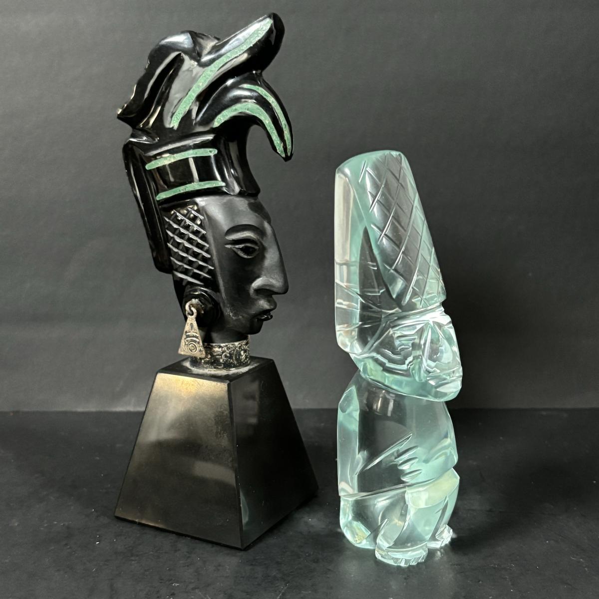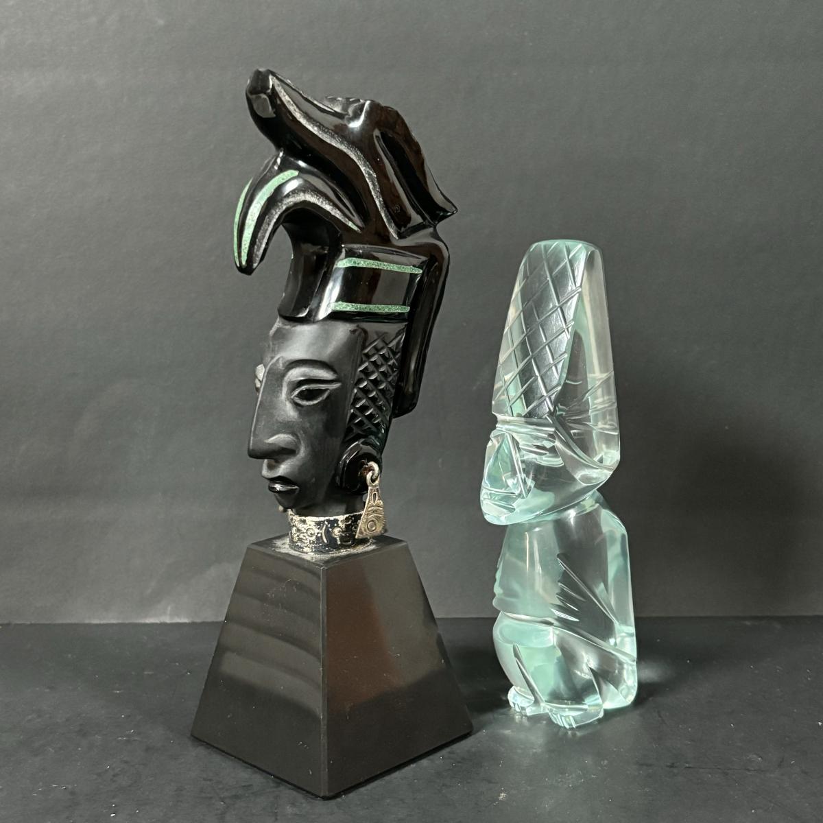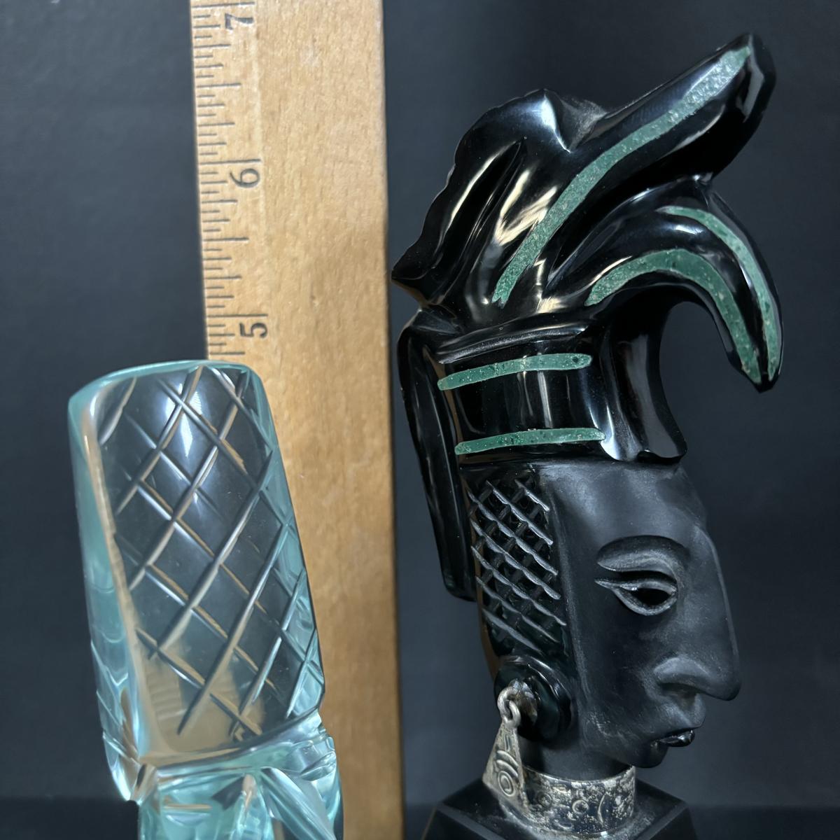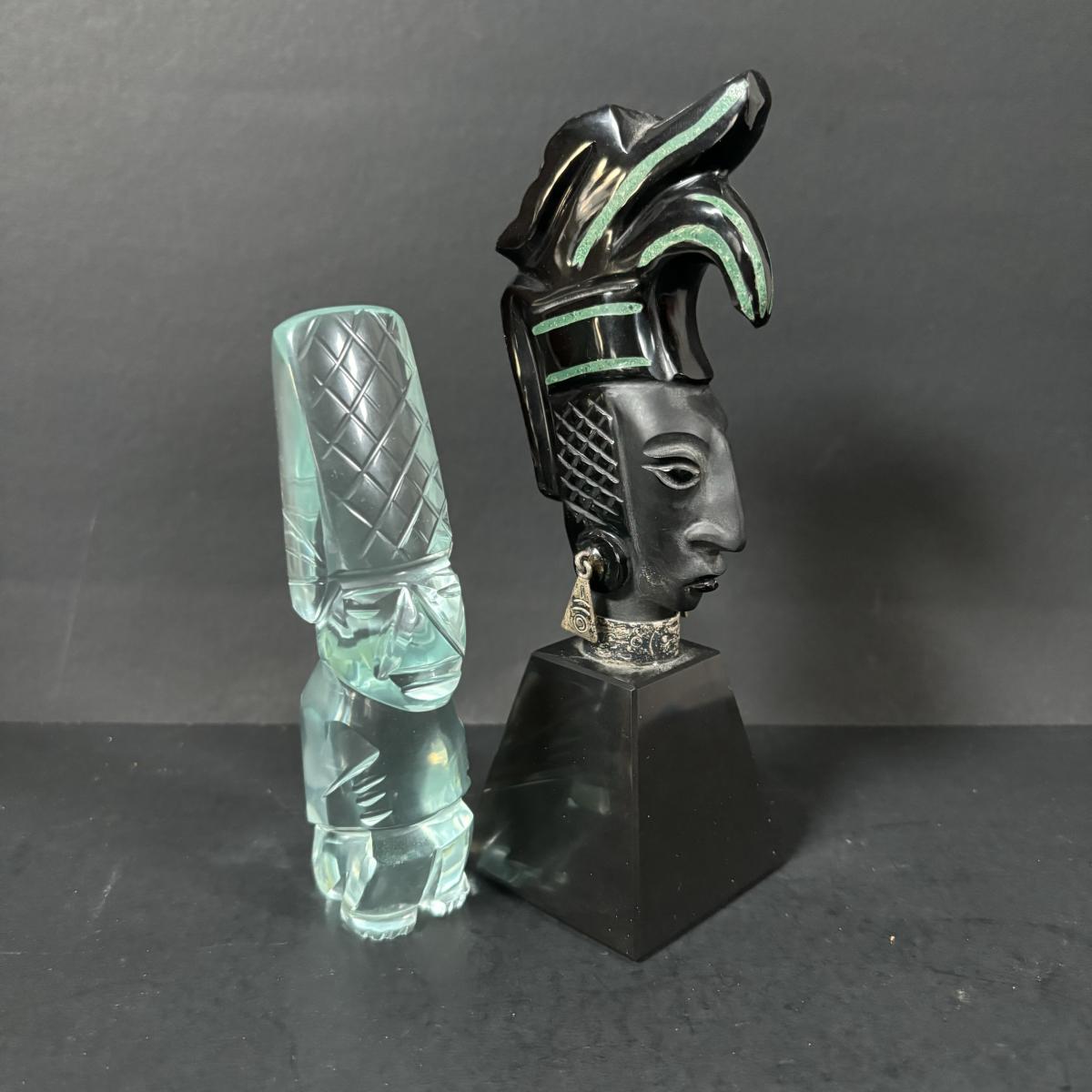 LOT 199: Stone/Onyx Aztex Warrior Sculpture & Aztec/Mayan Glass Paperweight Statue