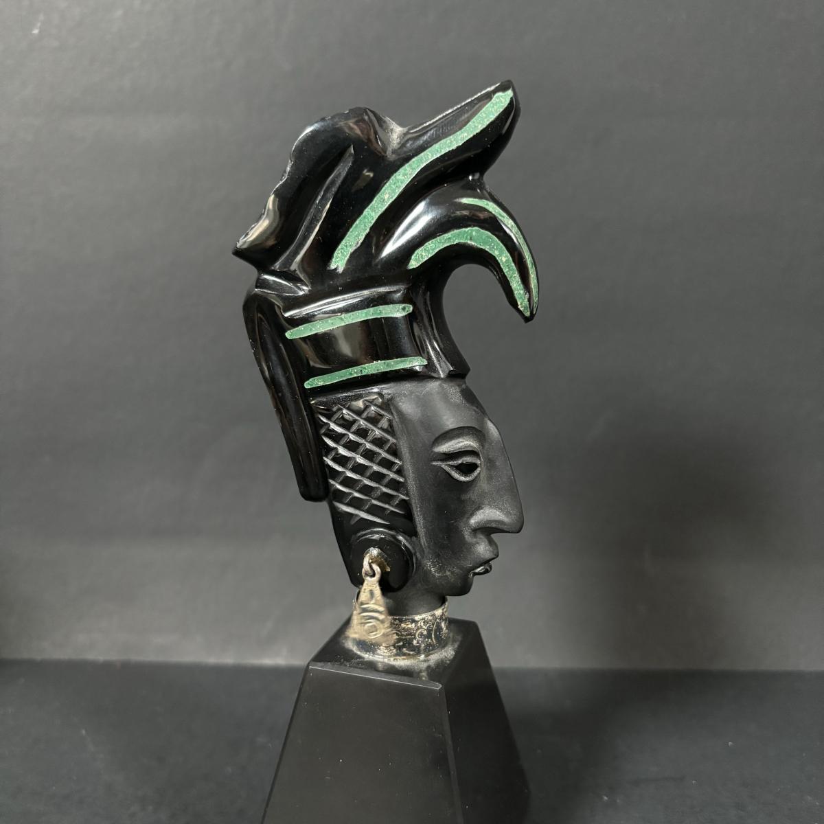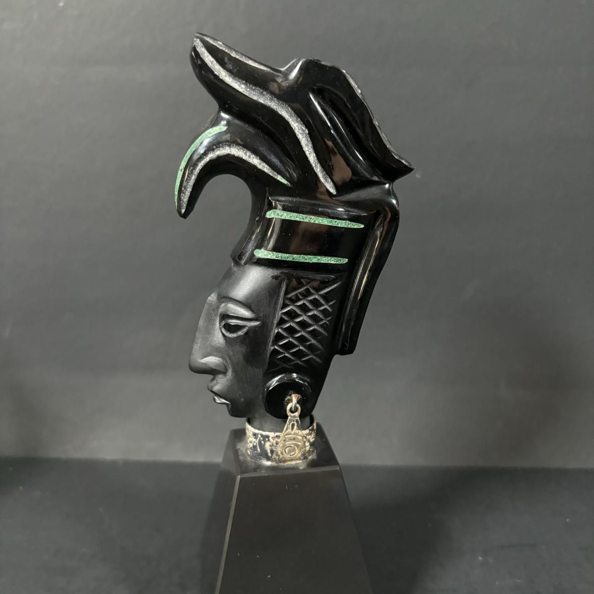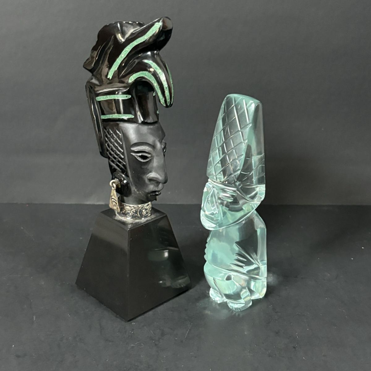 LOT 199: Stone/Onyx Aztex Warrior Sculpture & Aztec/Mayan Glass Paperweight Statue
