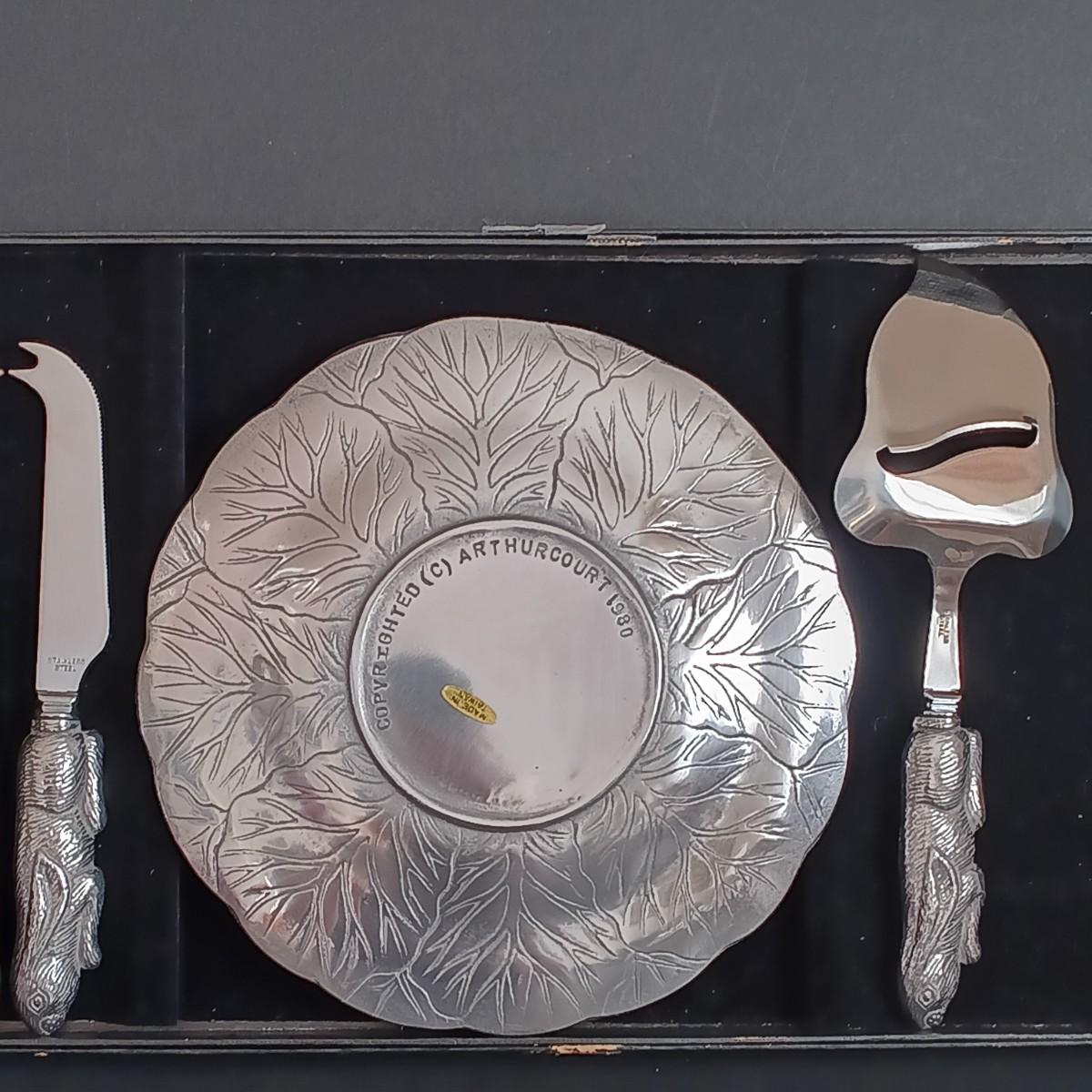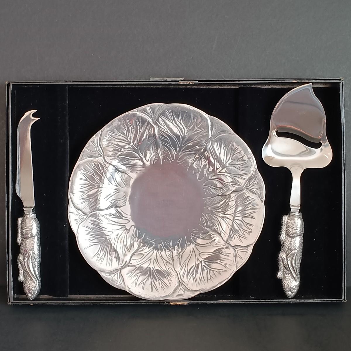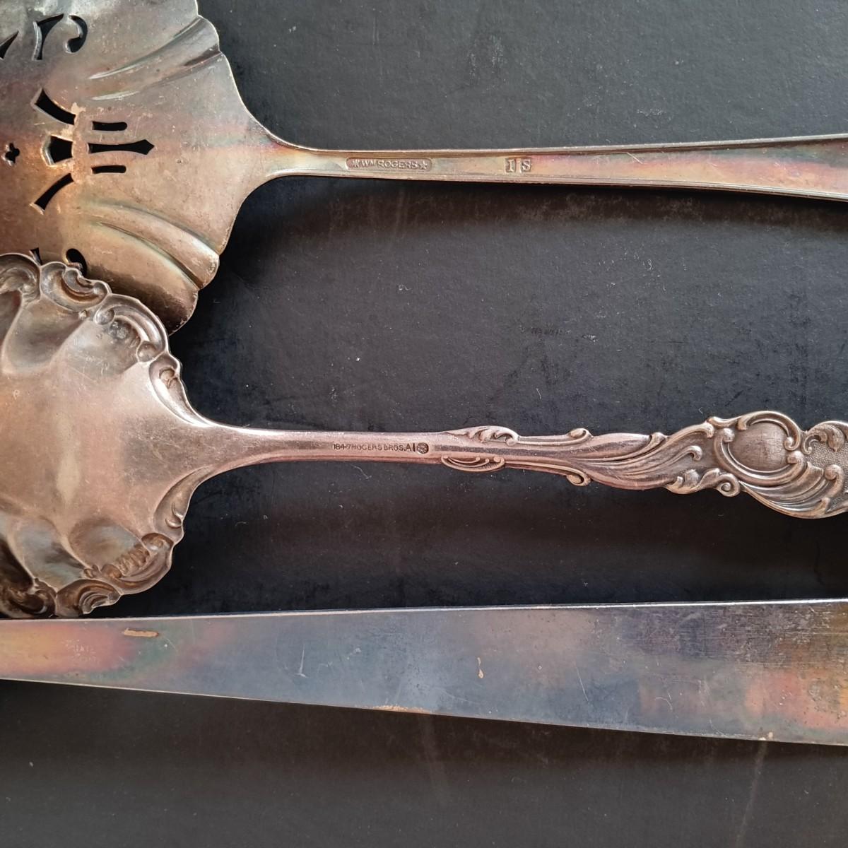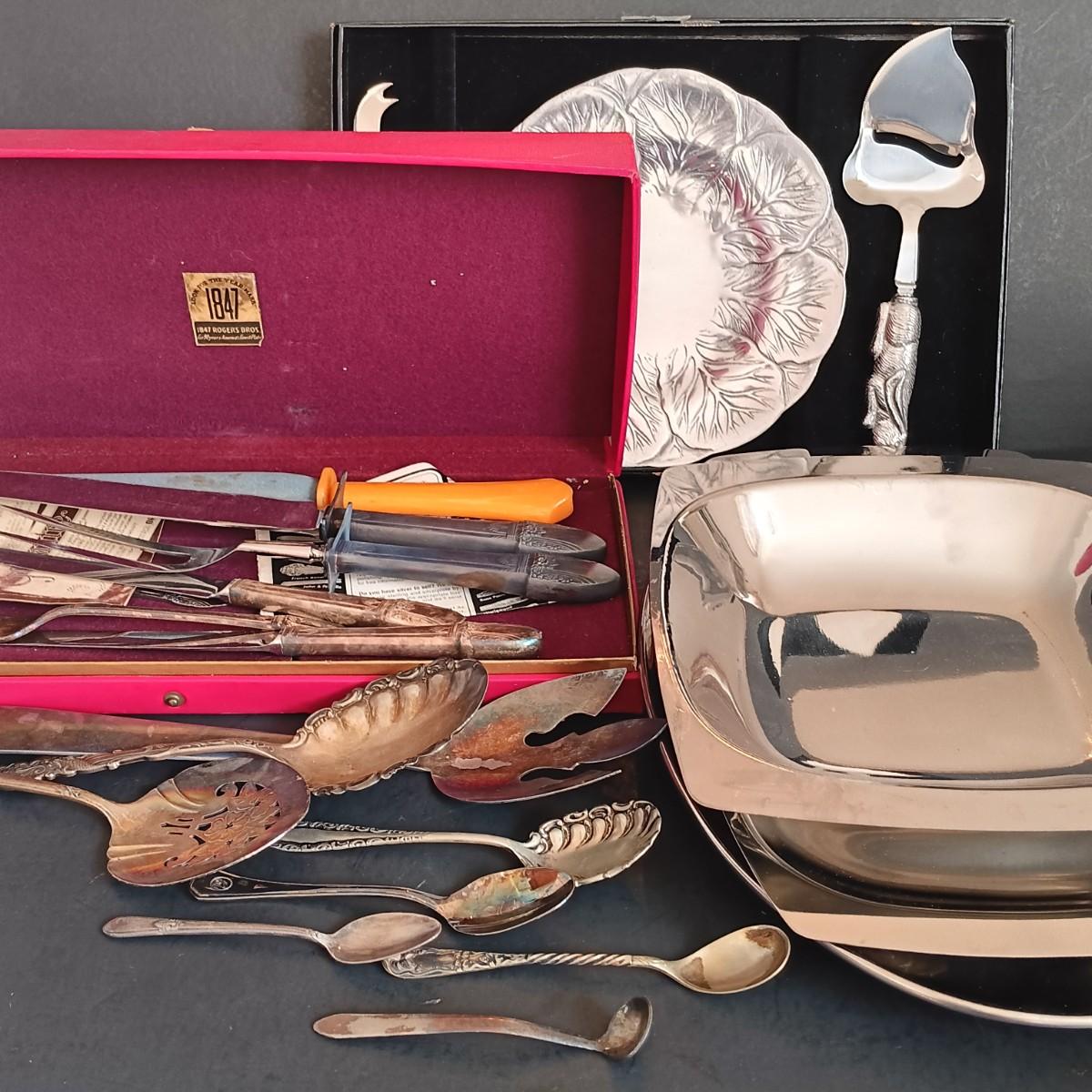 LOT 163: 1847 Roger's Bros Silverplate, Arthur Court 1980 Rabbit Serving Set, Miscellaneous Silverplate Utensils & Stainless Steel Platters