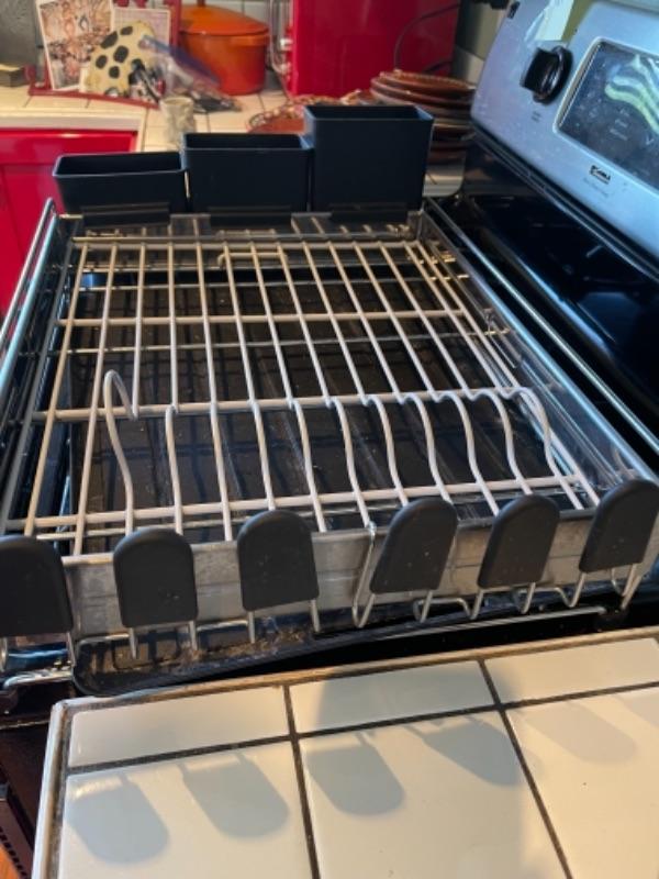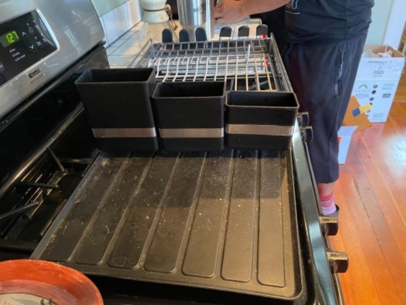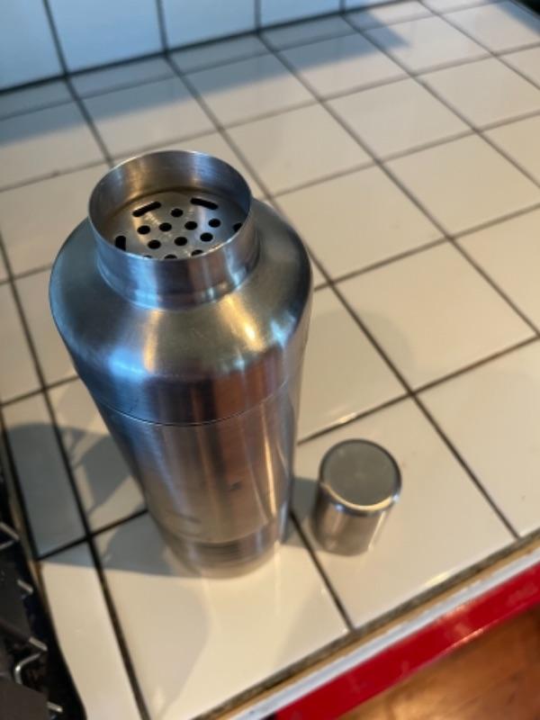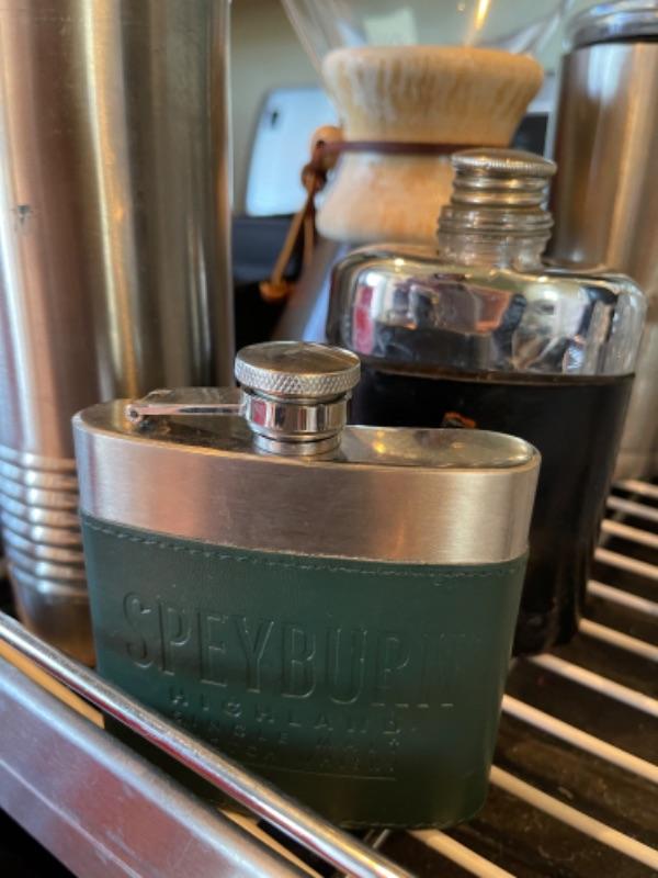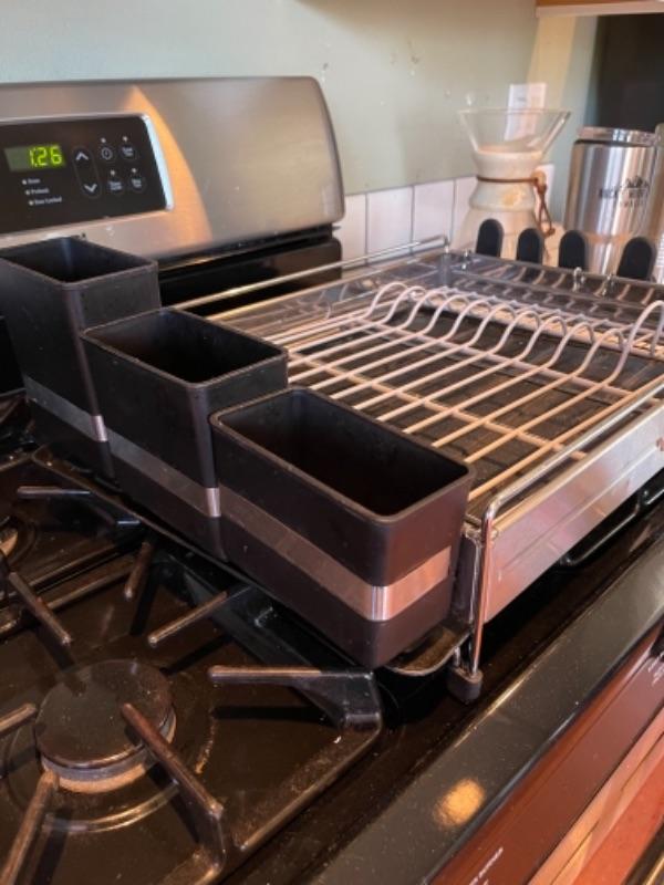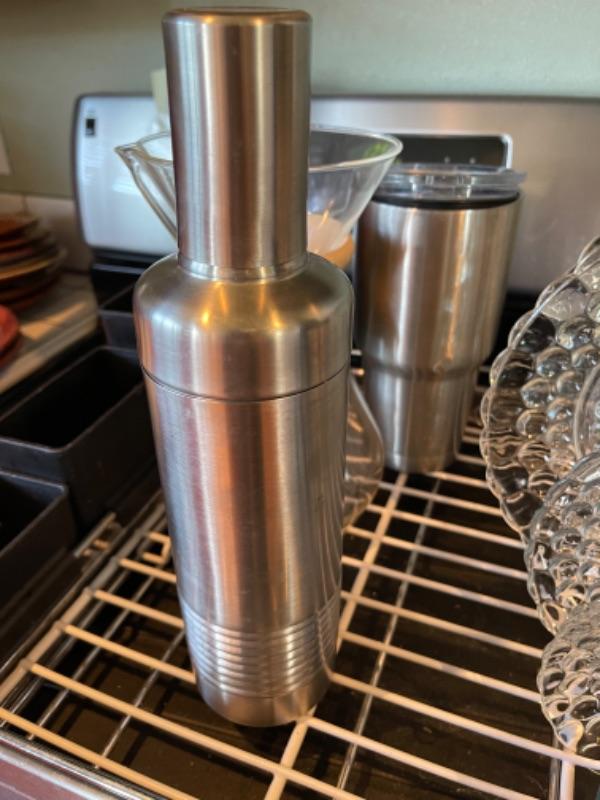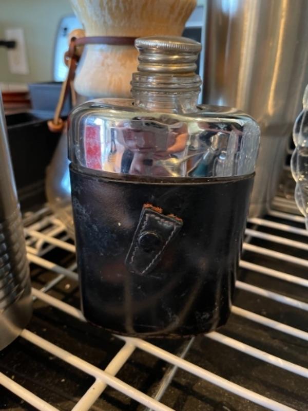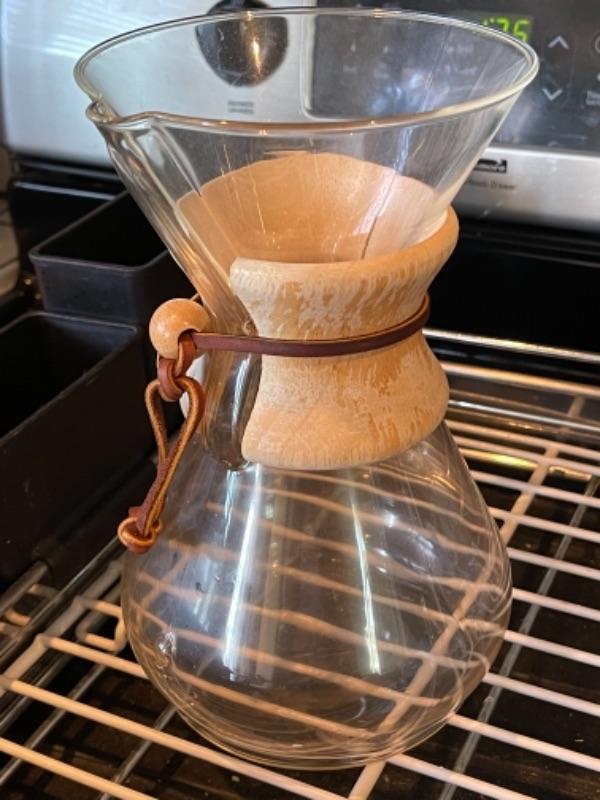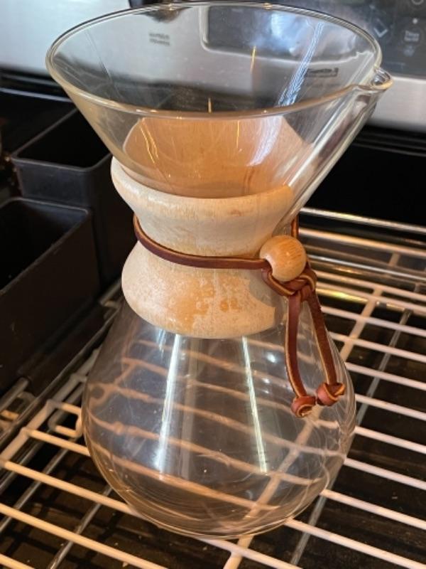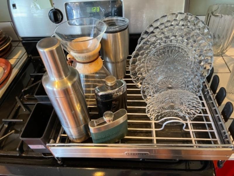 Lot 108K. Four glass plates, two stainless steel flasks, cocktail shaker, large insulated coffee tumbler, one dish drainer, one Chemex pour-over glass coffee maker with wood collar--$65