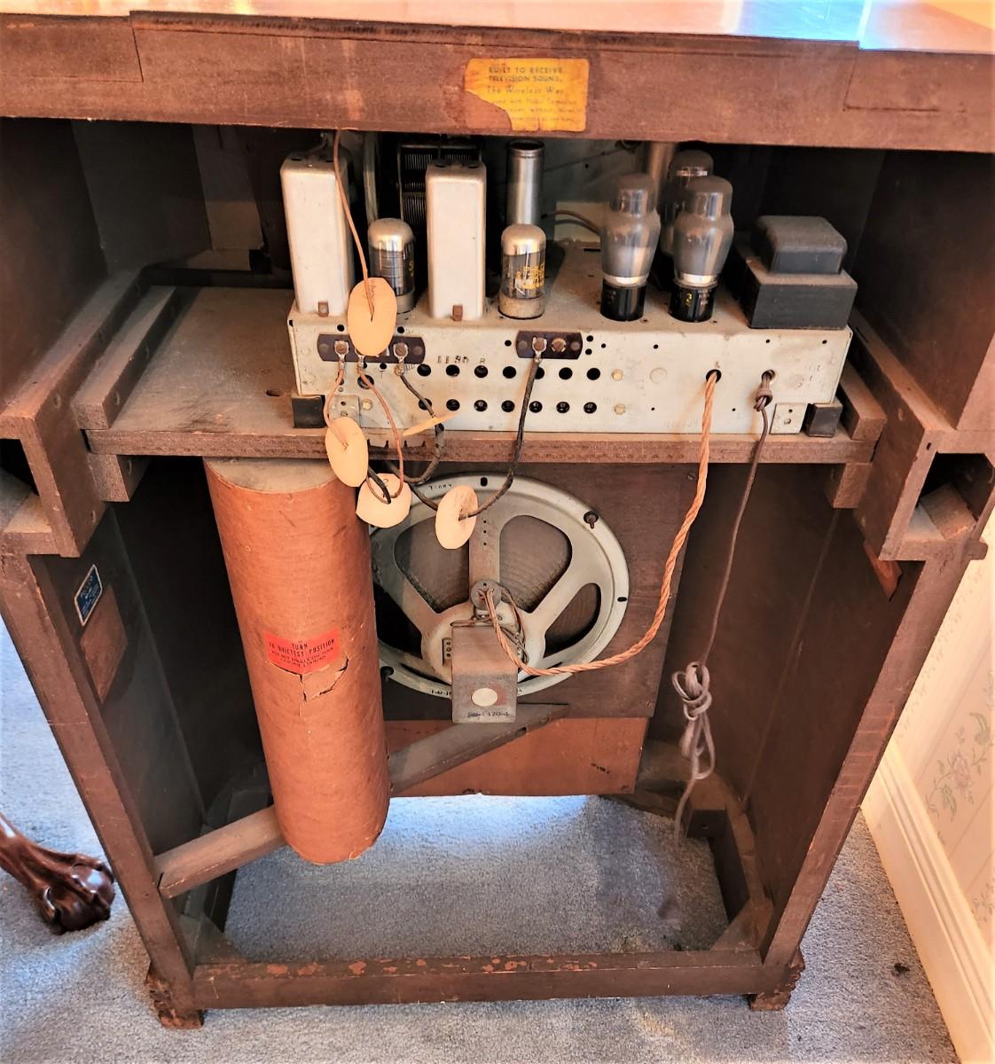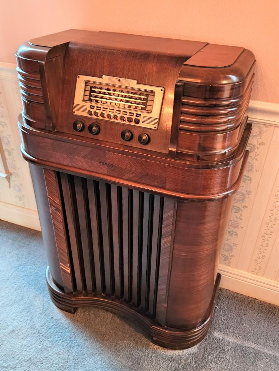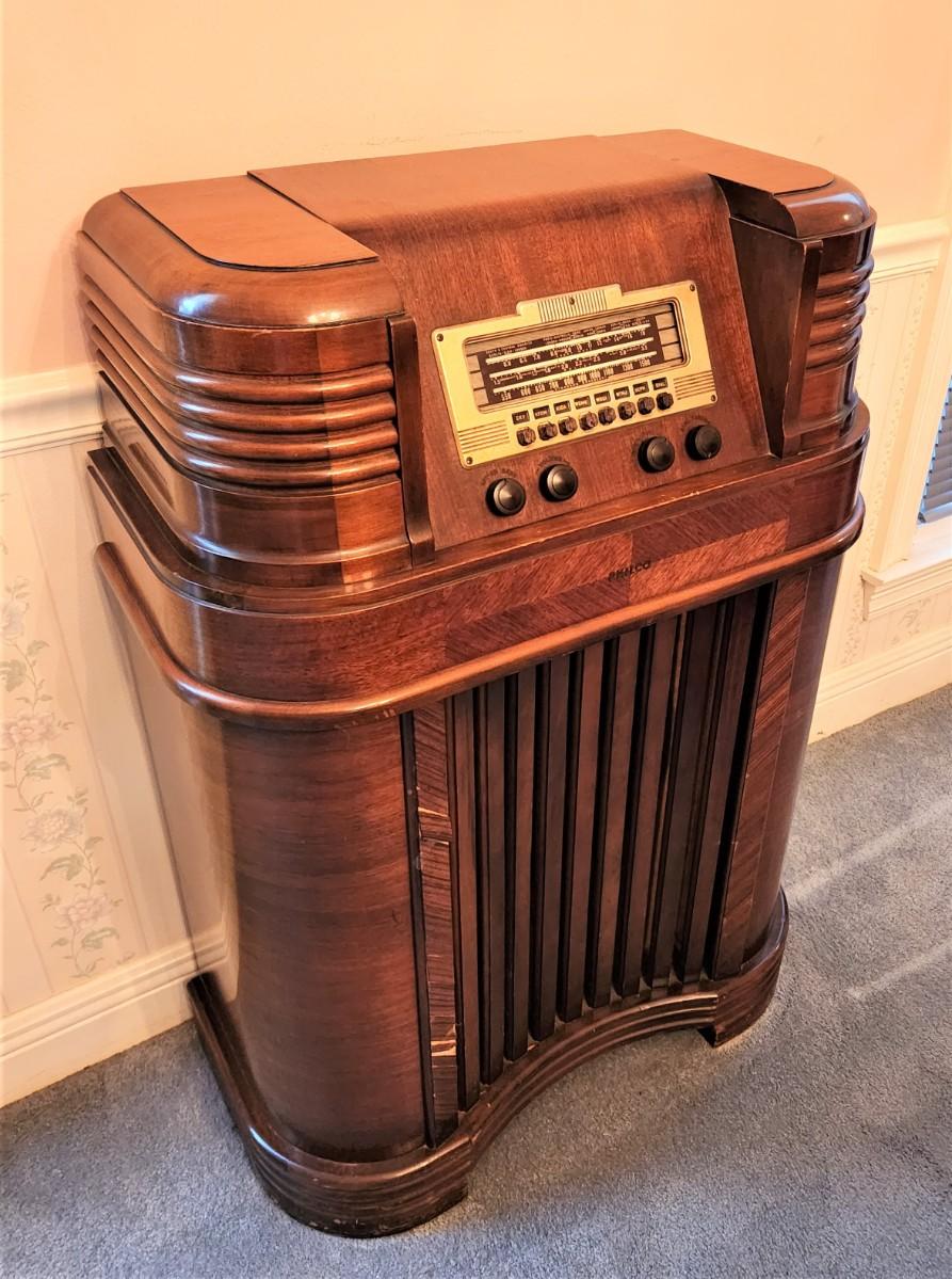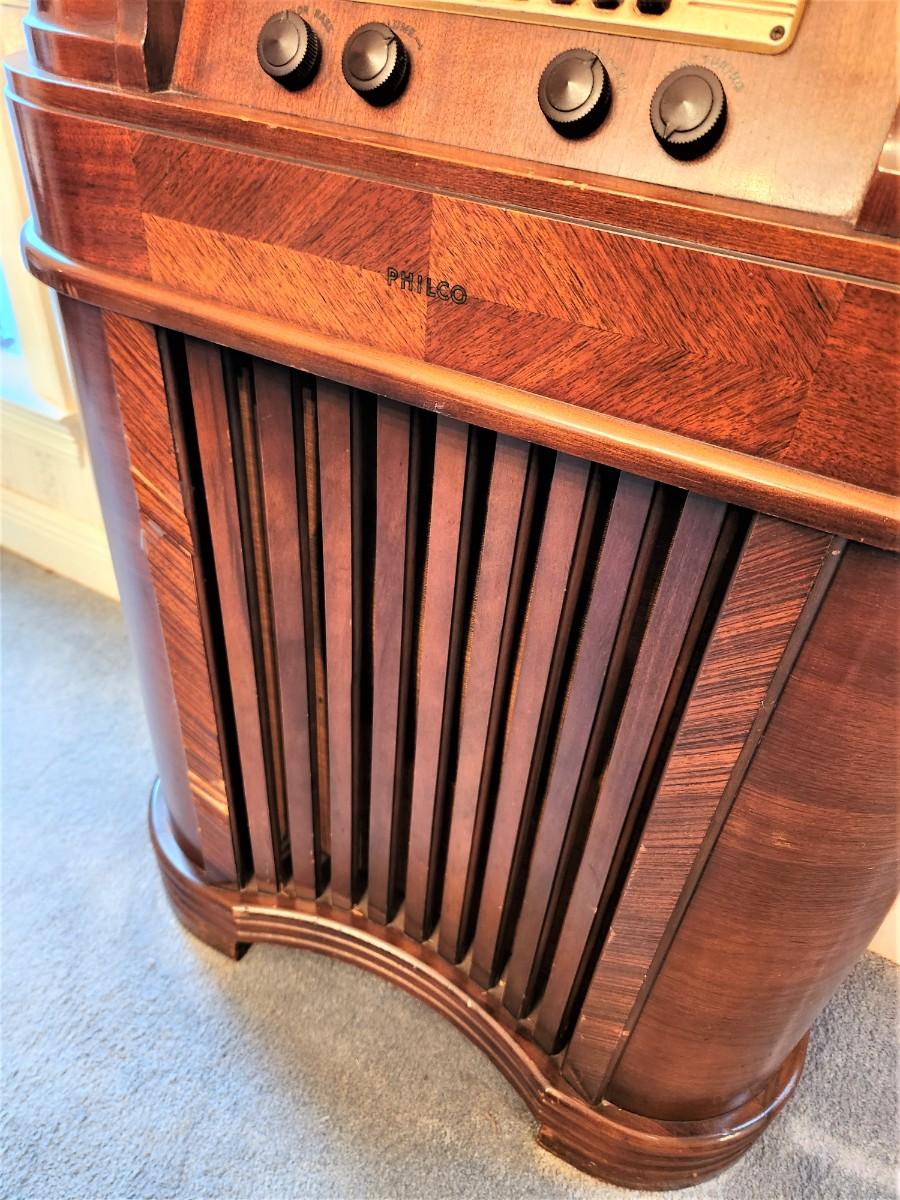 Antique radio by PHILCO - powers up - we were able to tune in 1 station - front of cabinet a little chippy, all original. Philco Model 40-180, from the 1940's. 27" across, 39.5" tall.