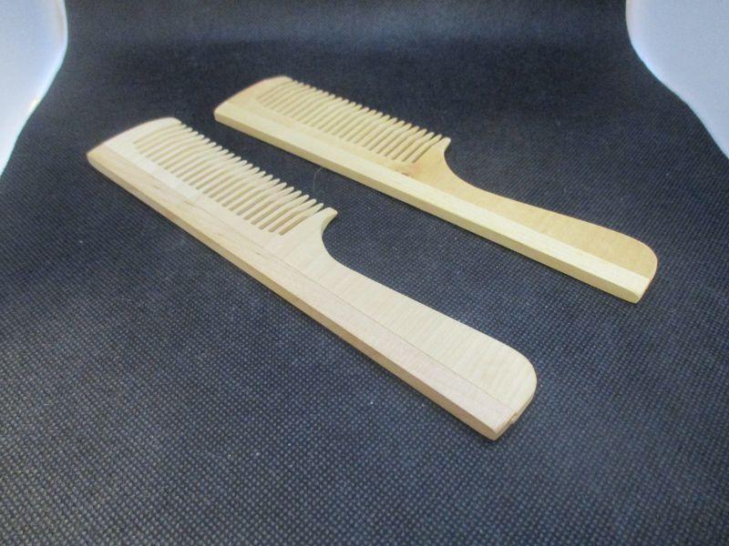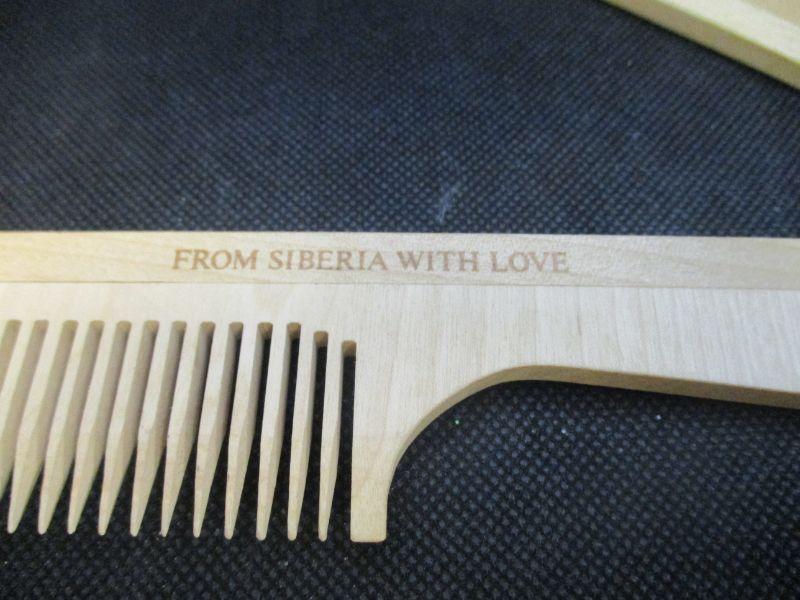 Both of the combs are marked "From Siberia With Love". They don't appear to have ever been used and are all wood. They are each about 7.5" in length.