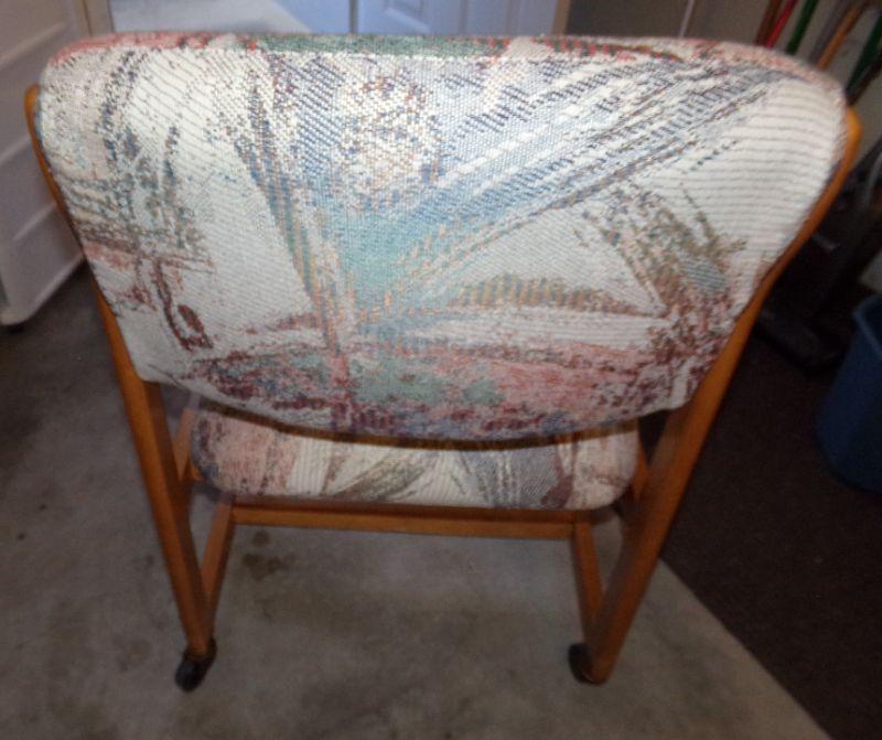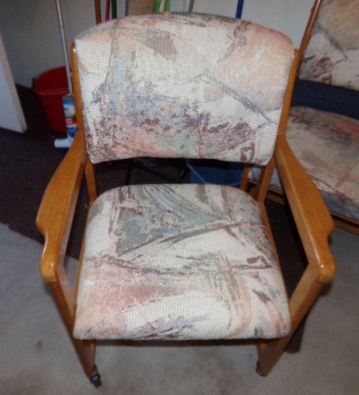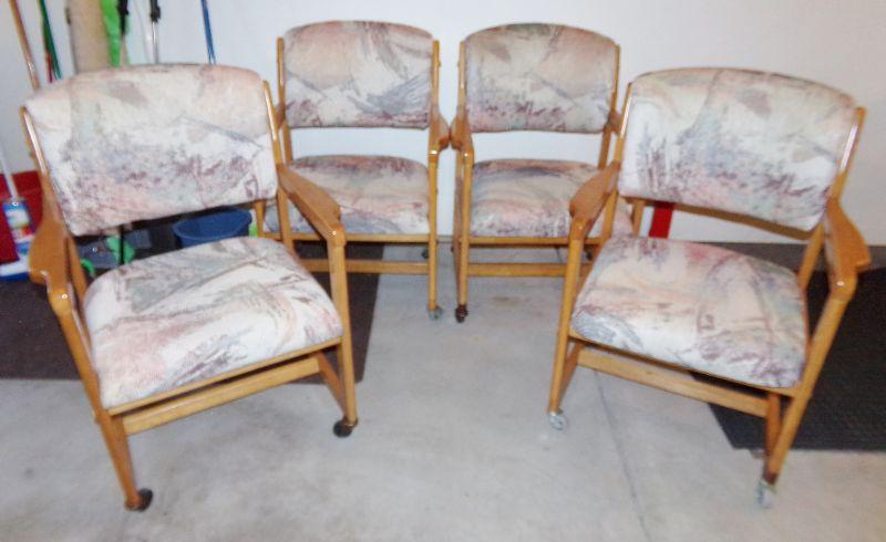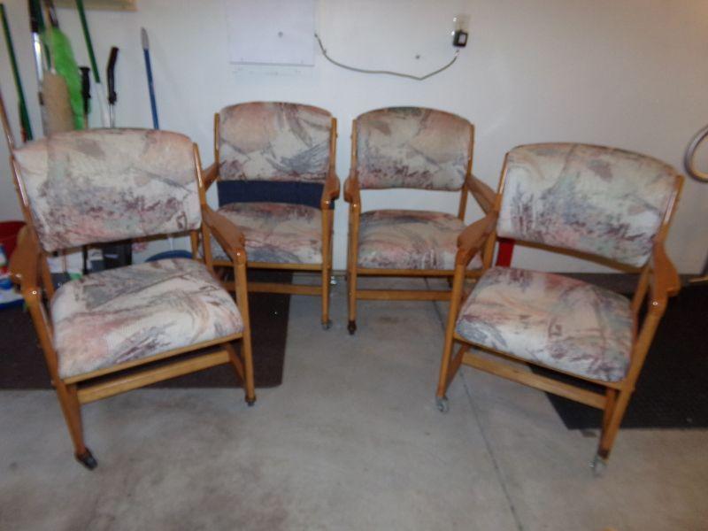 4 UPHOLSTERED DINING CHAIRS WITH WOODEN ARMS AND LEGS ON CASTERS. THEY ARE VERY COMFY AND ROLL SUPER EASILY. NO STAINS ALL IN GREAT SHAPE