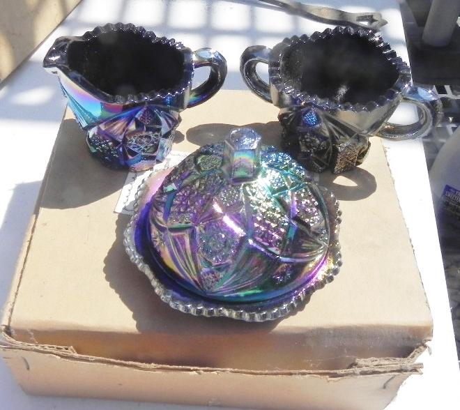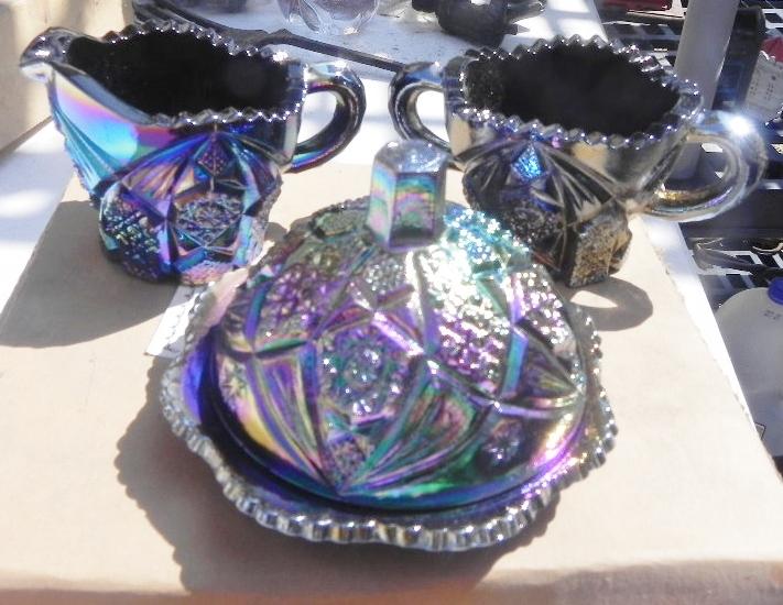 THESE CARNIVAL GLASS PIECES ARE MEANT TO BE USED WITH A CHILD'S TEA SET. VERY GOOD CONDITION