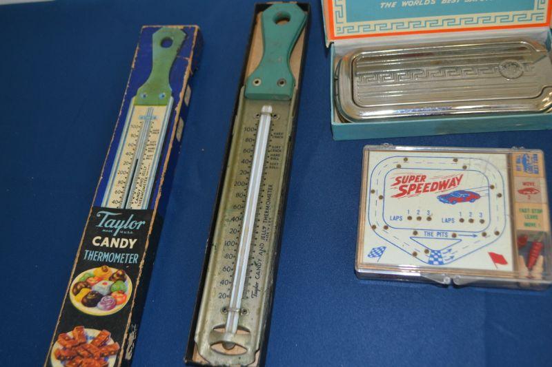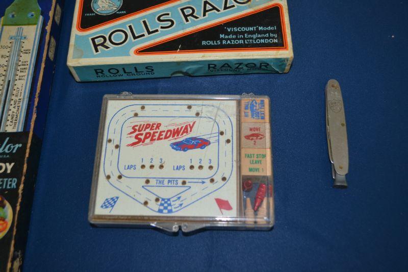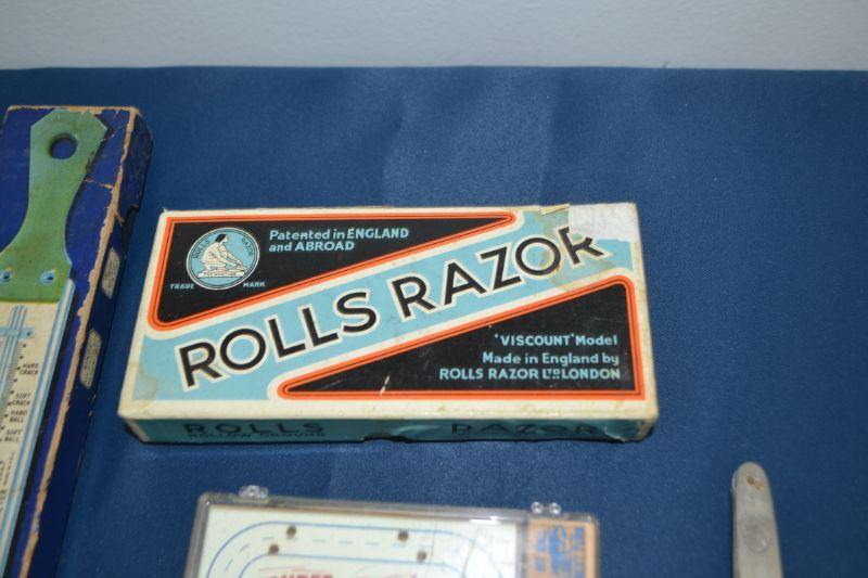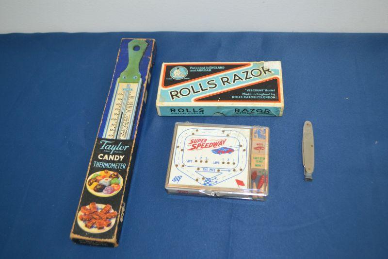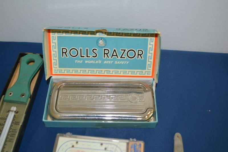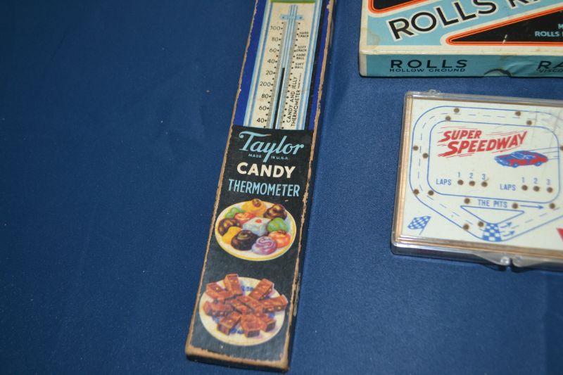 LOT 109 VINTAGE CANDY THERMOMETER, ROLLS RAZOR AND PEG GAME