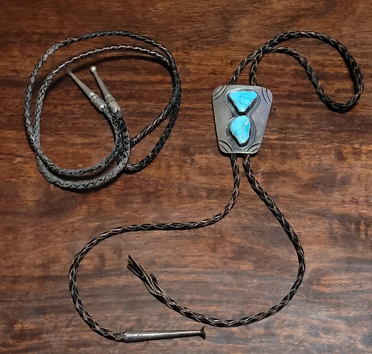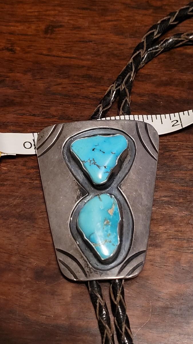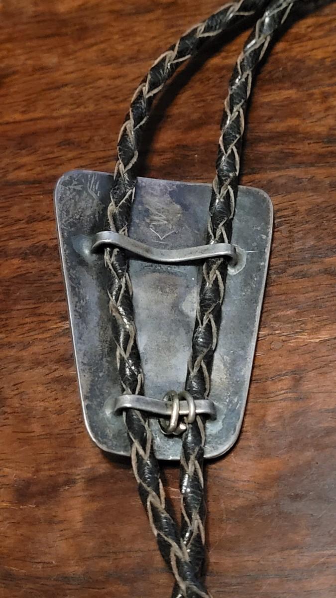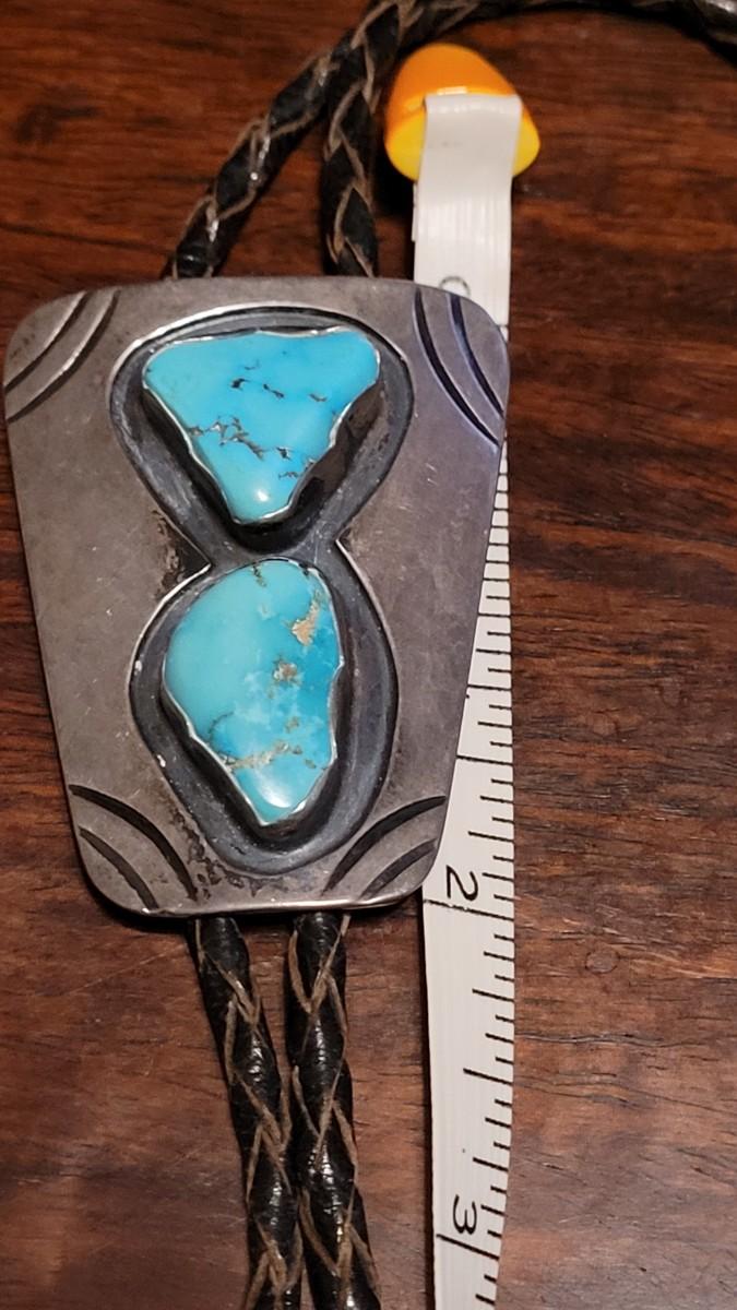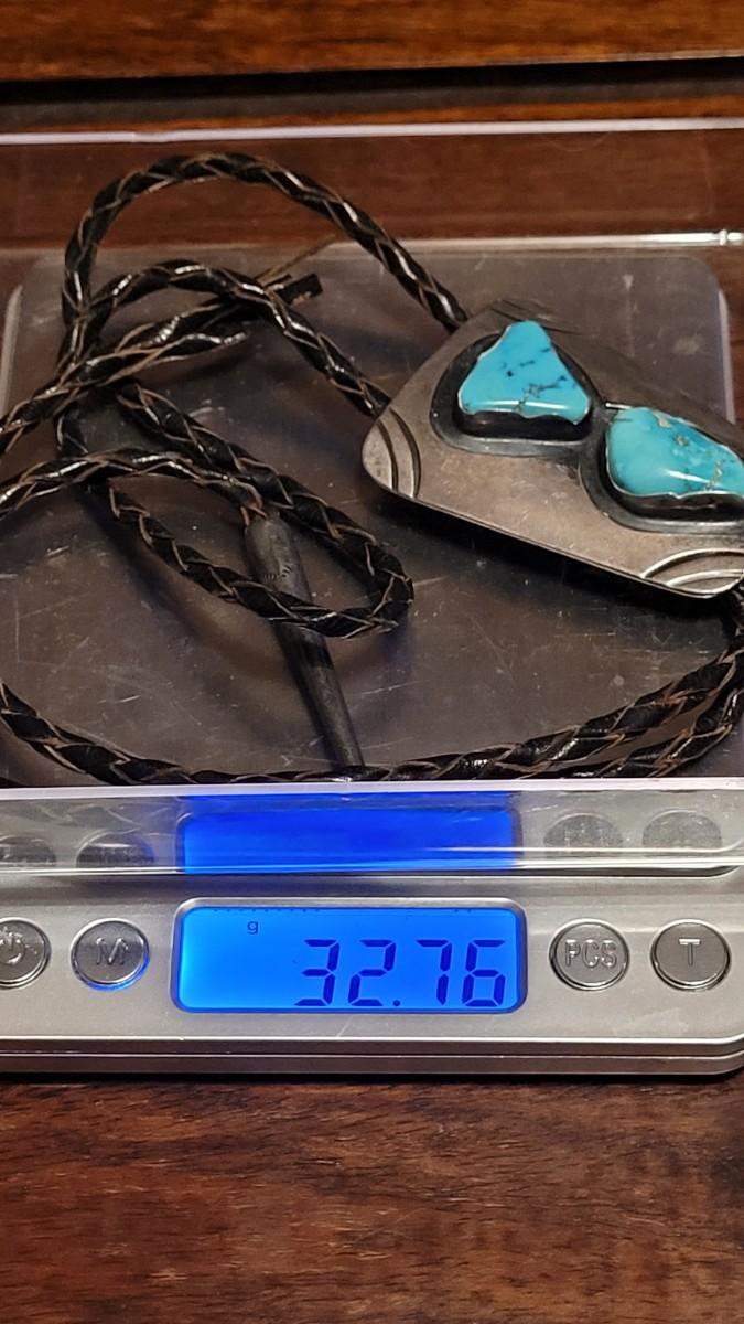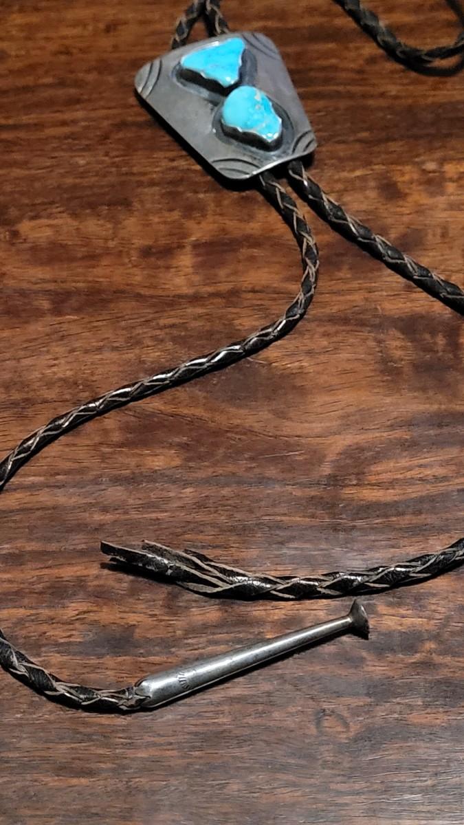 The leather string with the turquoise piece is missing one of the sterling tassel ends. Extra Bolo string included.