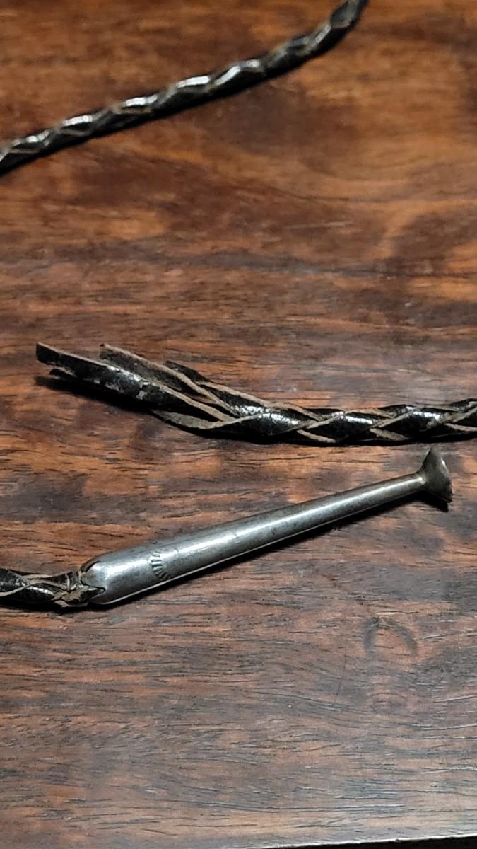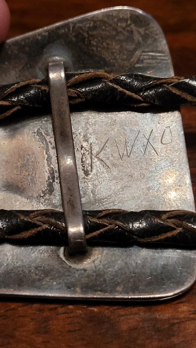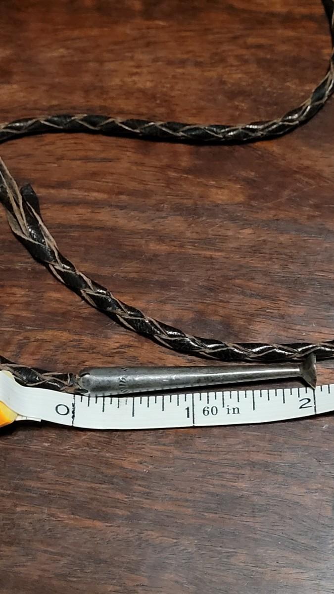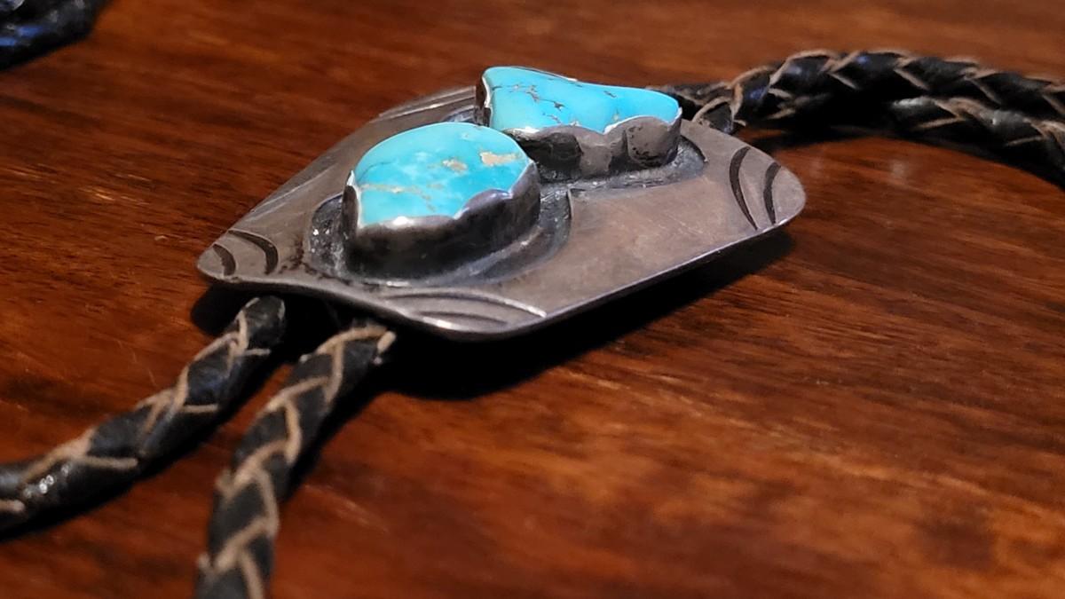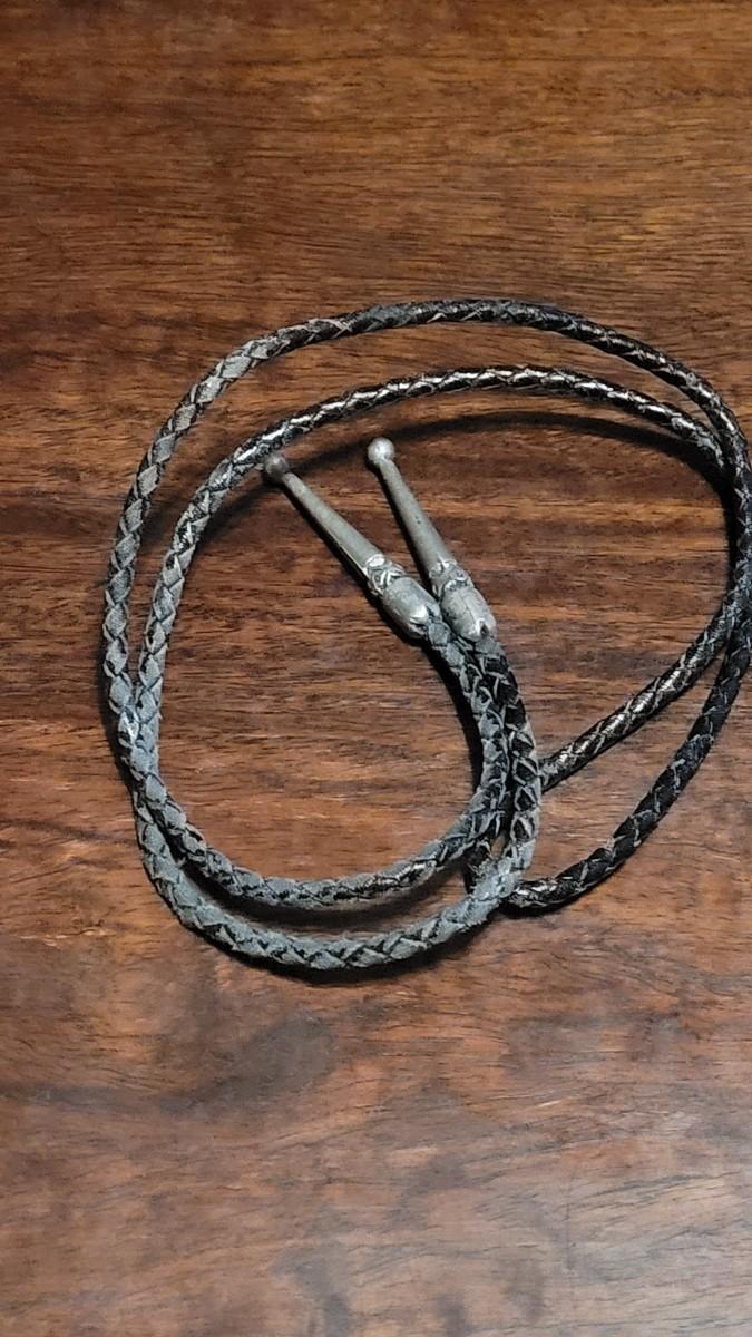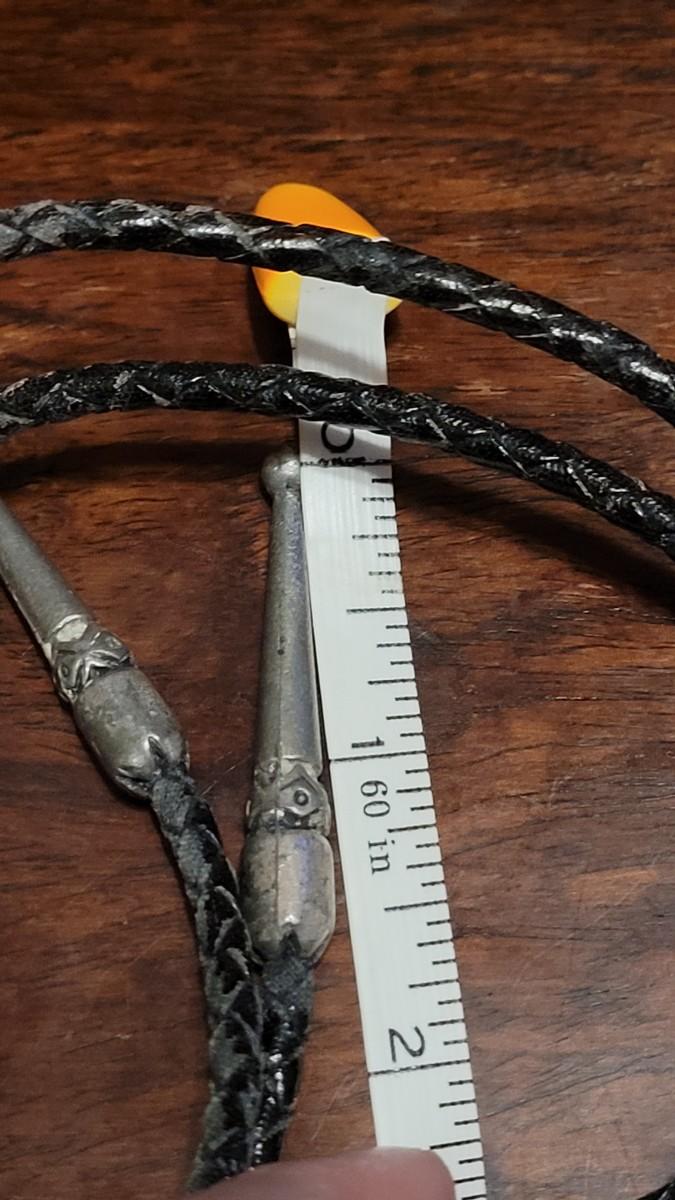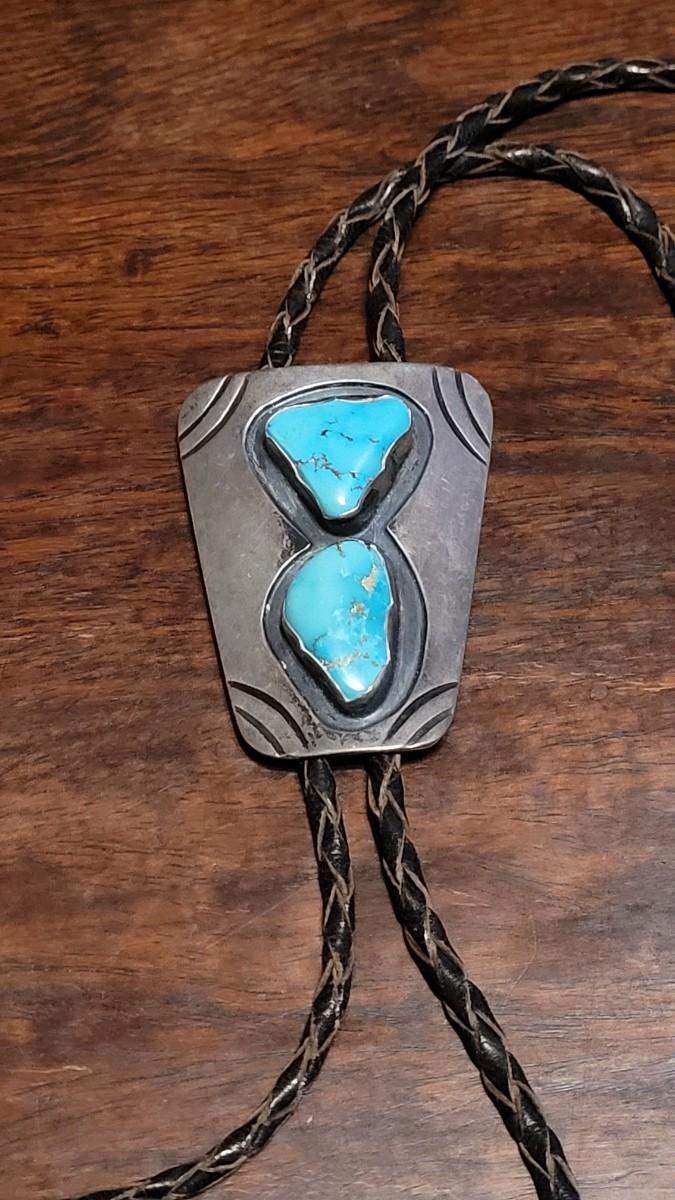 The leather string with the turquoise piece is missing one of the sterling tassel ends. Extra Bolo string included.