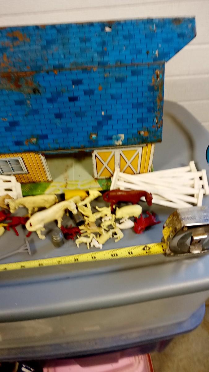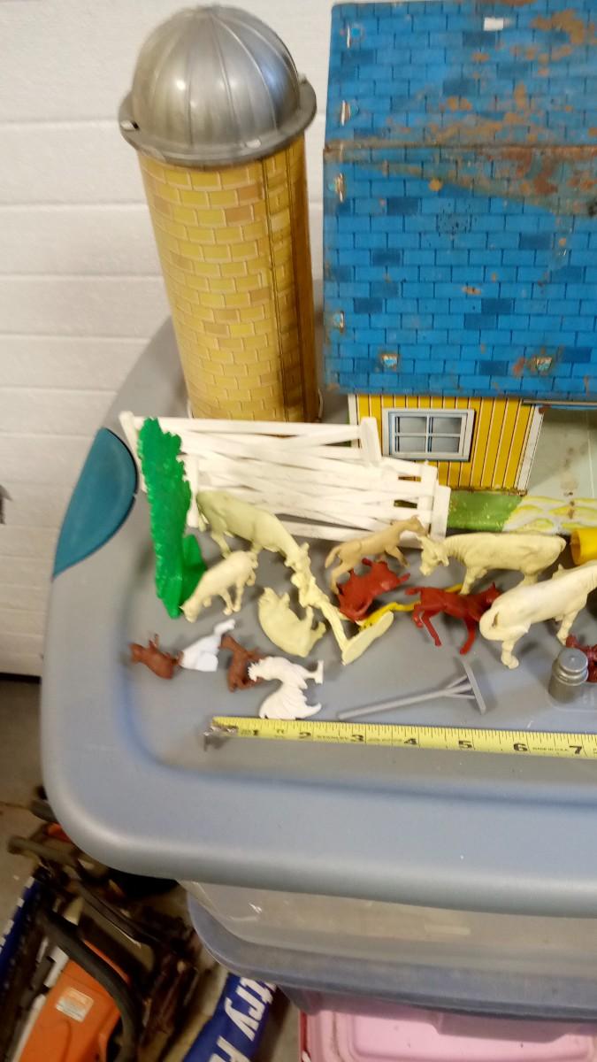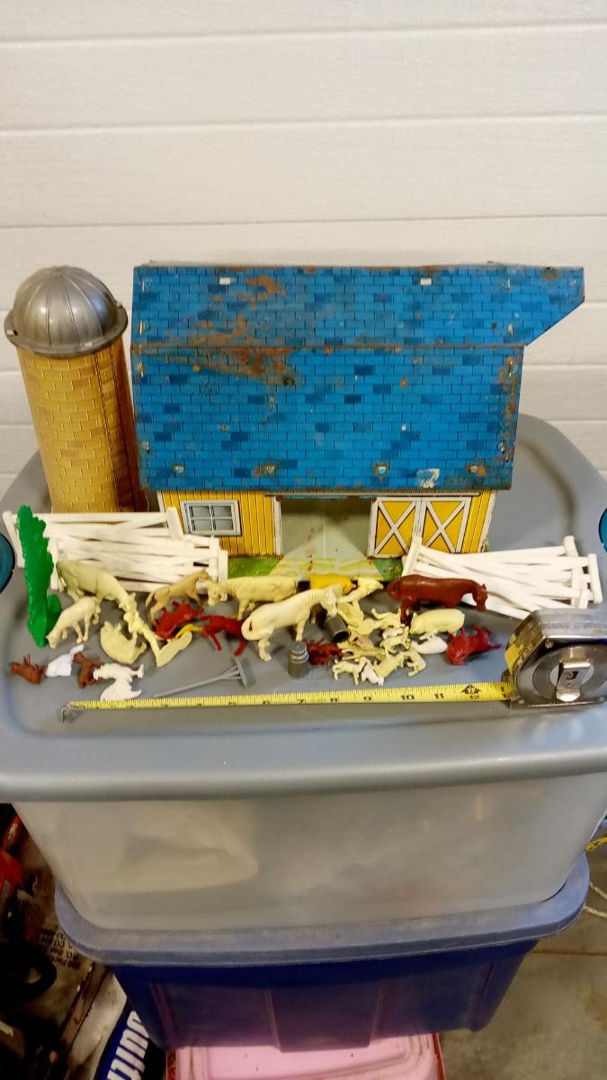 HARD TO FIND BLUE AND YELLOW TIN LITHO BARN WITH MARX ANIMALS FARMERS FENCE