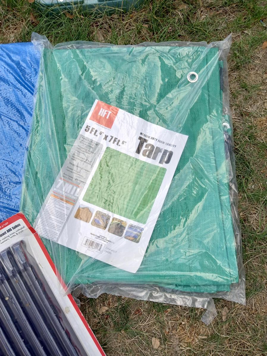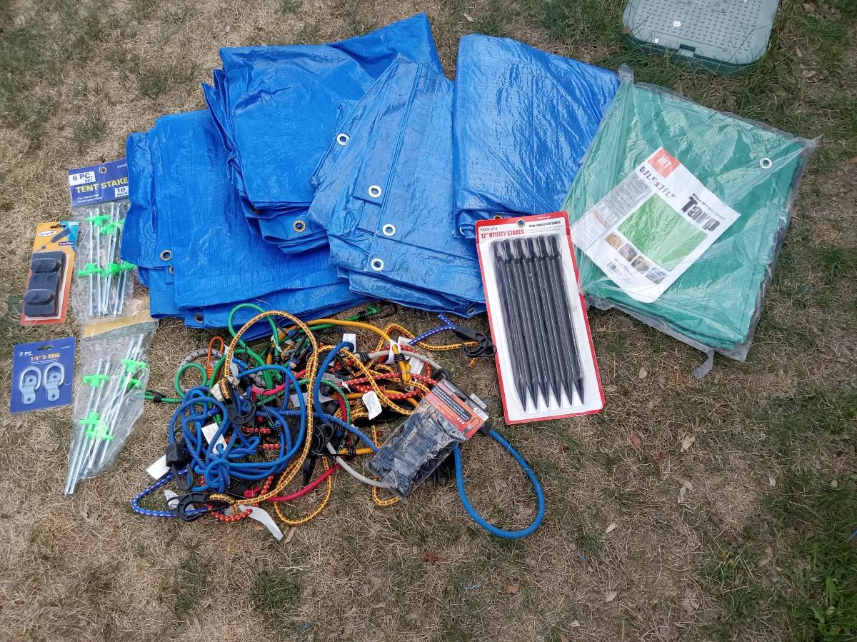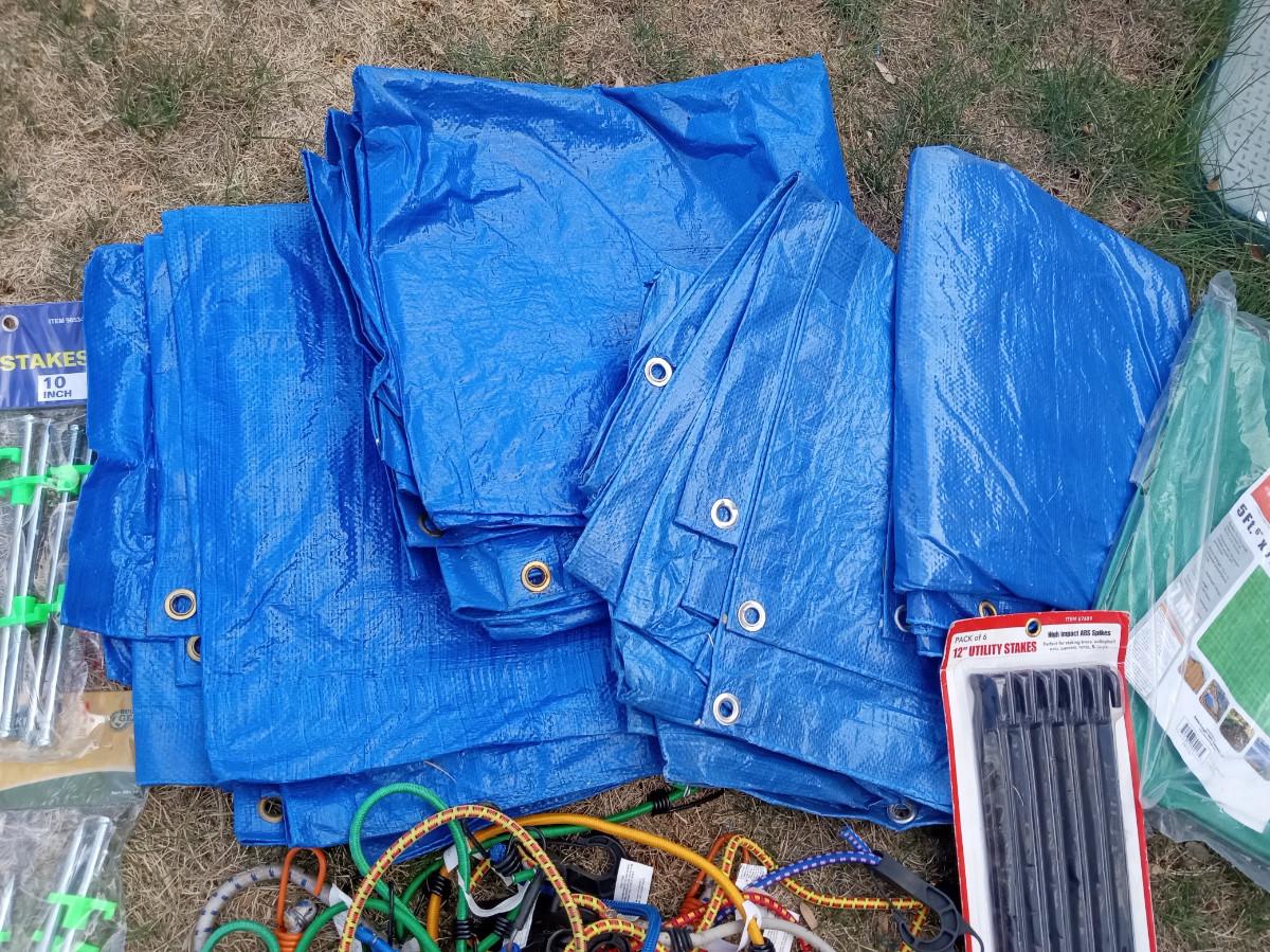 LOT 109  FIVE TARPS, BUNGEE CORDS, STAKES AND MORE