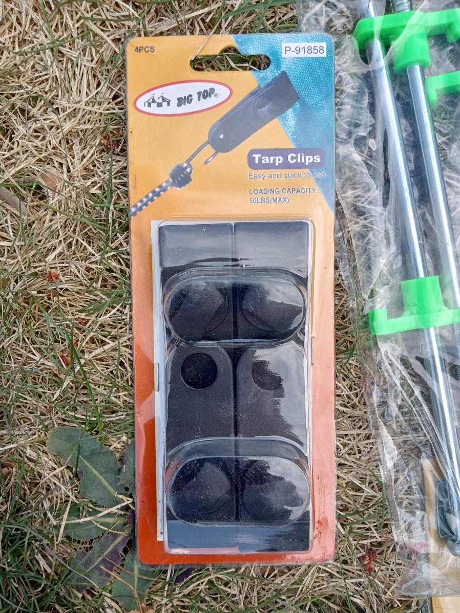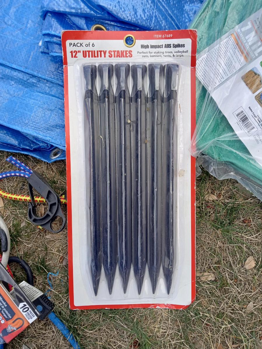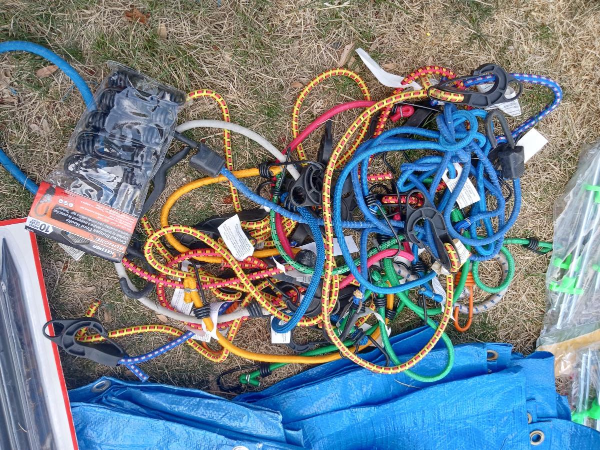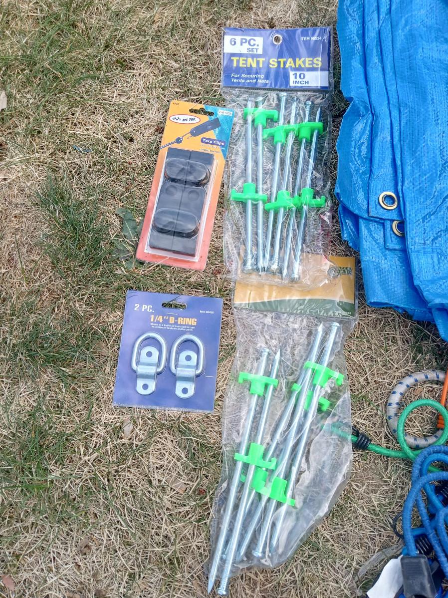 LOT 109  FIVE TARPS, BUNGEE CORDS, STAKES AND MORE