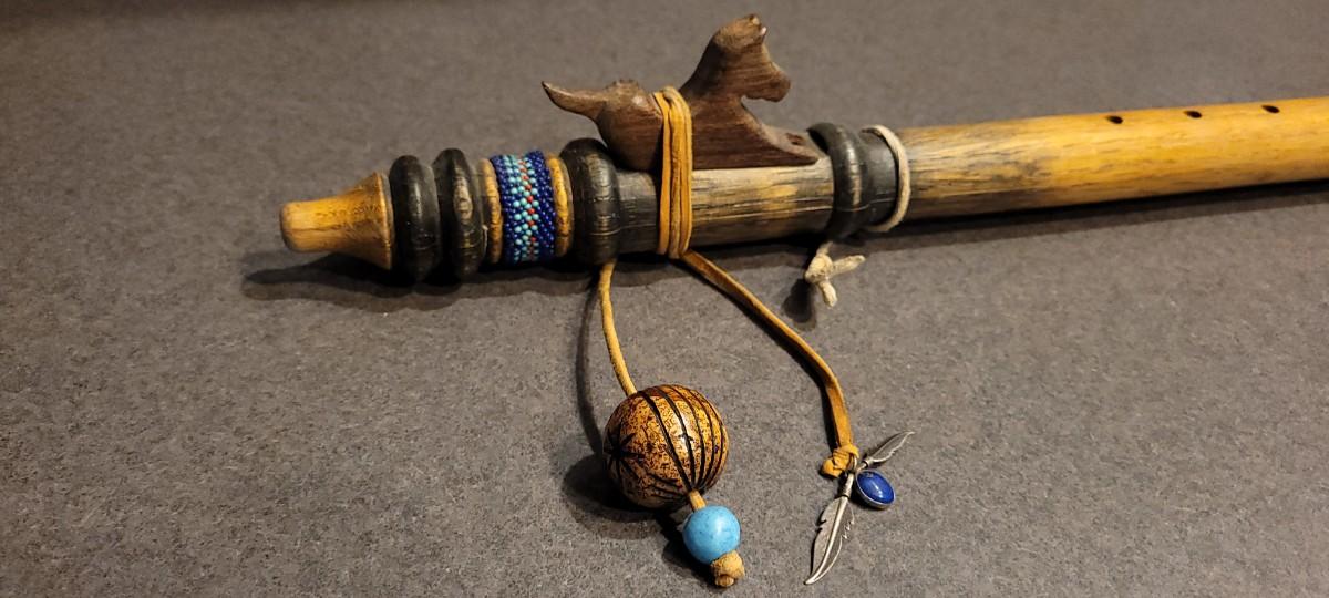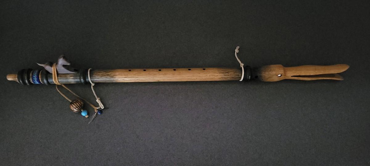 Handmade Native American Style Flute with a Horse on the top and duck or Crane carved end. Very ornate and beautiful. This finely carved flute's design is rare. This is one of the best examples out there!