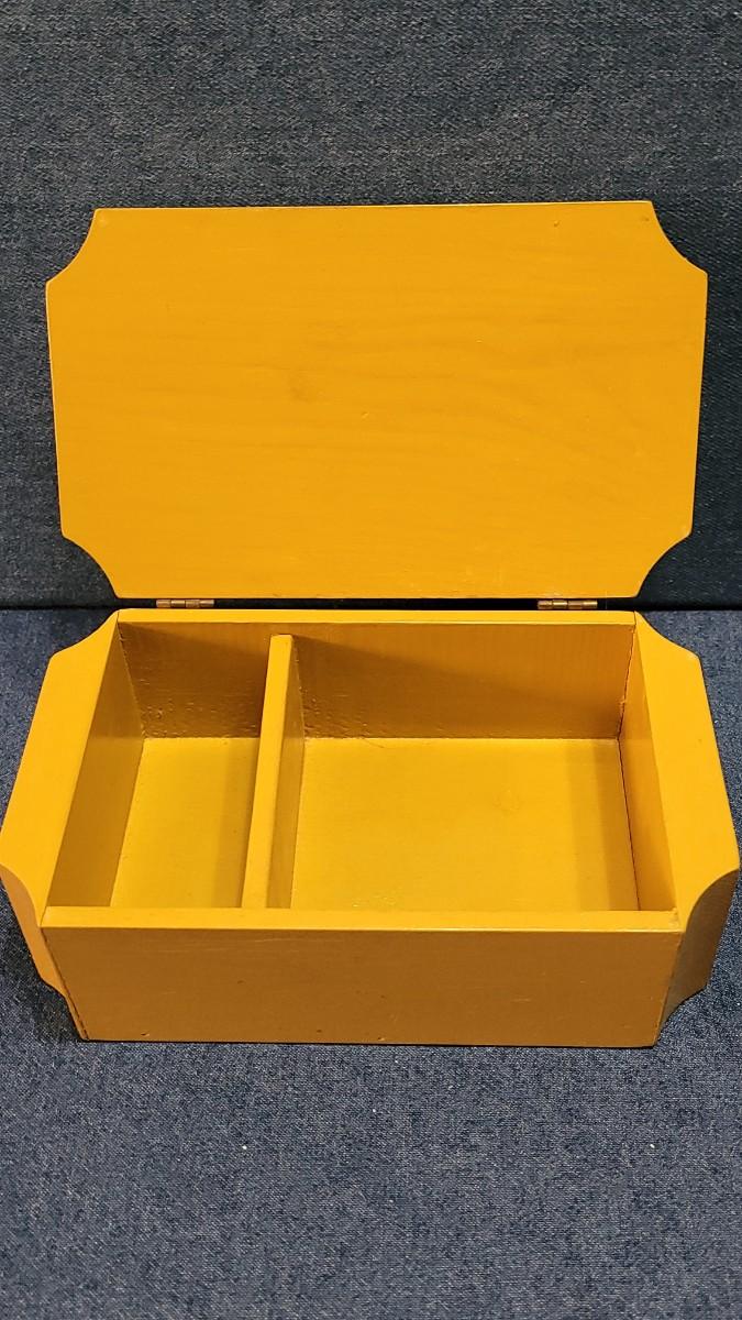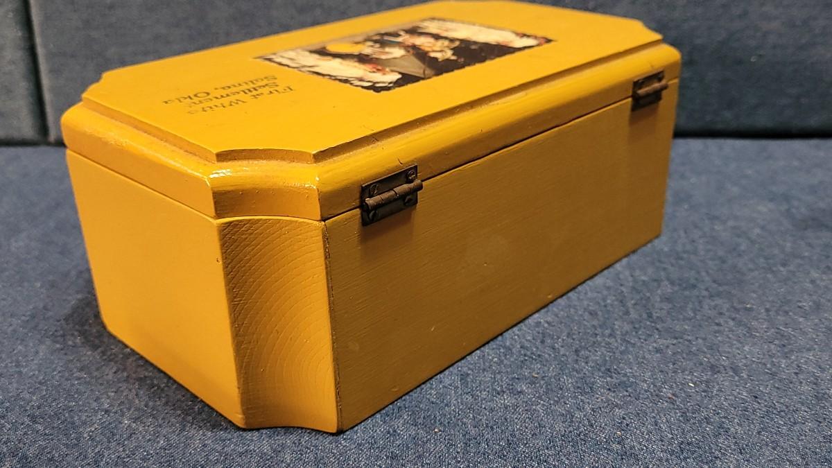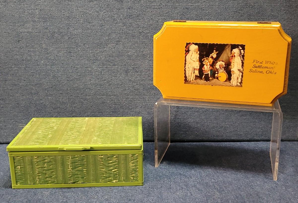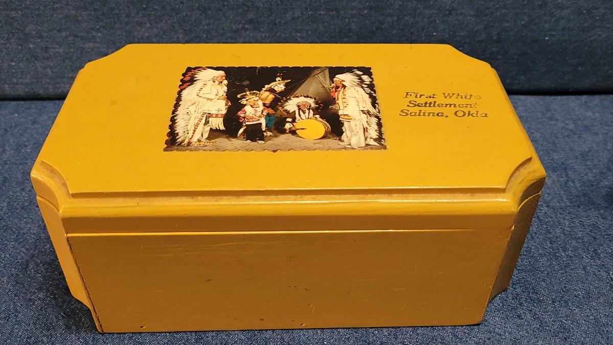 Yellow wood jewelry box with Native American Theme and Metal and Fabric jewelry box