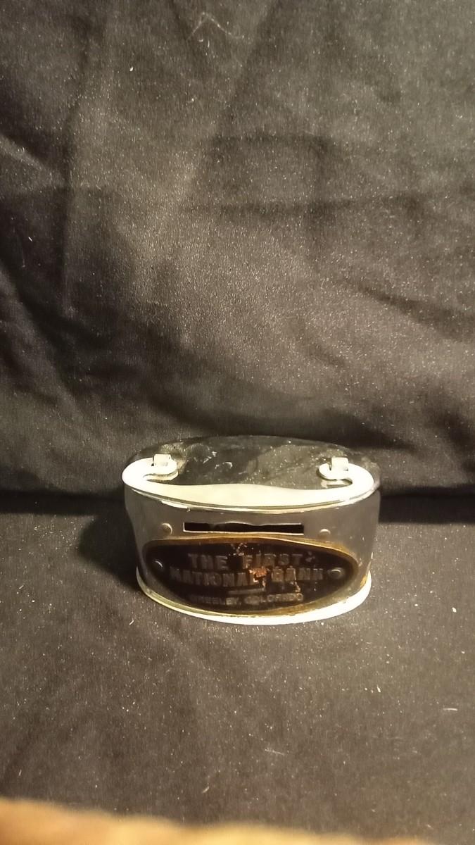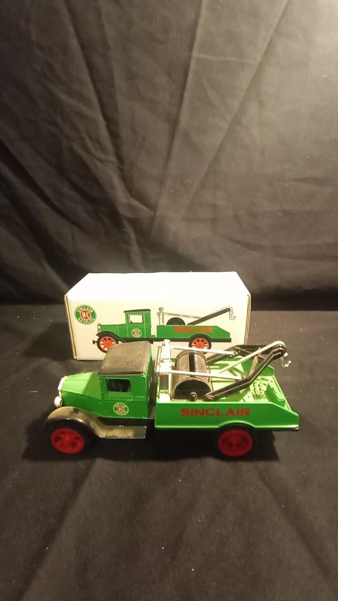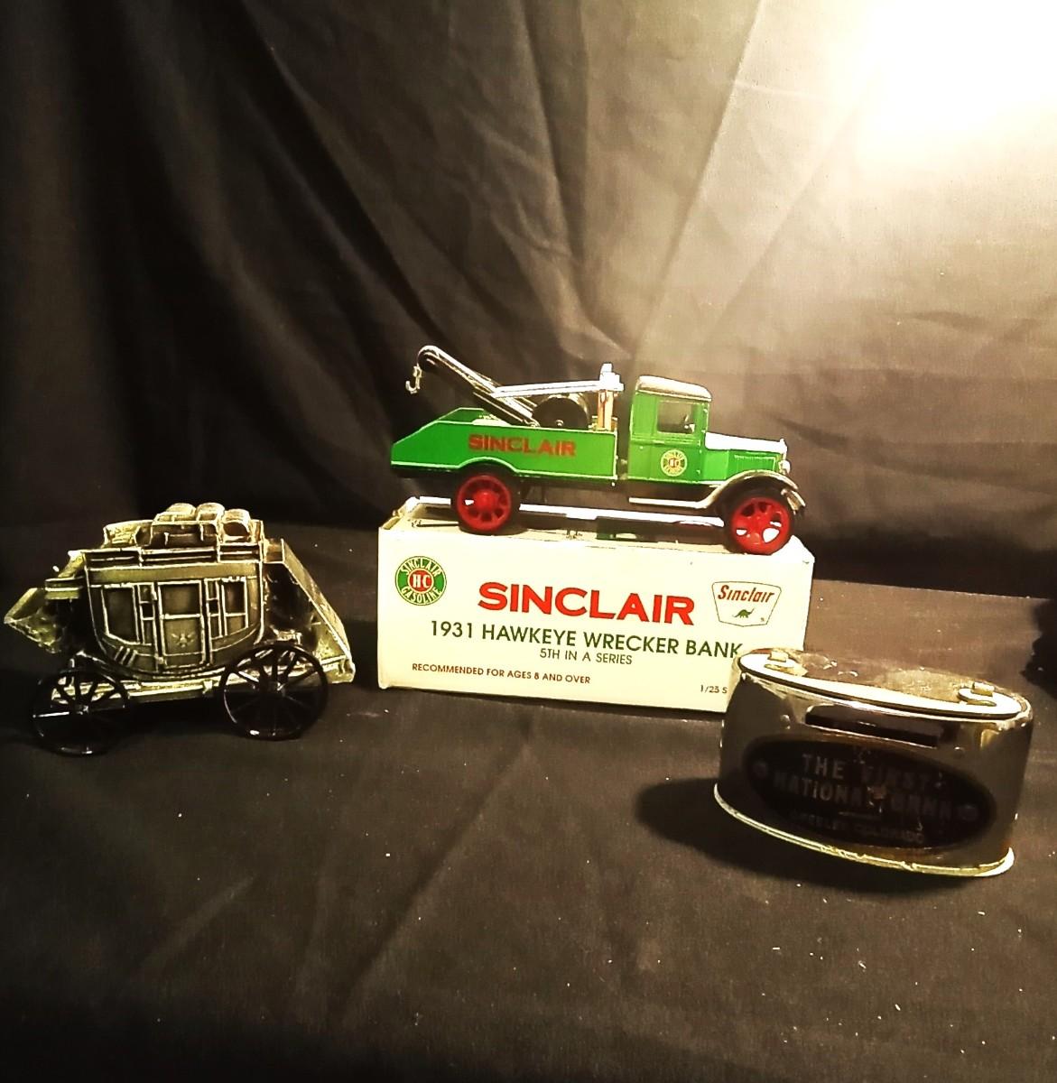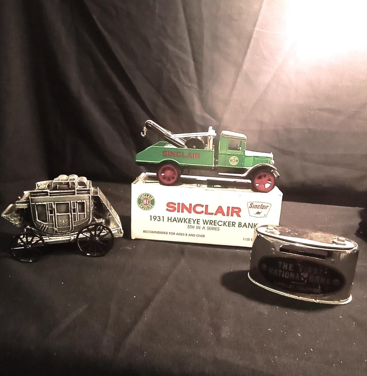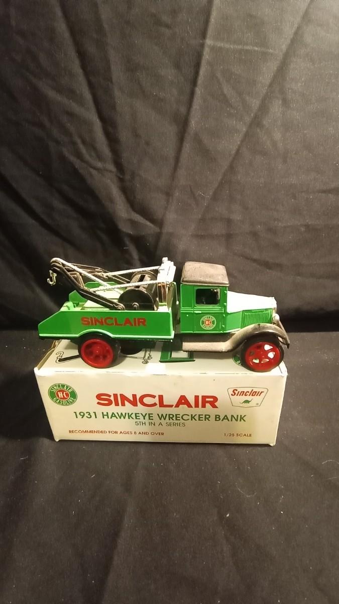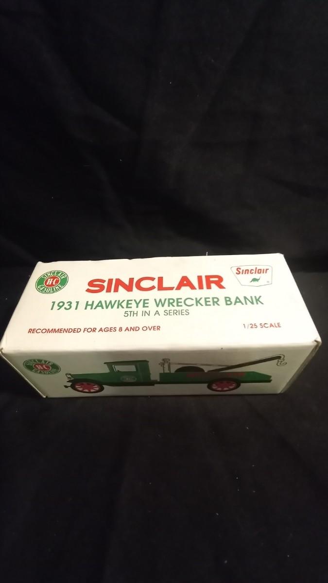 SINCLAIR 1931 HAWKEYE WRECKER BANK WITH ORIGINAL BOX-STAGECOACH AND FIRST NATIONAL BANK
