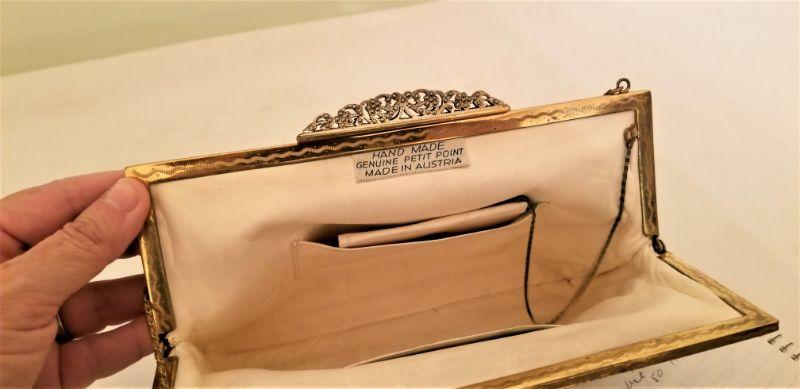 This bag was expensive when it was new and just screams QUALITY. Handmade in Austria - kid leather interior with original mirror and attached change purse. Also, change purse stained by her "lucky (red) bean" - other than that, good. Marcasite (all stones are there) handle. Measure 9" x 6.5", not including handle. Note: the petit point covers the entire bag - even the sides and bottom. The condition of the embroidery is fantastic.