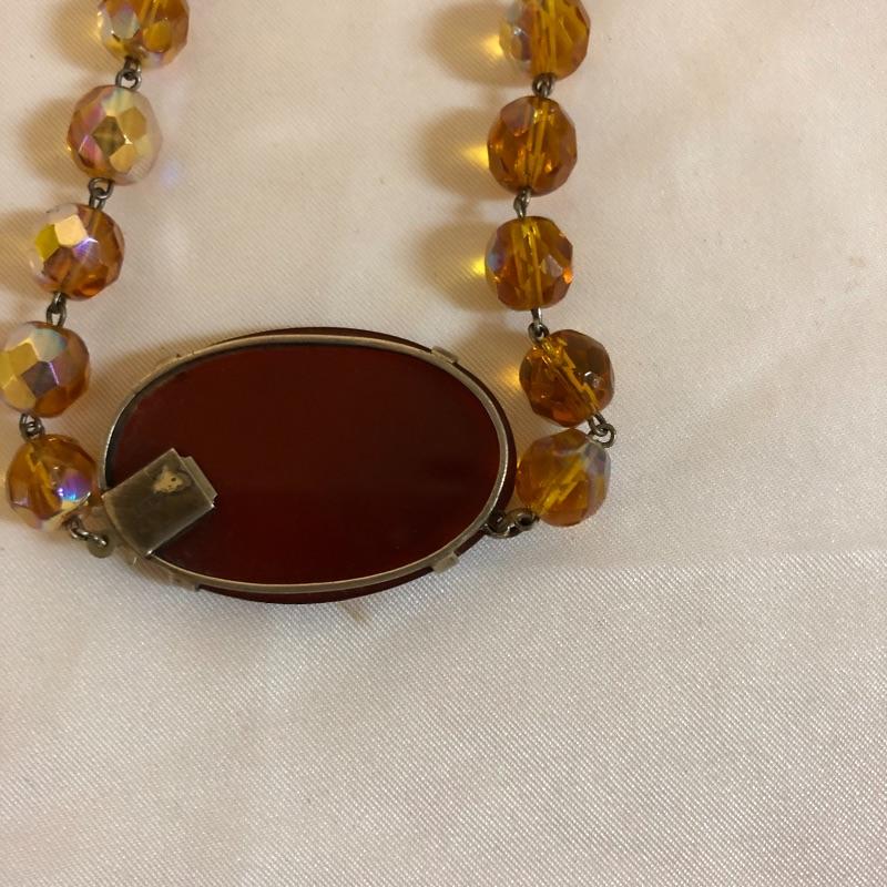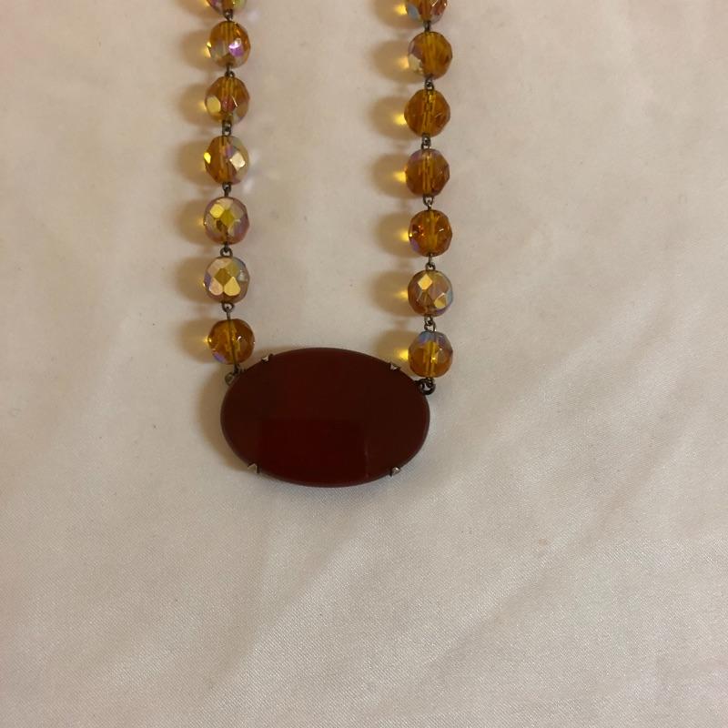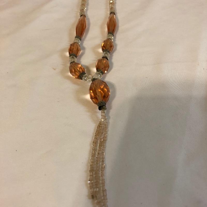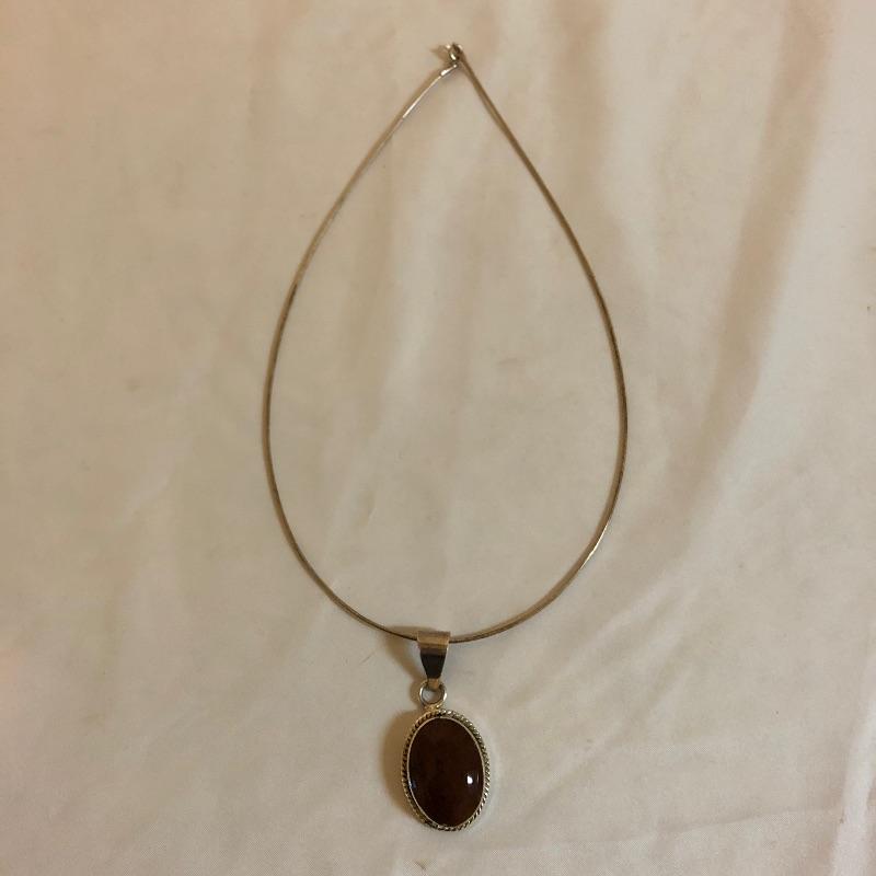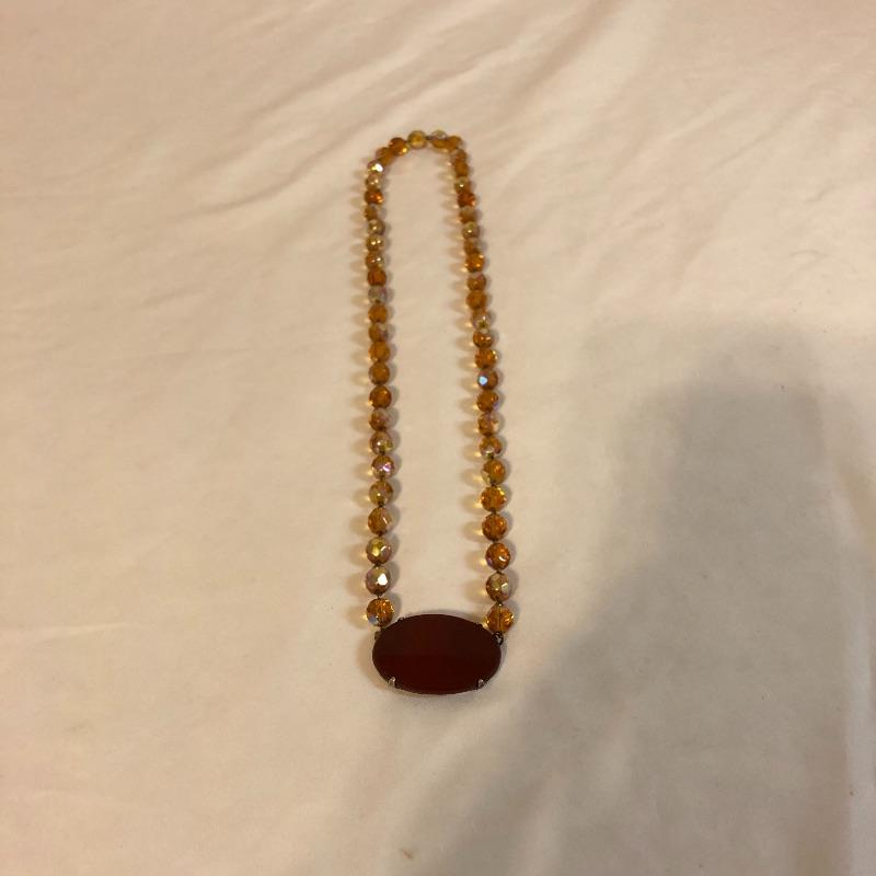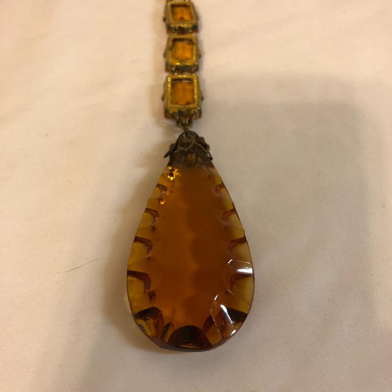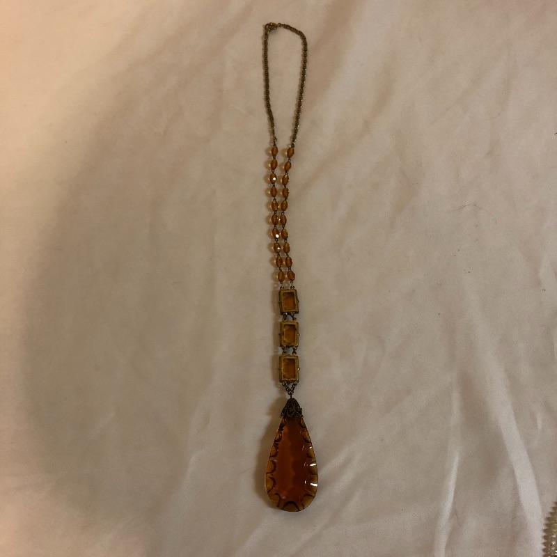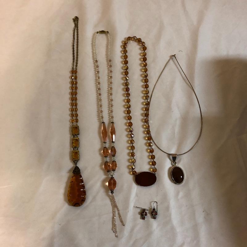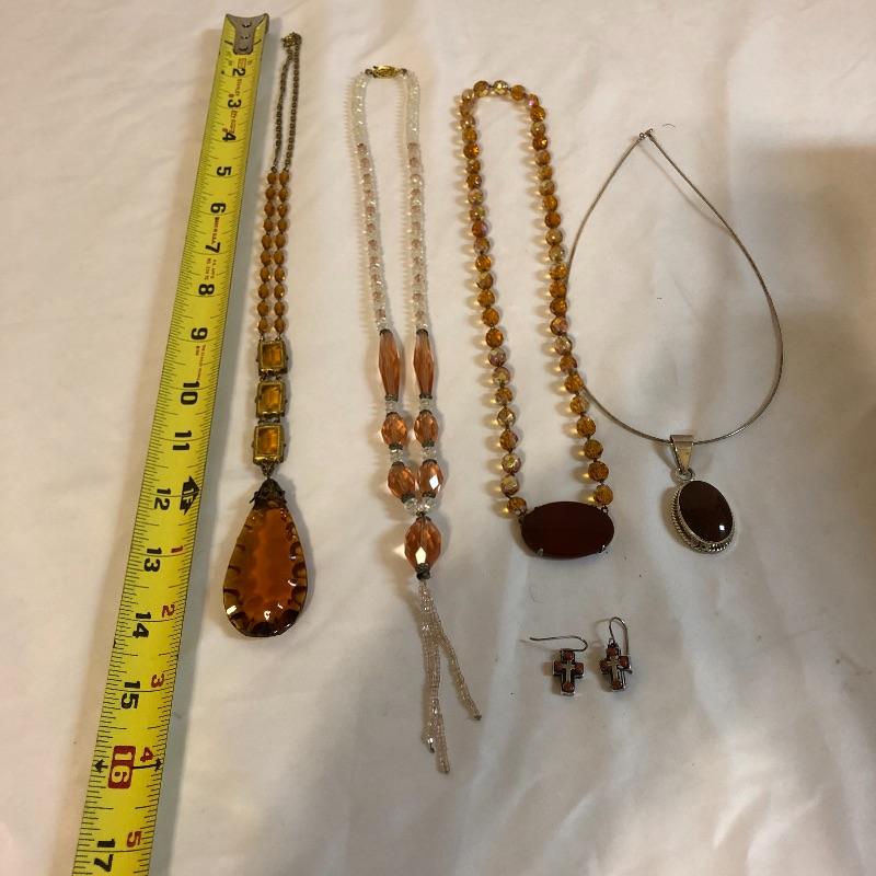 Get in touch with nature with this amber colored array. Lot includes necklace with amber colored stone marked 925 Mexico, cross earrings and three necklaces with amber colored stones that are unmarked.