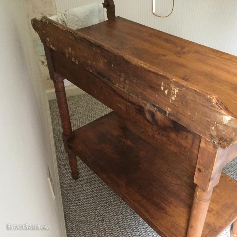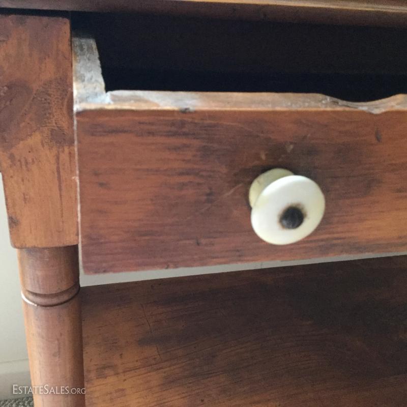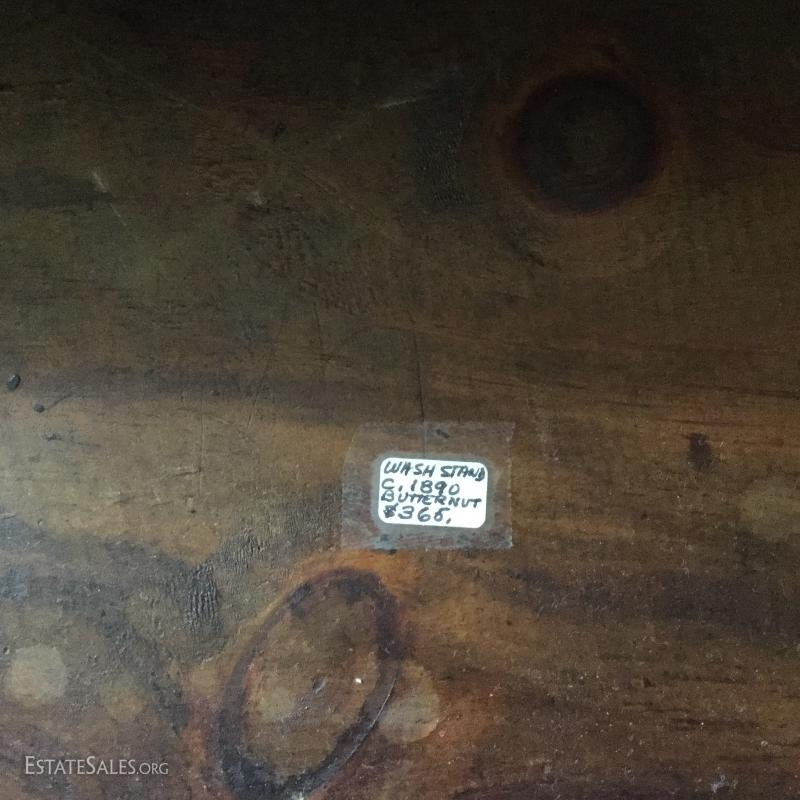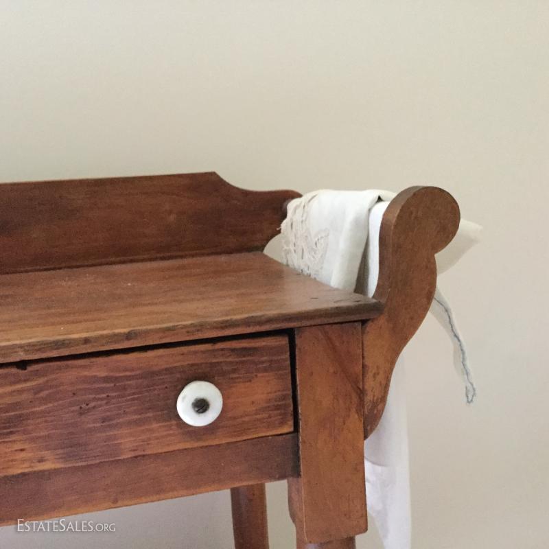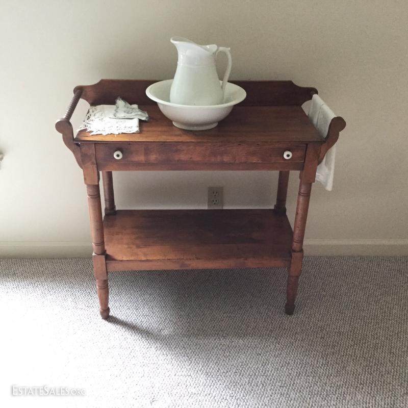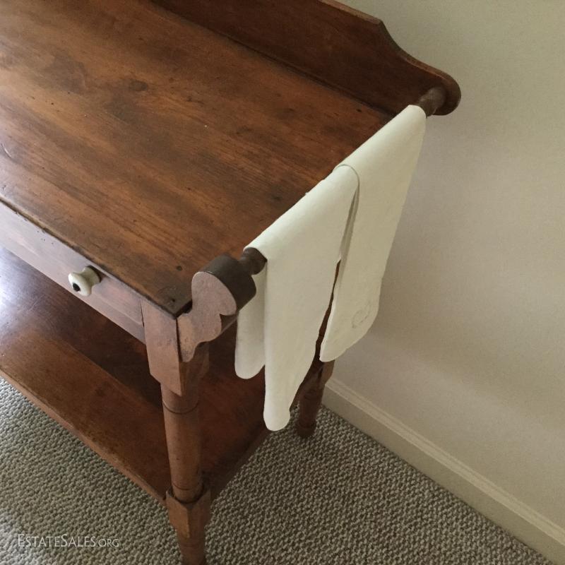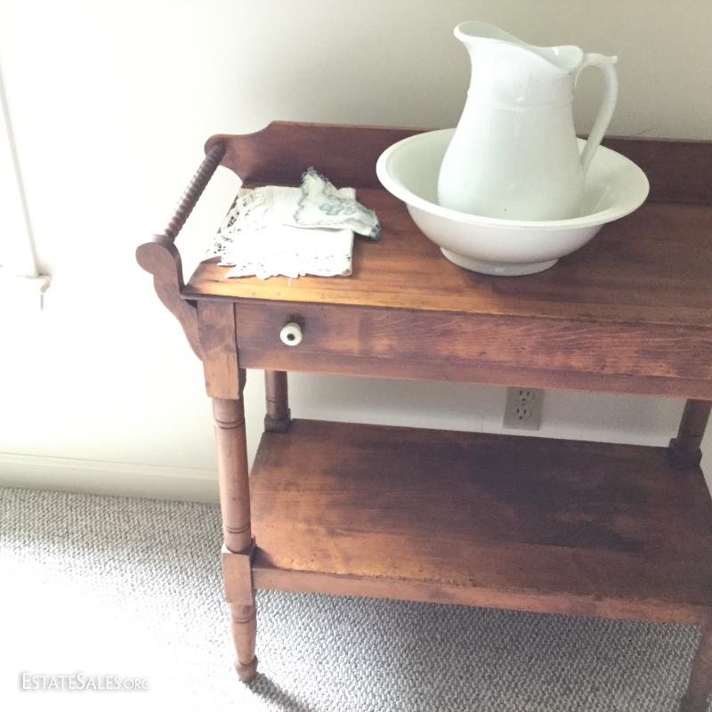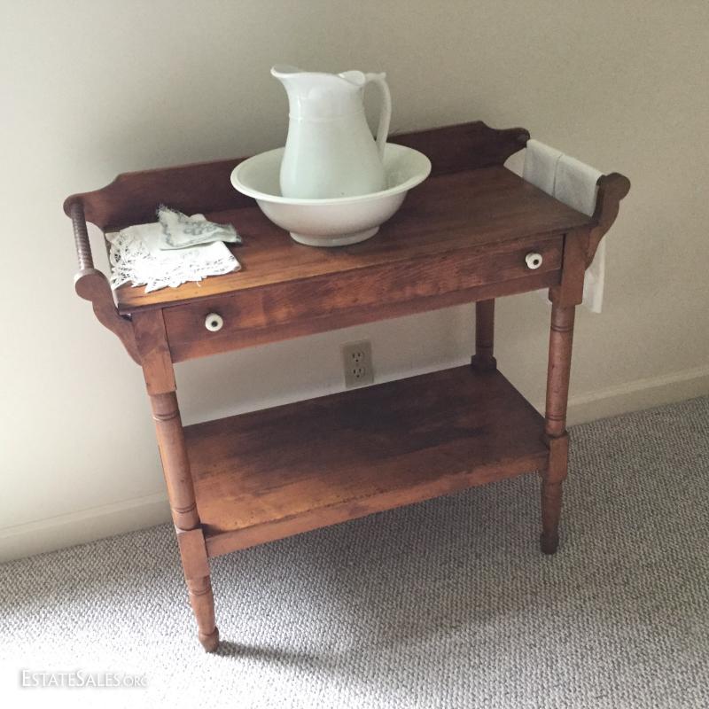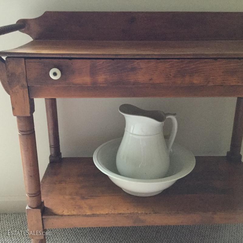 Antique washstand with pitcher. Original purchase sticker inside says "circa 1890 Butternut." 34"l x 14.5"w x 30.5"h. Includes white pitcher and bowl. No marks. Slight crack on side of bowl. Four linen pieces also included.