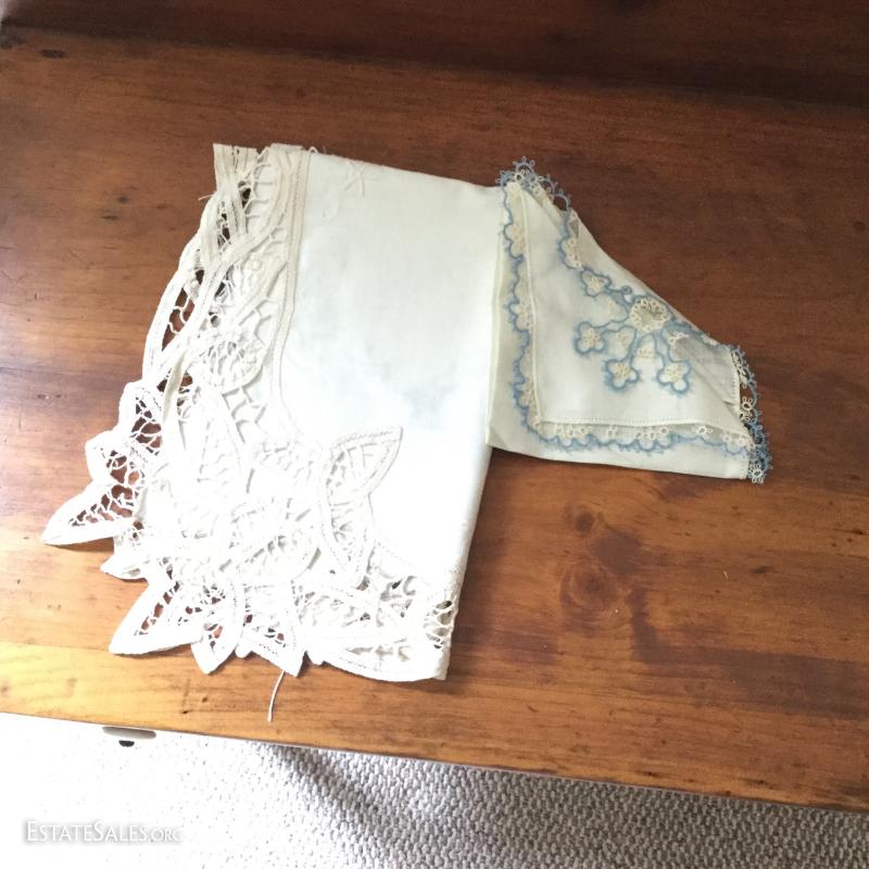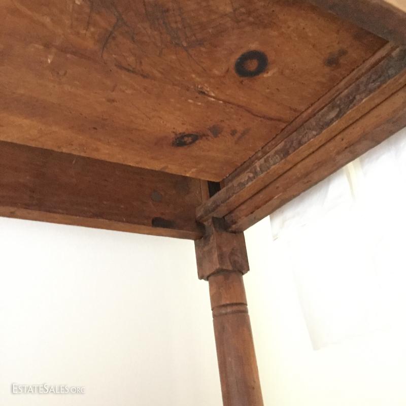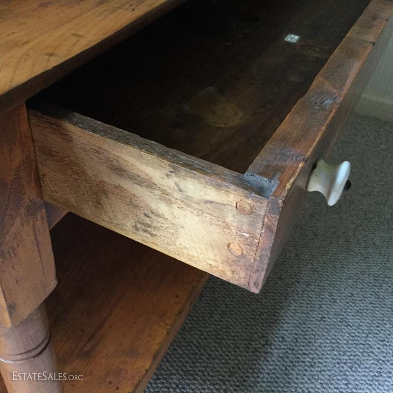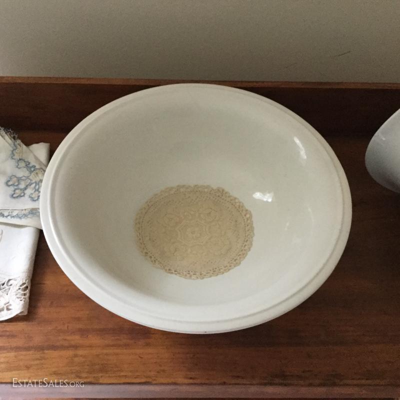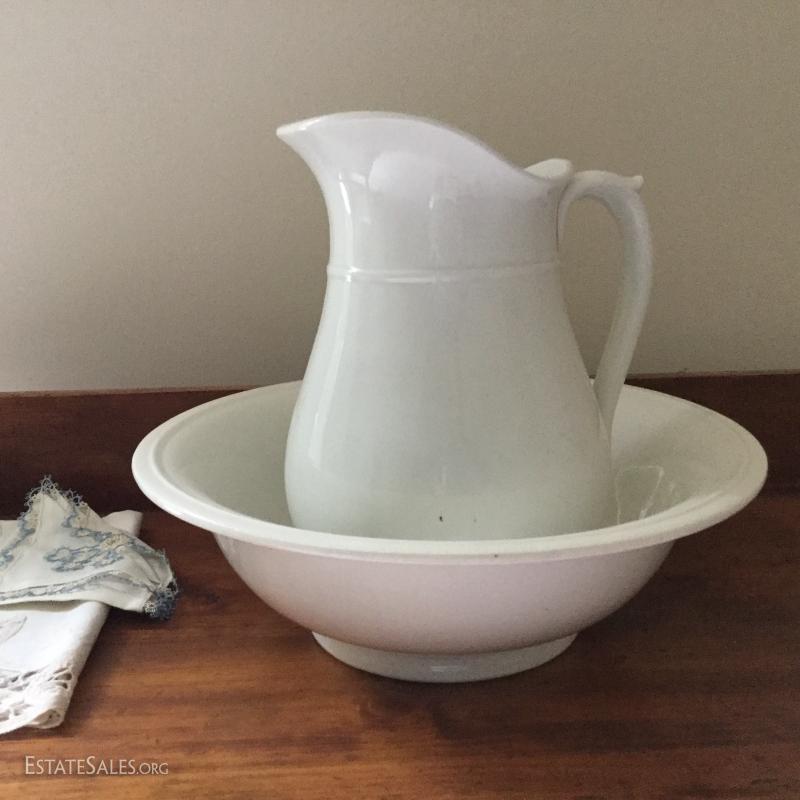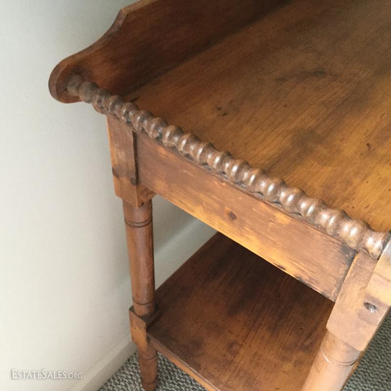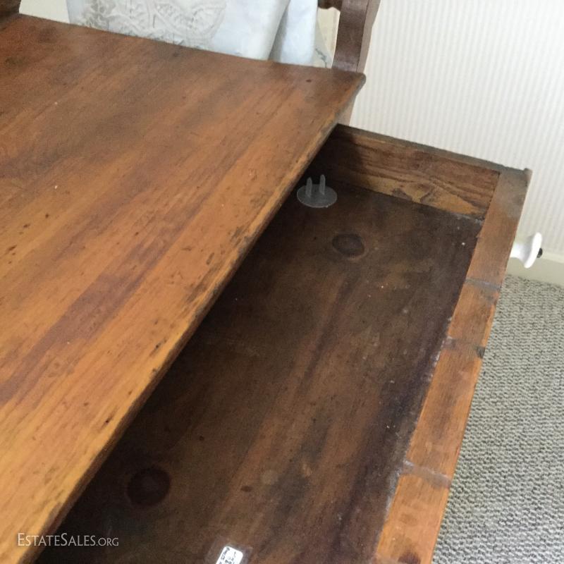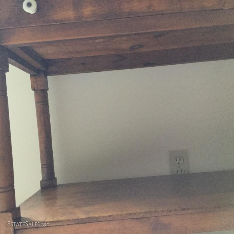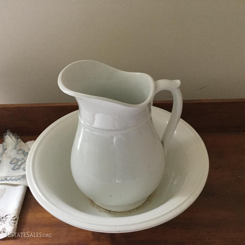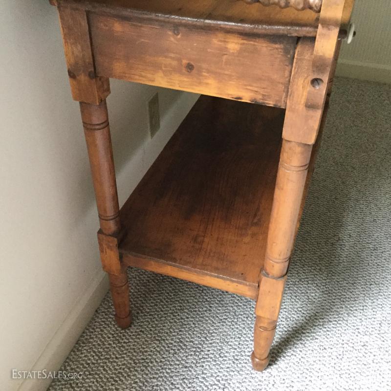 Antique washstand with pitcher. Original purchase sticker inside says "circa 1890 Butternut." 34"l x 14.5"w x 30.5"h. Includes white pitcher and bowl. No marks. Slight crack on side of bowl. Four linen pieces also included.