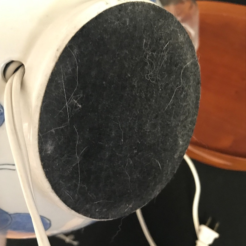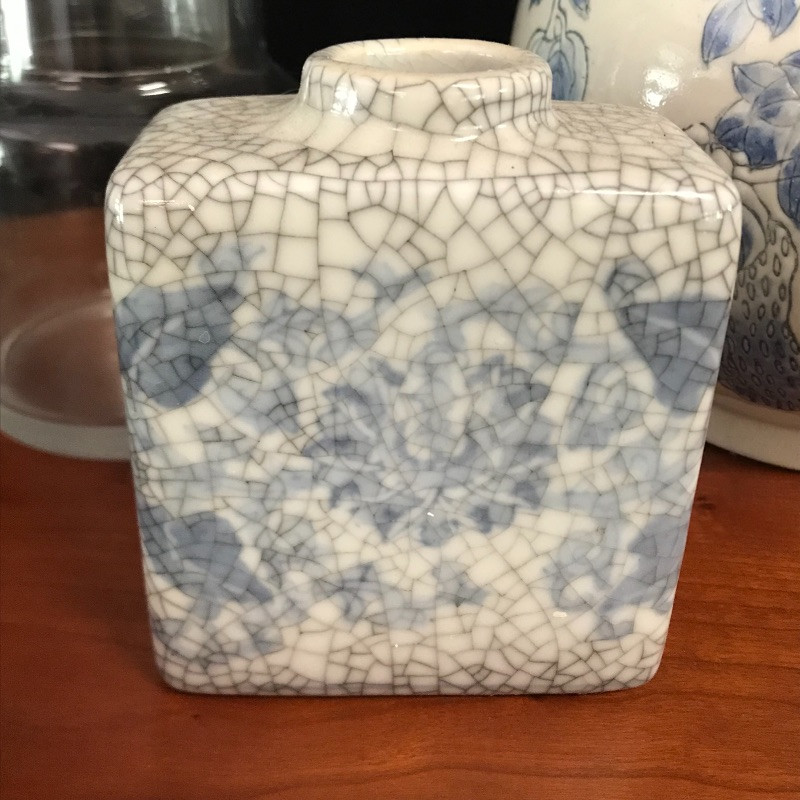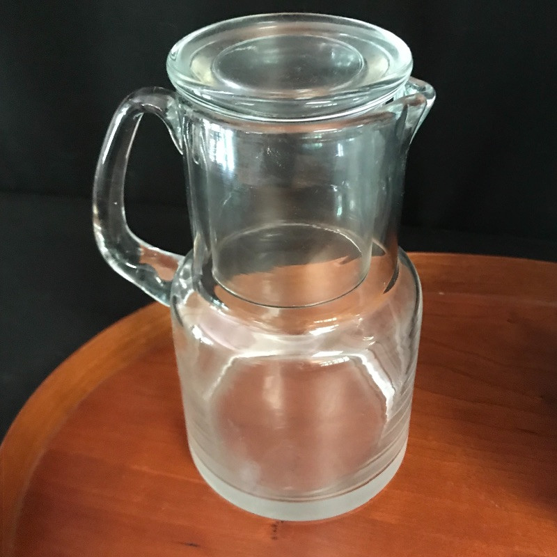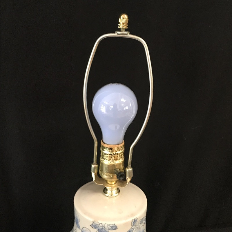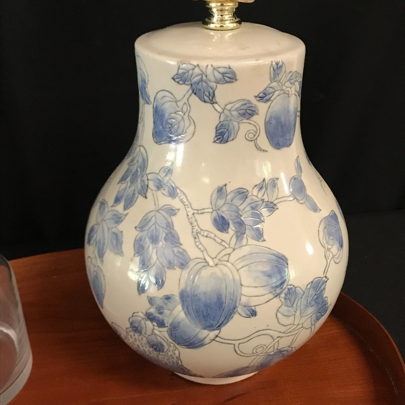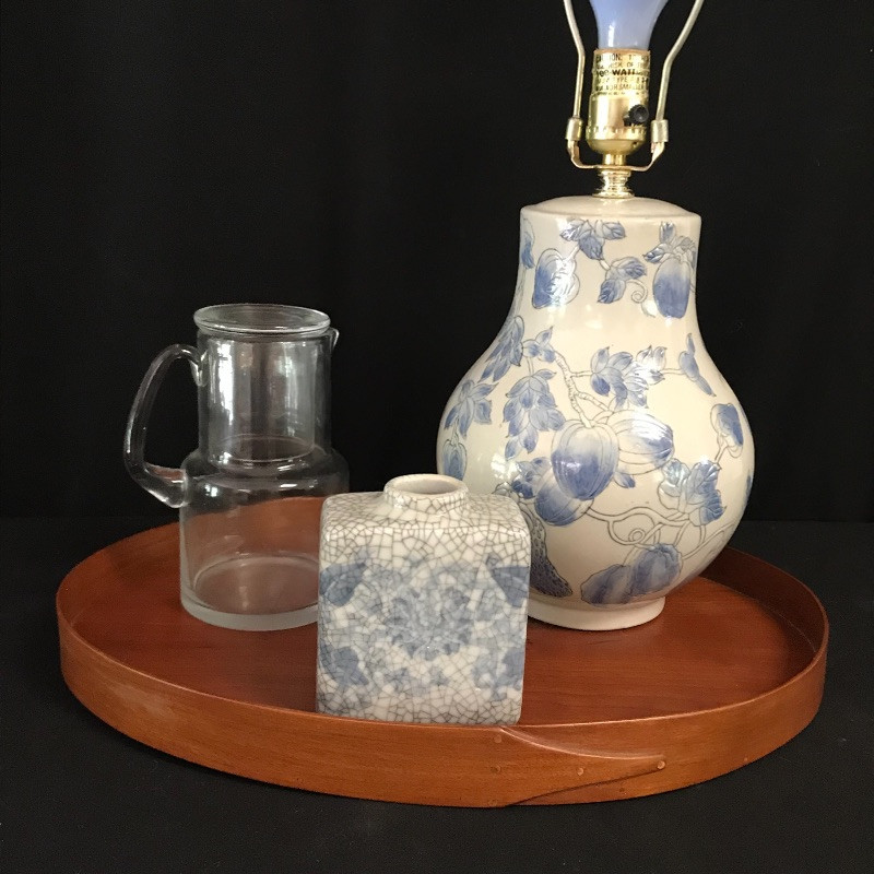 Lot includes four pieces to make your waking and dozing extra pleasant. Adorn your bedside table with this gorgeous oval wooden tray, cream and blue lamp and vase, and unique glass water pitcher with inverted drinking glass for lid. Lamp is approx. 20” tall. Tray is approx. 17.5” long. See pics. Shipping available.