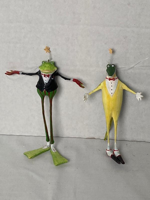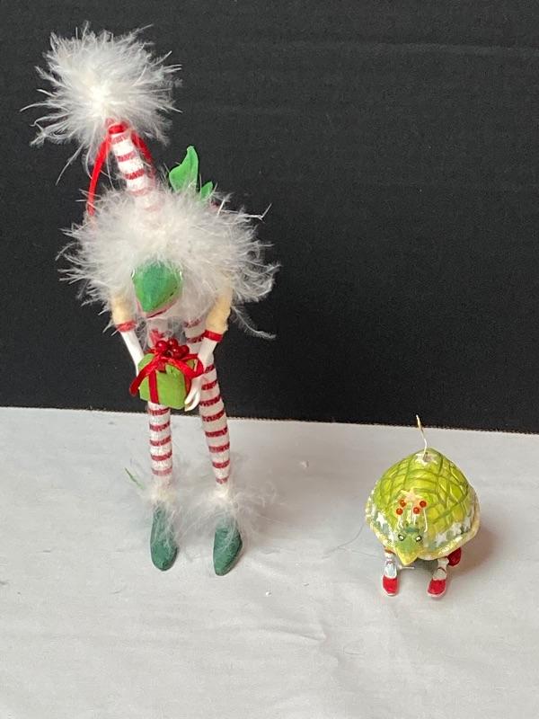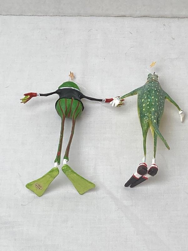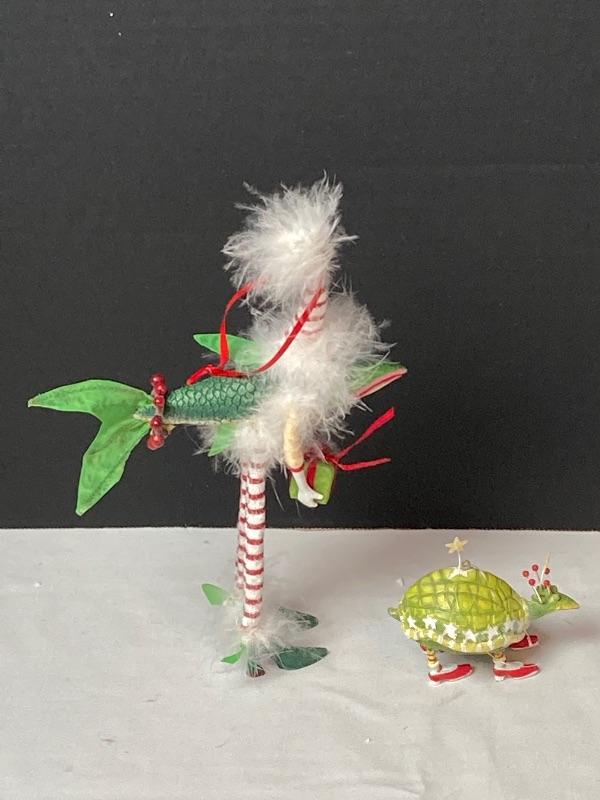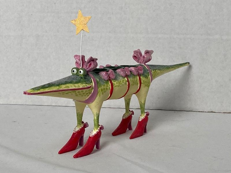 Patience Brewster Christmas Krinkles Alligator candle holder, holds three taper candles (candles included) and measures 15” long and 7-1/2” tall. Green Lizard ornament 7”, Turtle ornament 3”, Krinkles Critter ornament 9” and Frog ornament 7”. All items have original boxes except frog ornament